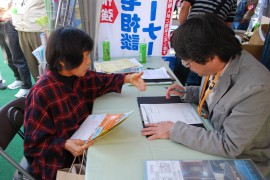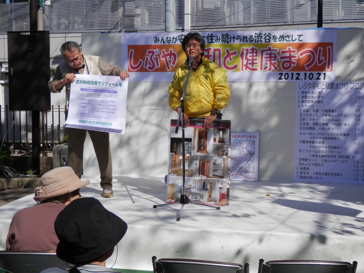 10月21日第6回「しぶや平和と健康まつり」恒例とな幡ヶ谷六号通り坂上公園かメイン会場に開催、昨年を上回る1,700人が来場しました。 反原発トークも開かれ、土建は新たなとりくみとして、地域住民にも耳寄りで私たちのしごとおこしにもつながる渋谷区の住宅改修助成制度普及のためのアピールを、パネルや実例を交え行いました。また、工作教室、包丁・まな板削り、無料住宅相談会、玉こんにゃく、焼肉、昔遊びが好評でした。