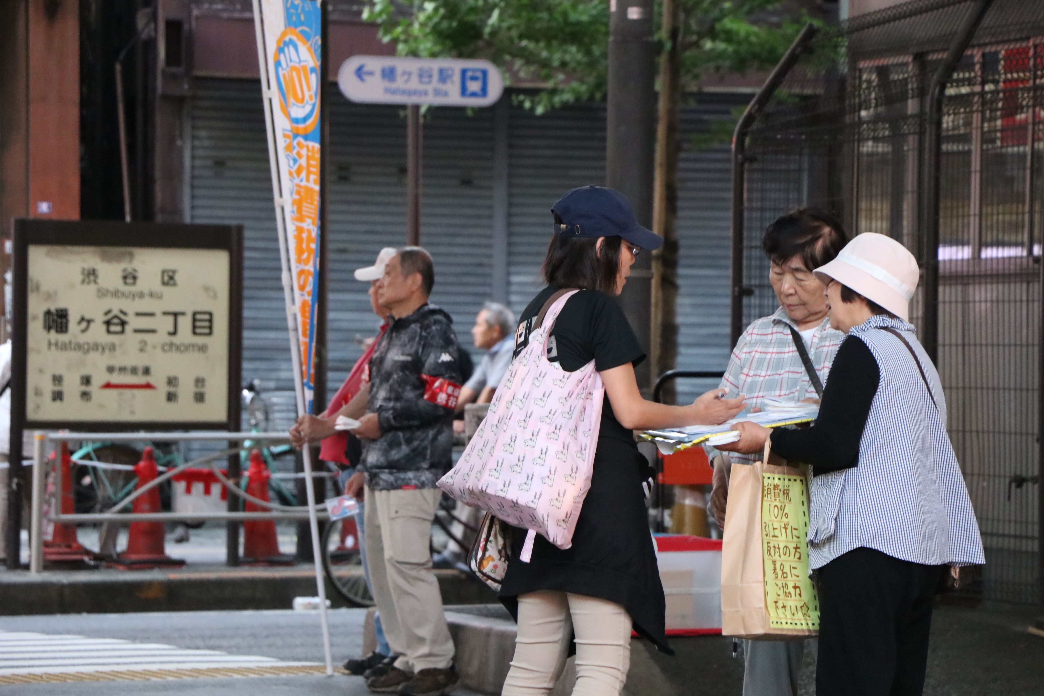 仕事帰りの方や買い物をする方が行きかう夕暮れ時、幡ヶ谷駅前に18人の仲間が集まり、前回同様たくさんの消費税増税中止を求める請願署名を集めました。