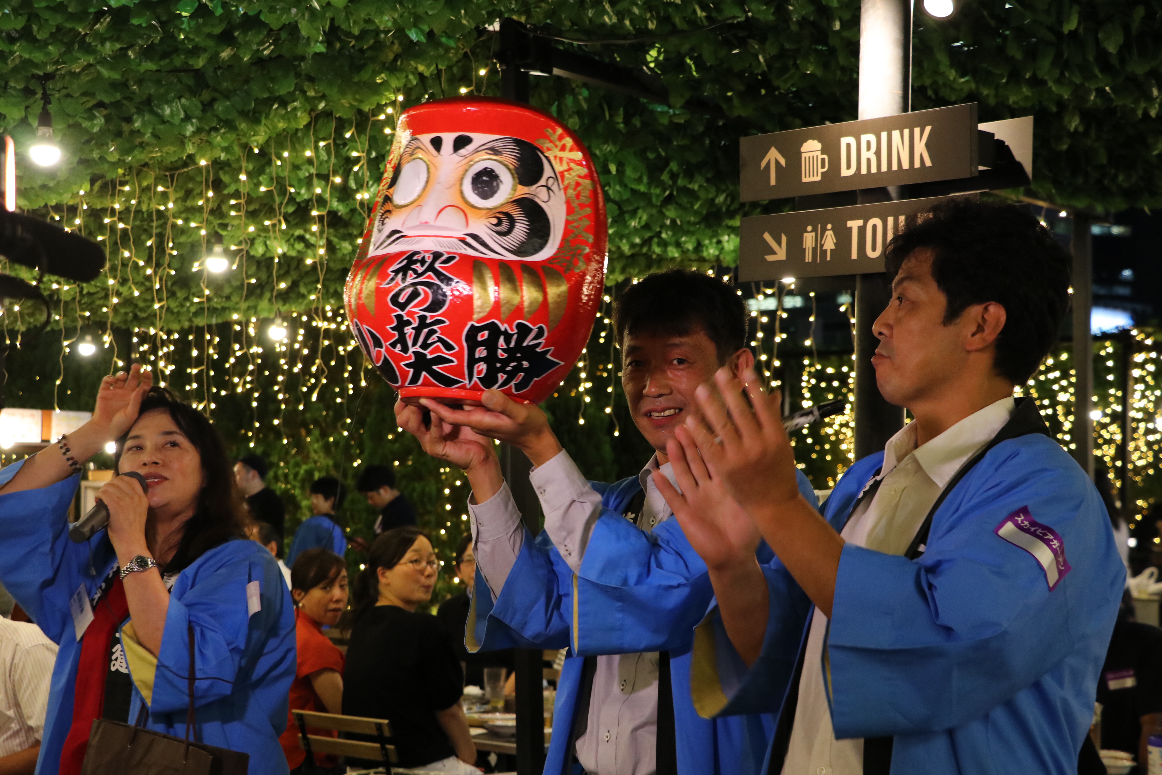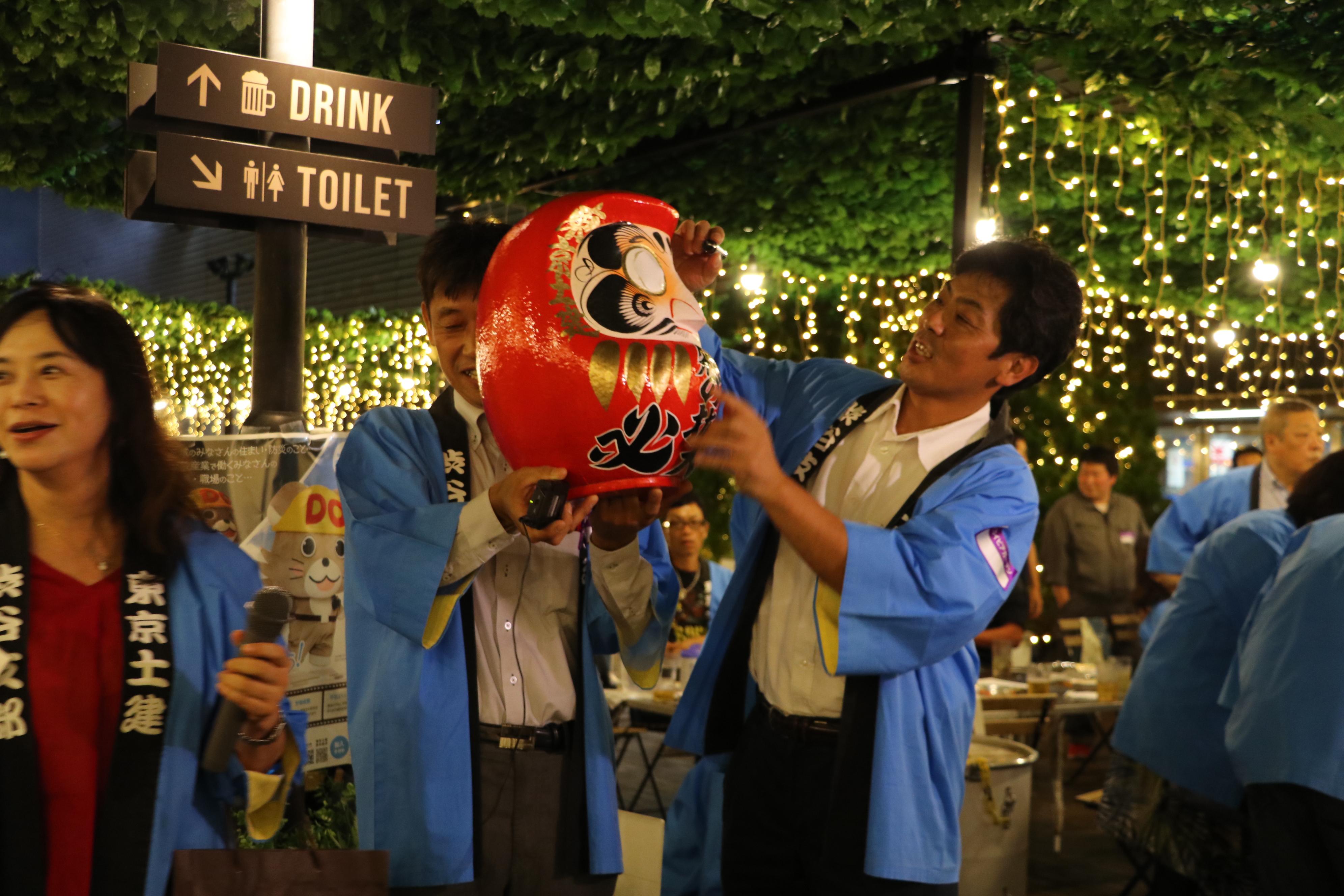 宴もたけなわな所で白須組織部長による組合員拡大の訴え、続いて伊藤委員長が月間成功を祈願してダルマへ目入れ。