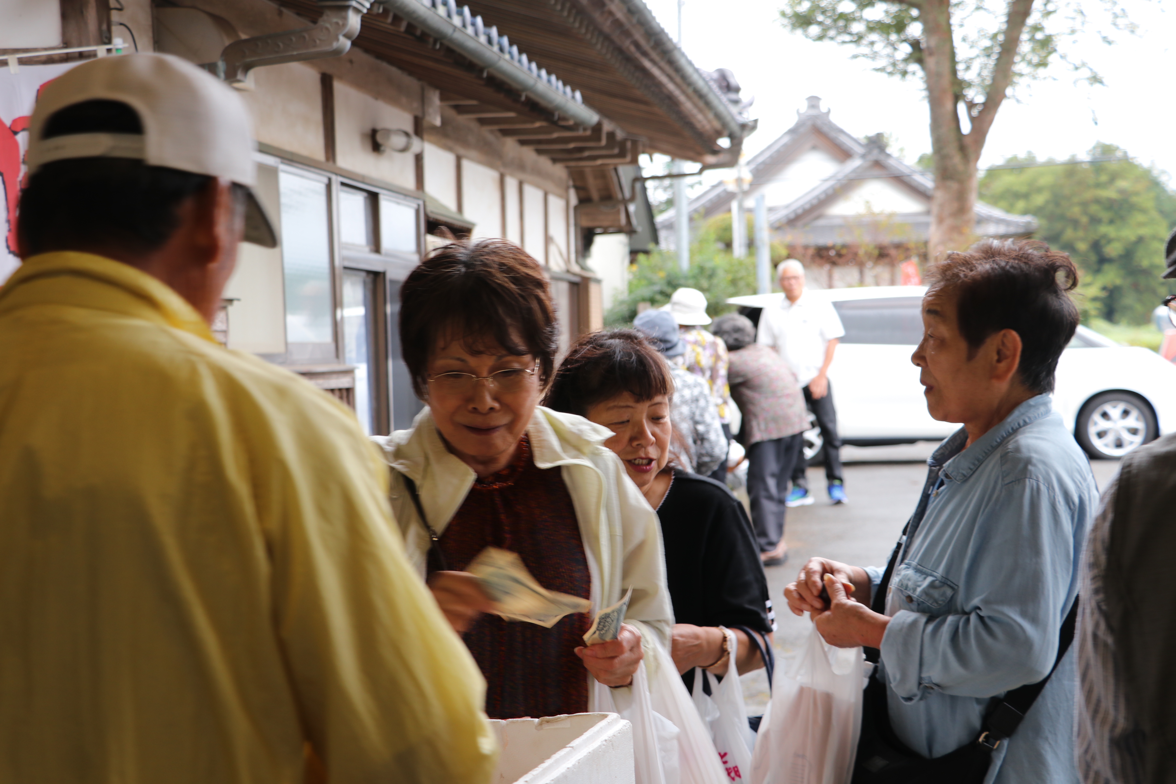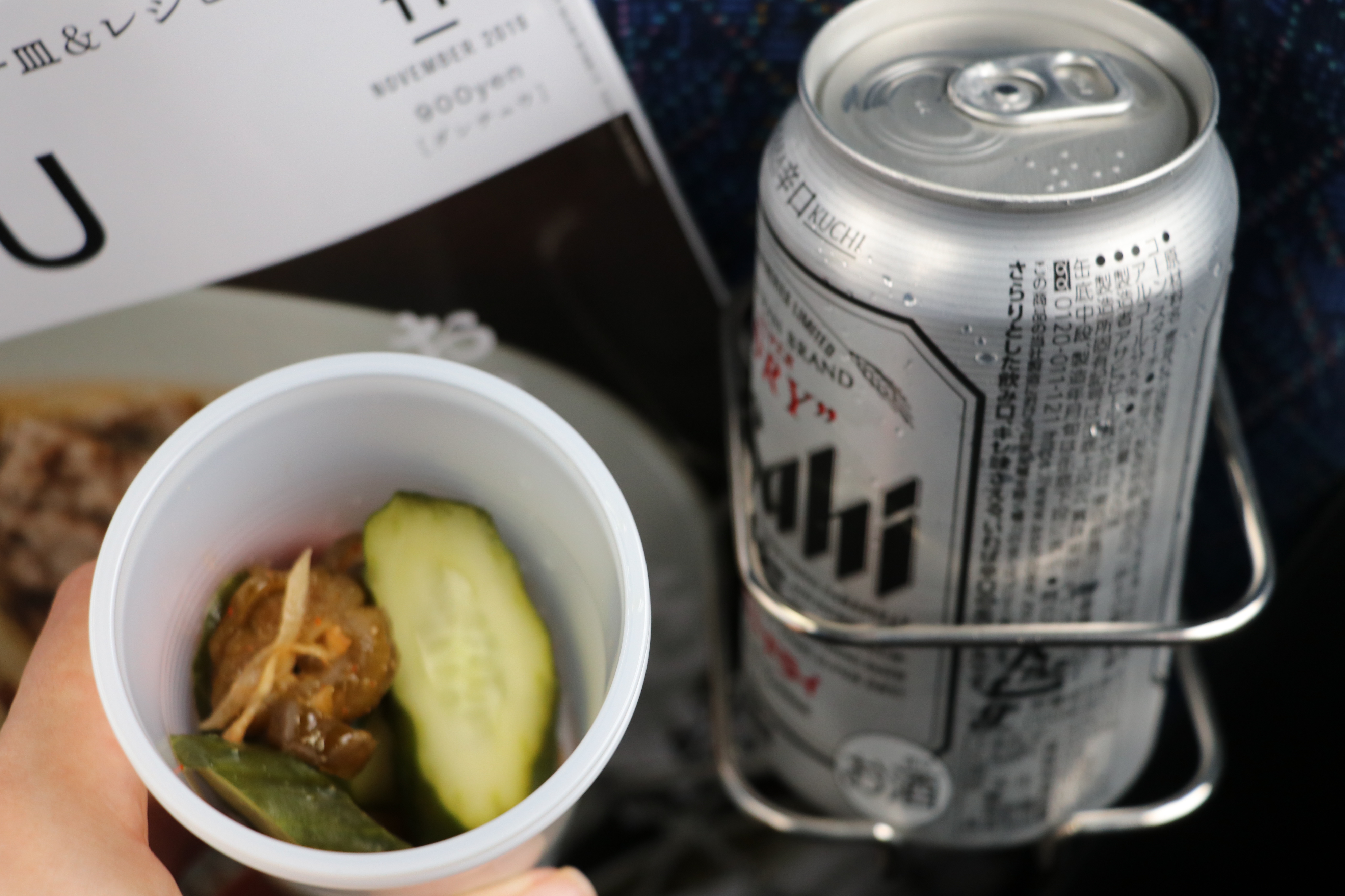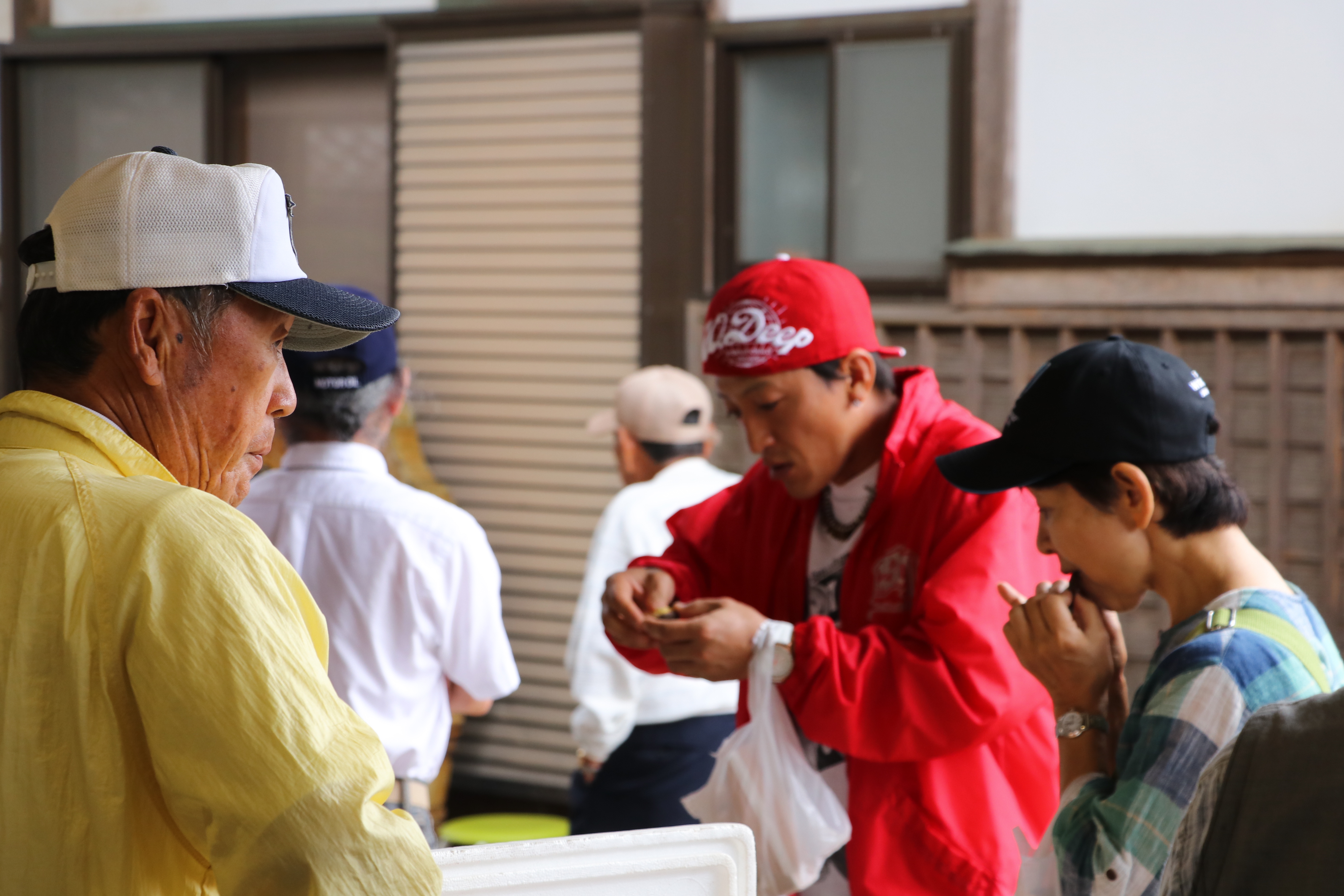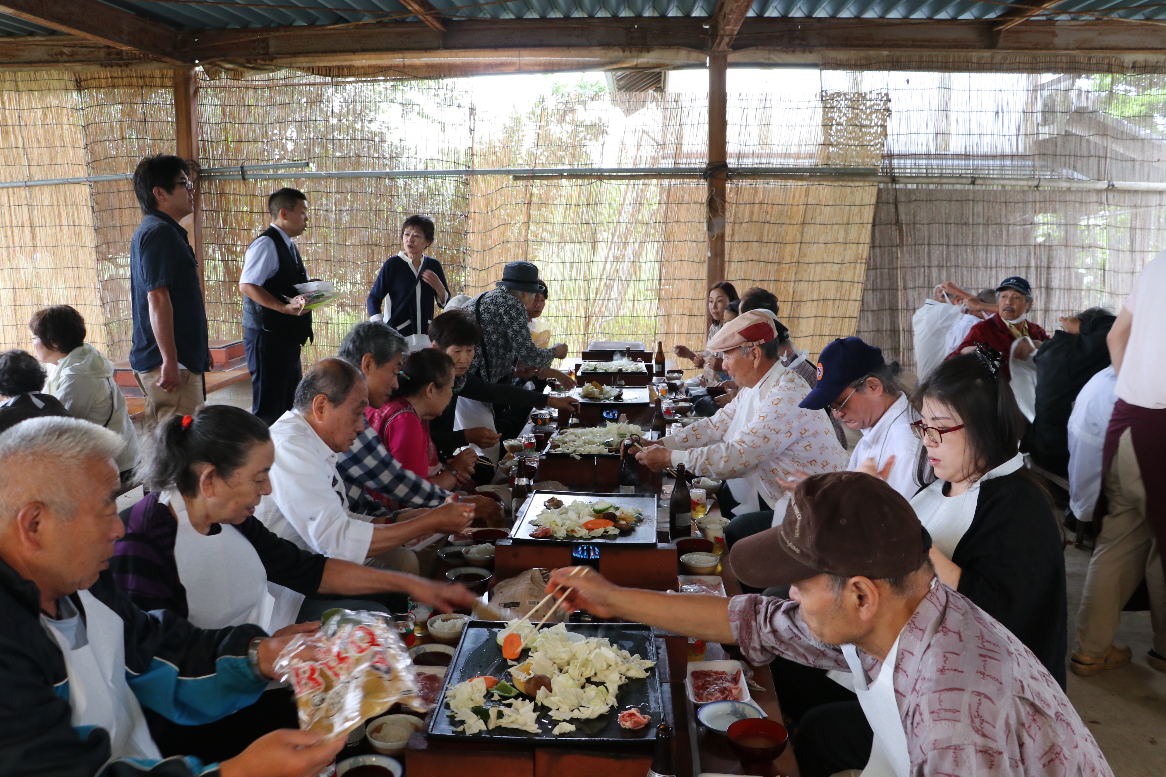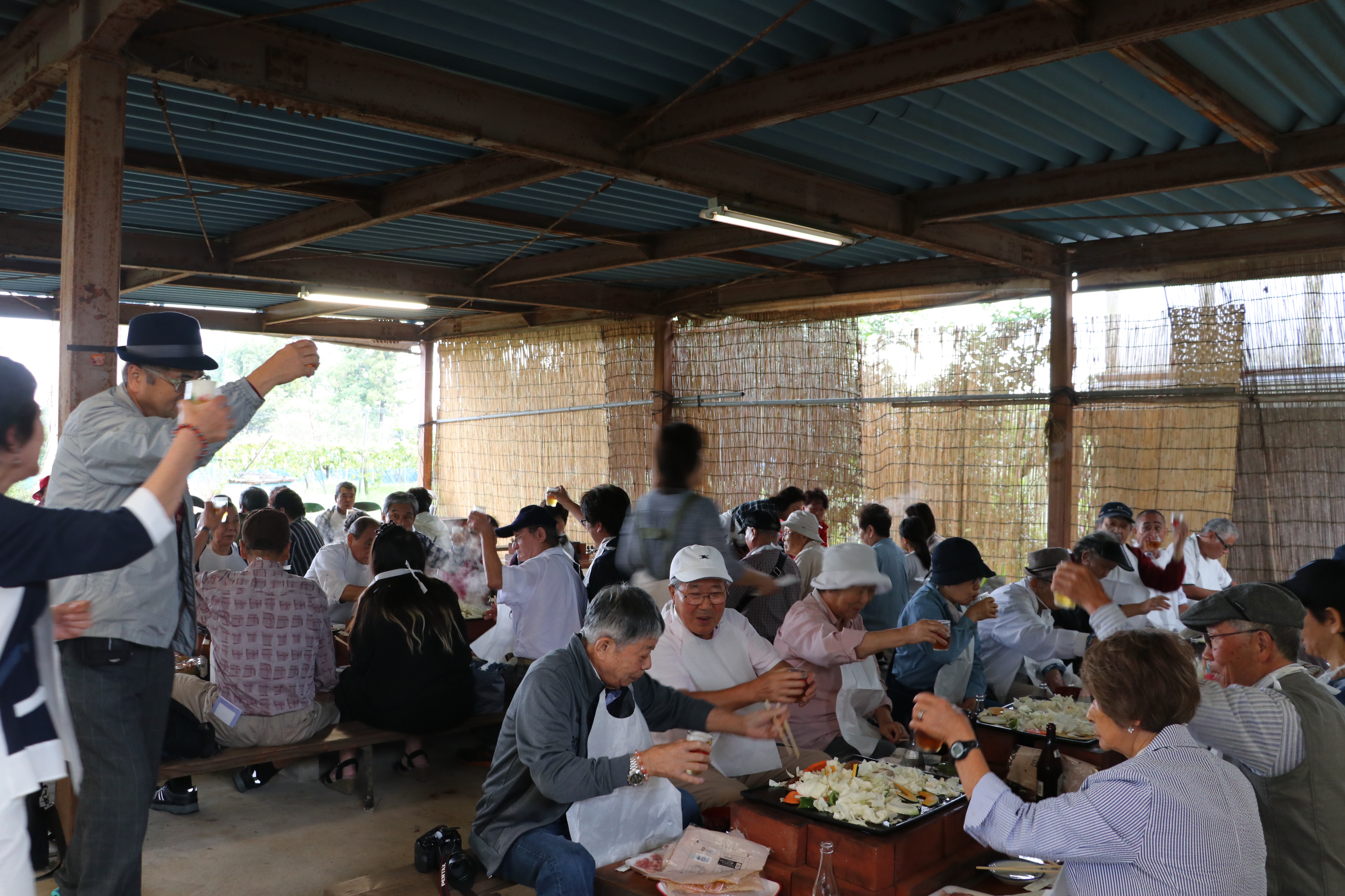 富田國男分会長の「皆さんの行いが良いので天気も持ちそうです。今日一日、楽しみましょう!」のご挨拶で、乾杯。7時58分でした。差し入れのお漬け物をつまみに飲む朝ビールはとても美味しかったです。