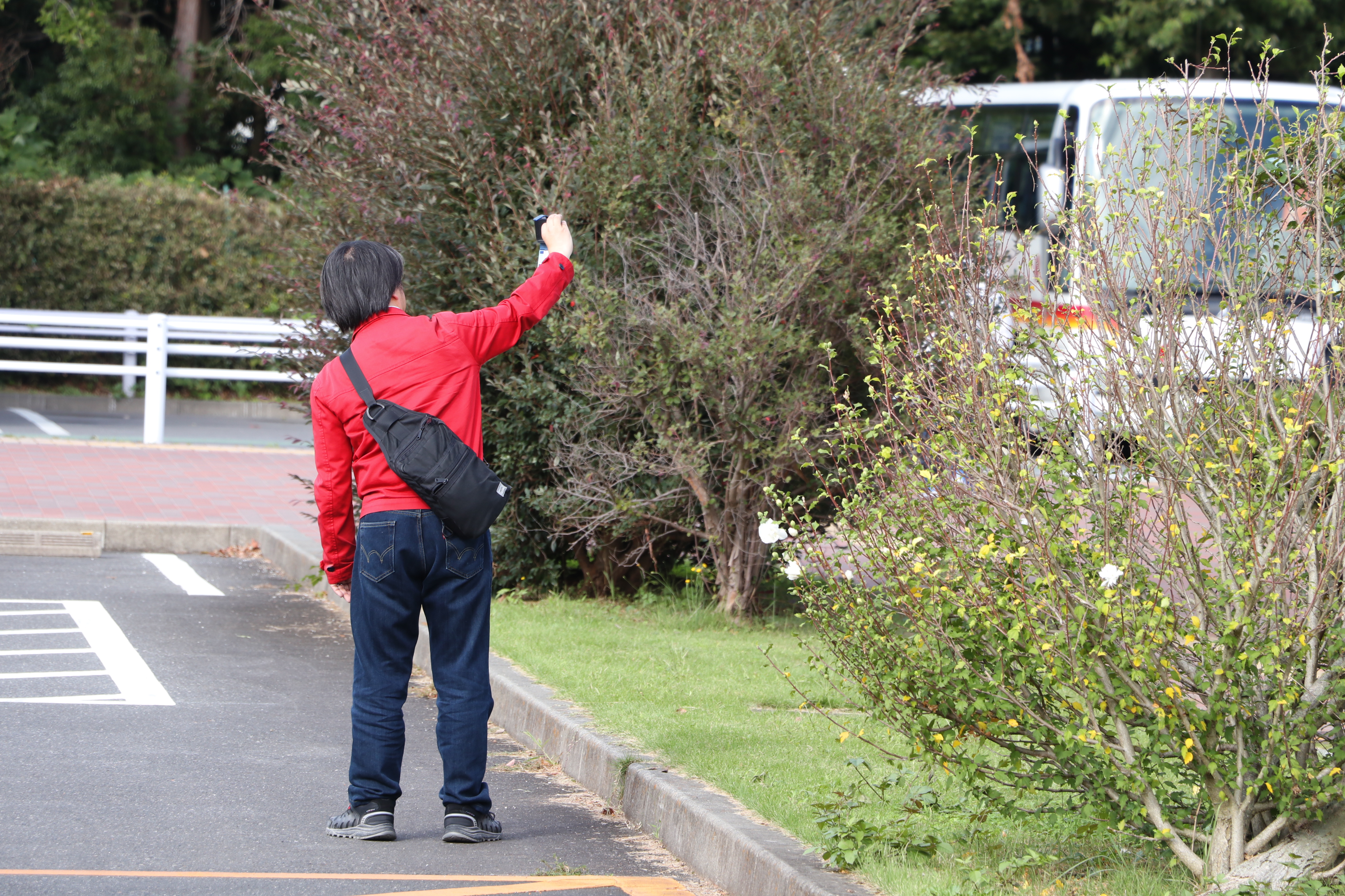 ロケット前で記念撮影(自撮り)をする2号車担当の篠木書記。