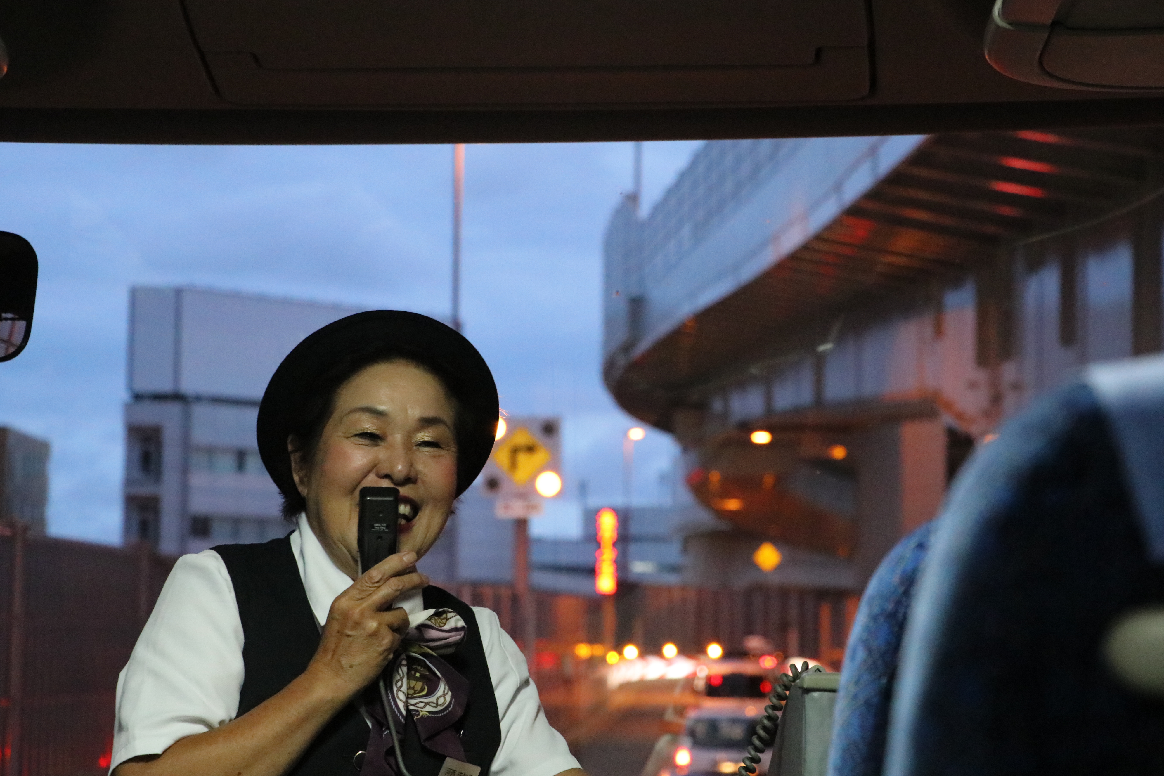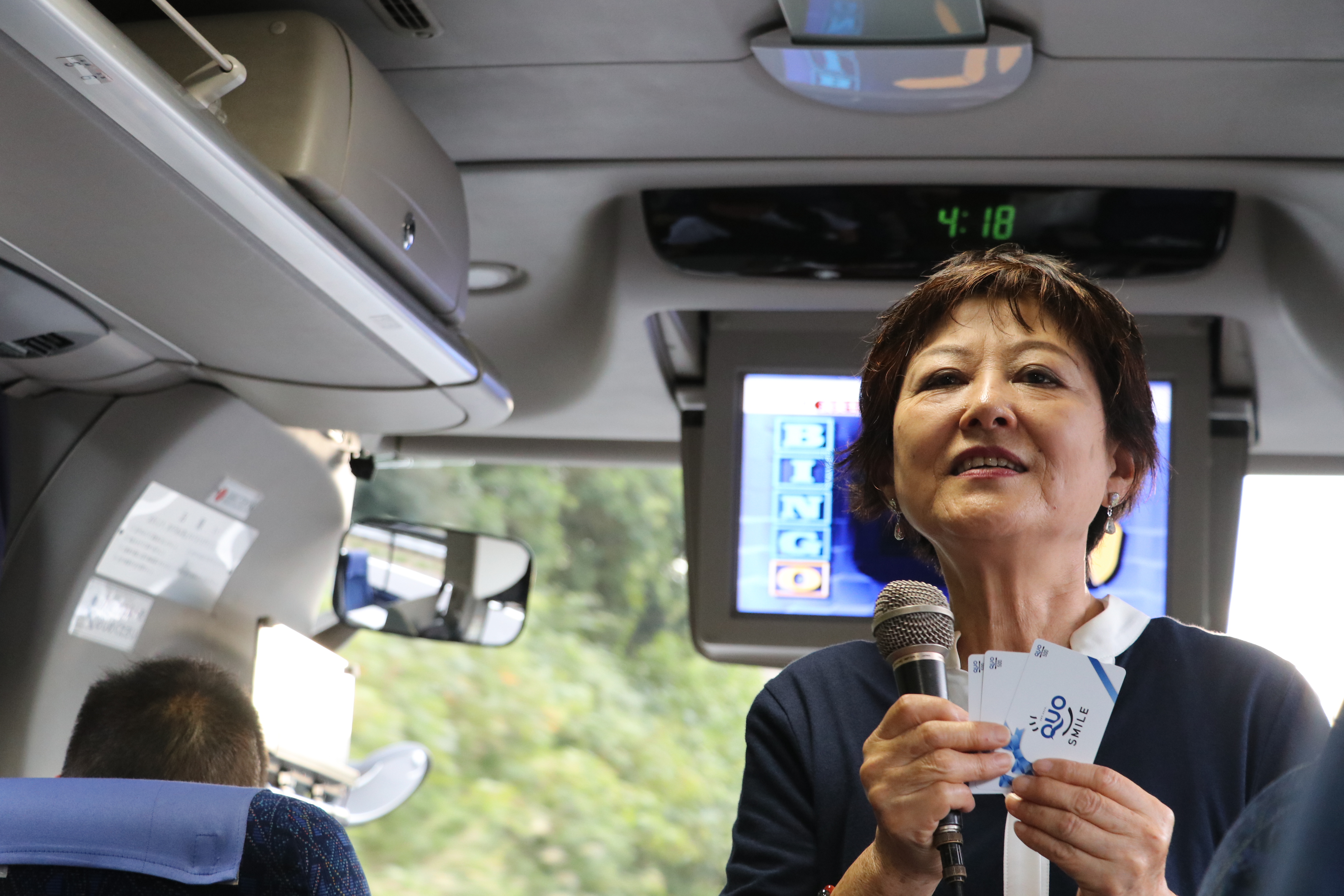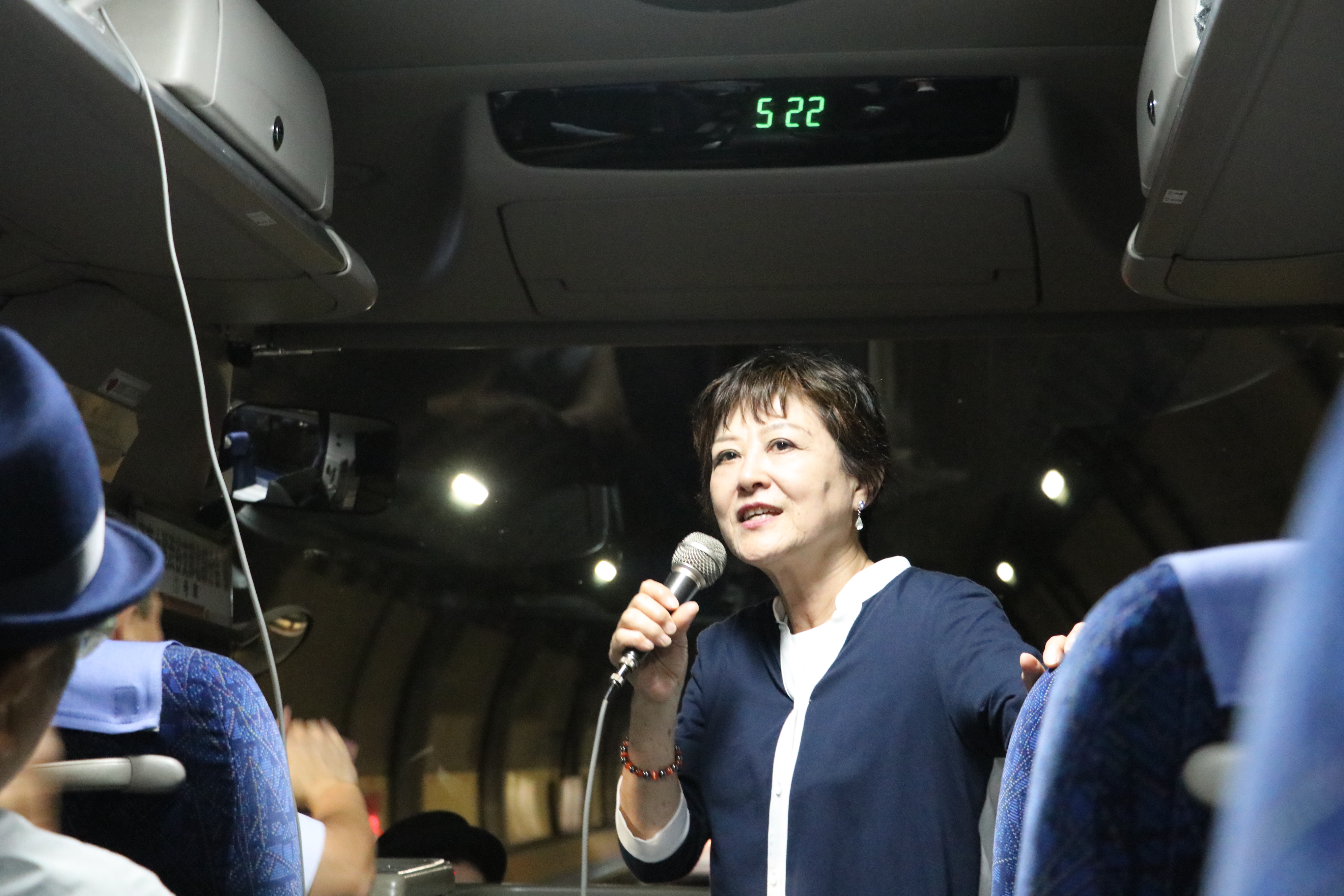 道中、とても面白いお話しを聞かせてくれたバスガイドさん。人気者で、毎回ご指名です。私は3回目くらいですが、いつも楽しくて眠れません。
