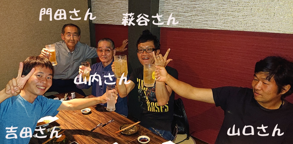 親子で山内内装を営む内装屋さん。門田さんの紹介で組合に加入していただきました。緑茶ハイを飲んでいるかと思いきや、キウイサワーでした。
