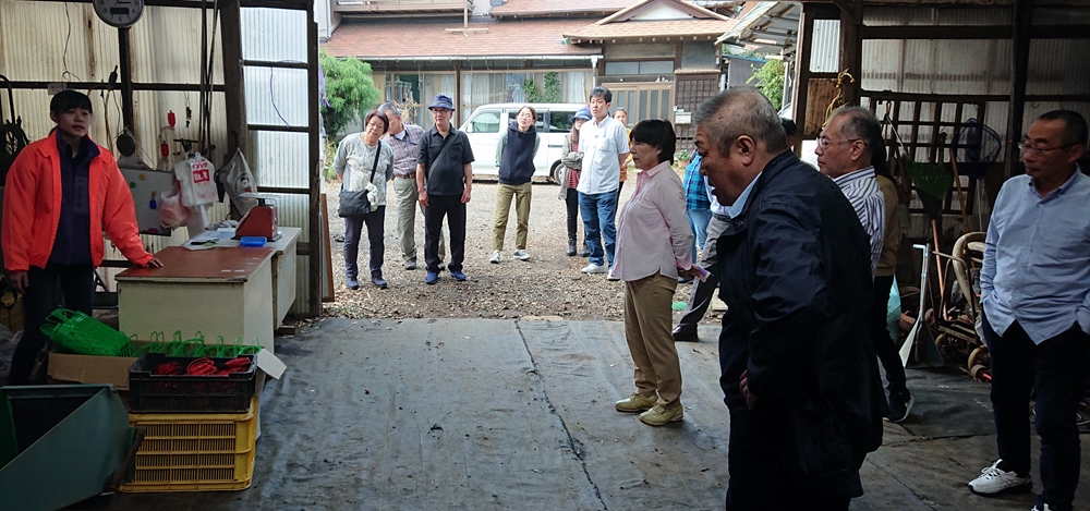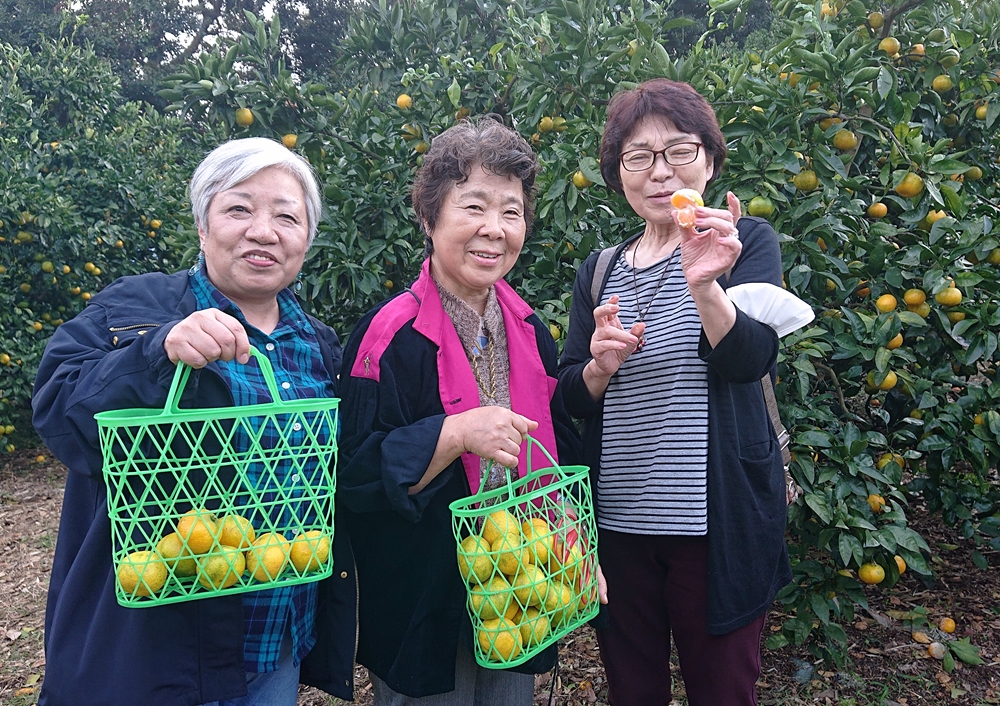 ミカン狩りの説明を受ける西部分会の仲間たち。
