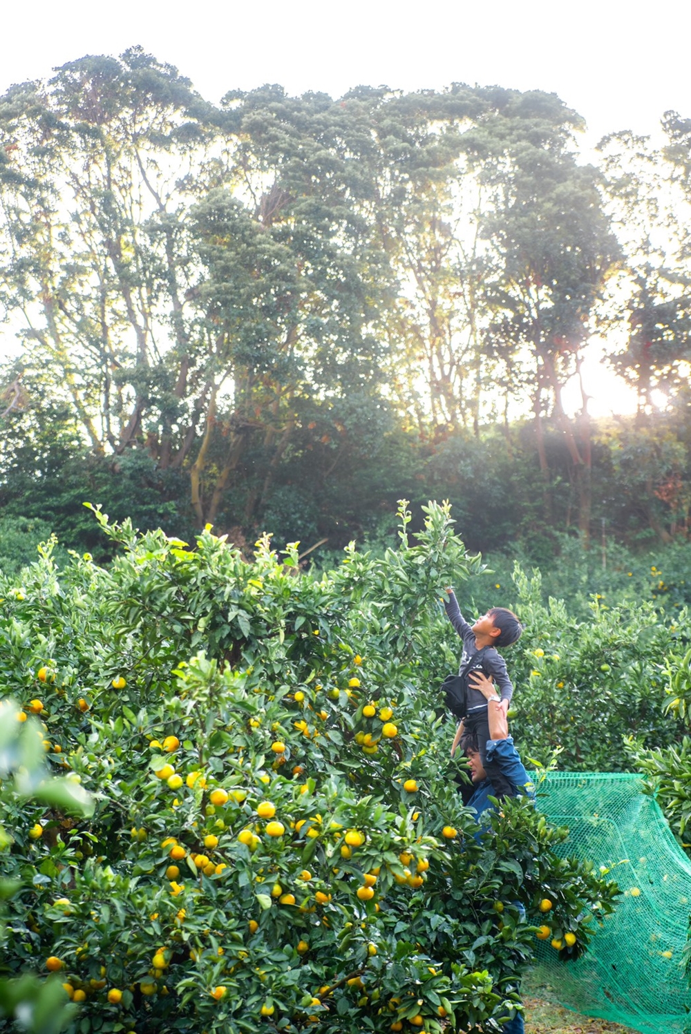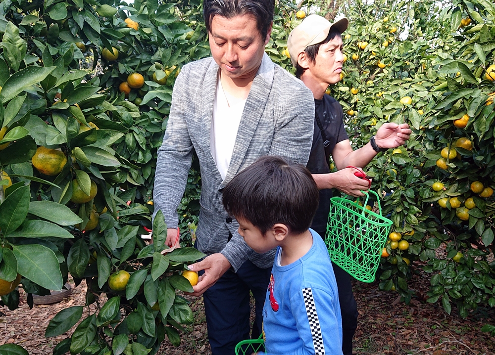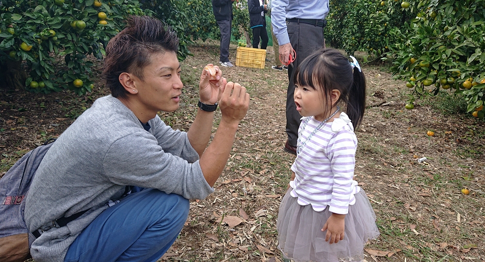 お父さんにに乗っかって、日当たりバッチリの甘いミカンをゲット。