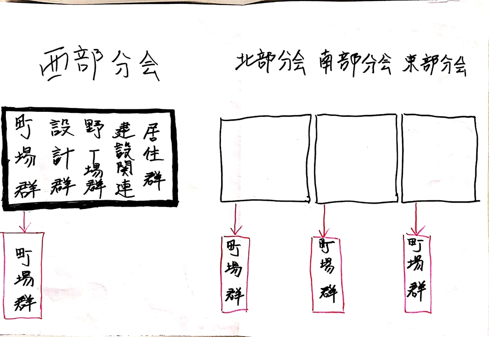 最後に、門田組織部長直筆の渋谷支部の組織図を用いて、町場群の位置づけを説明。