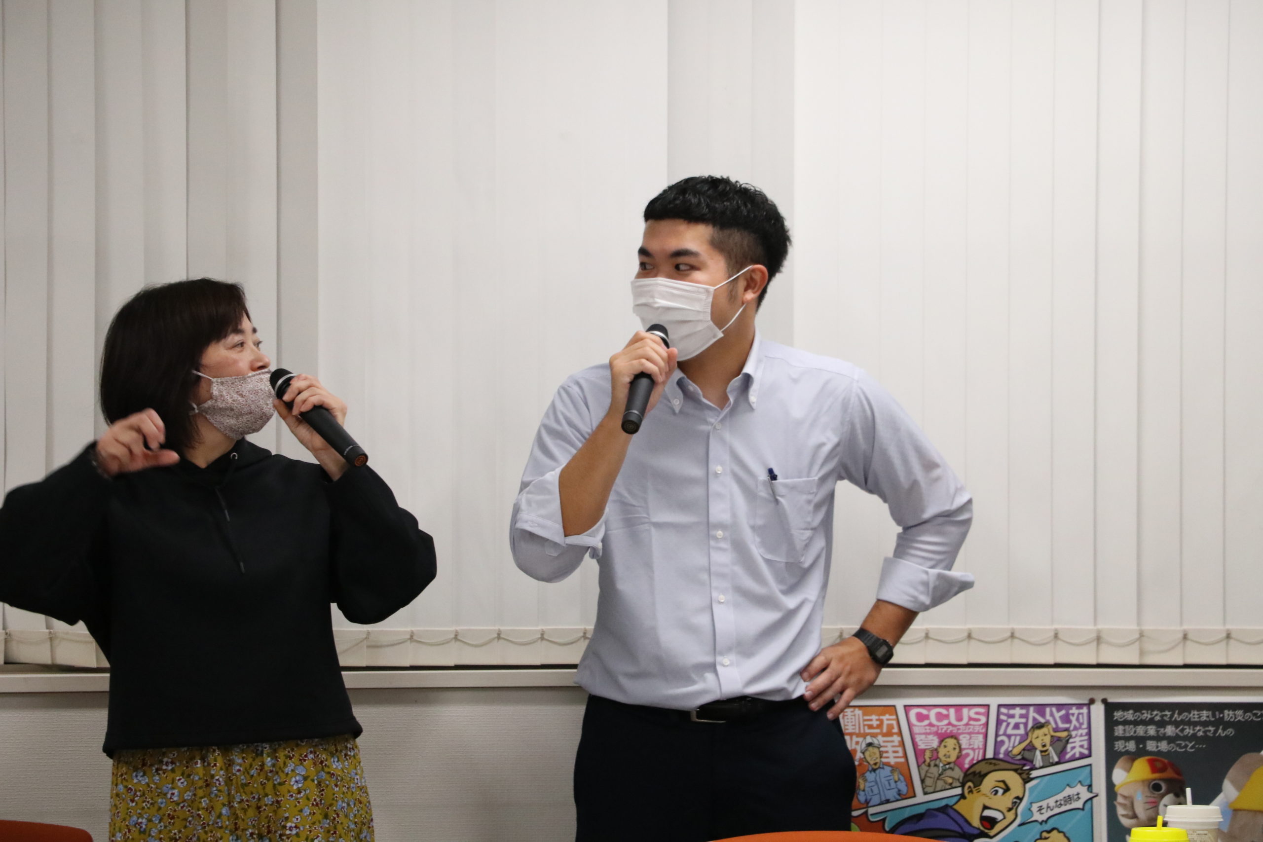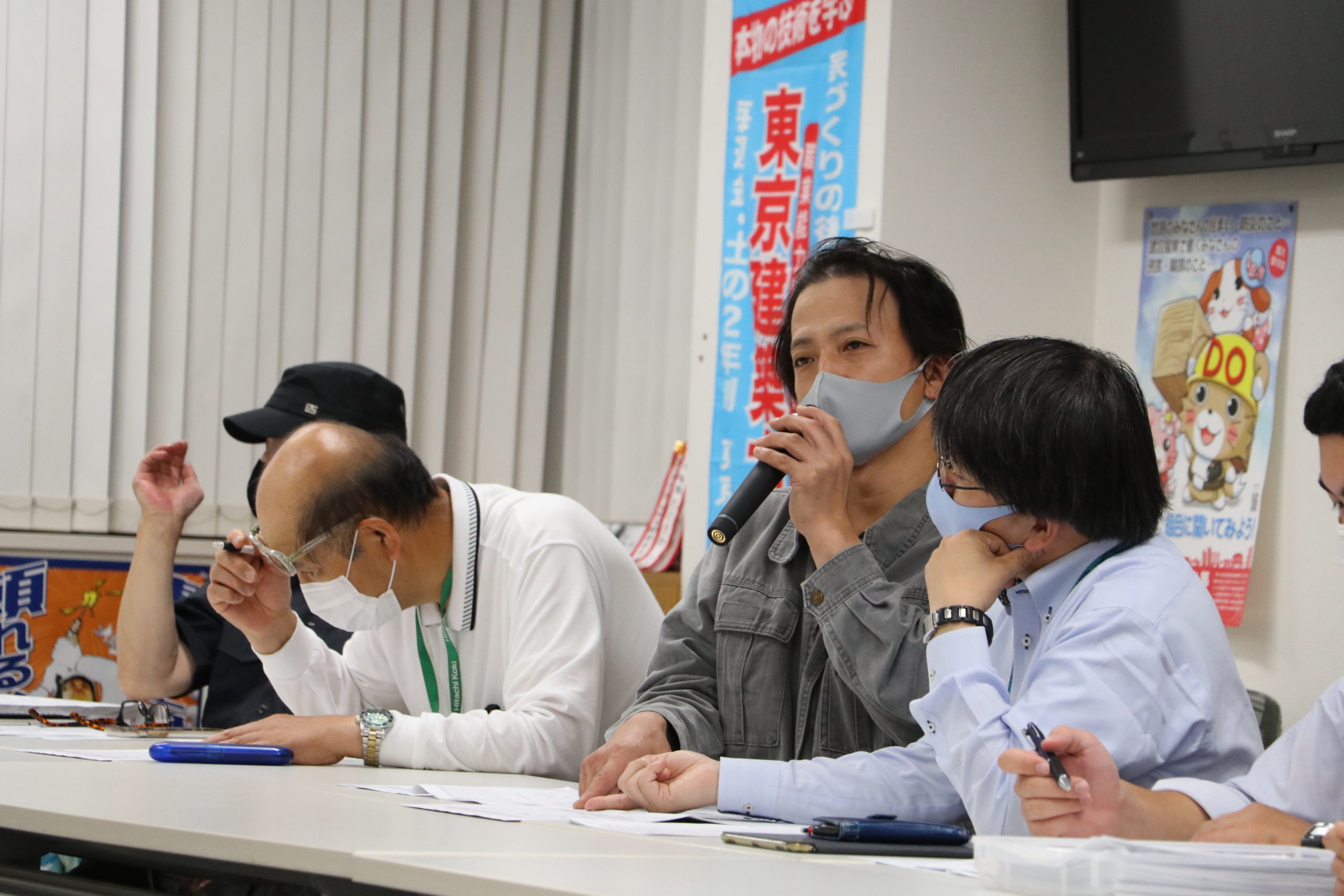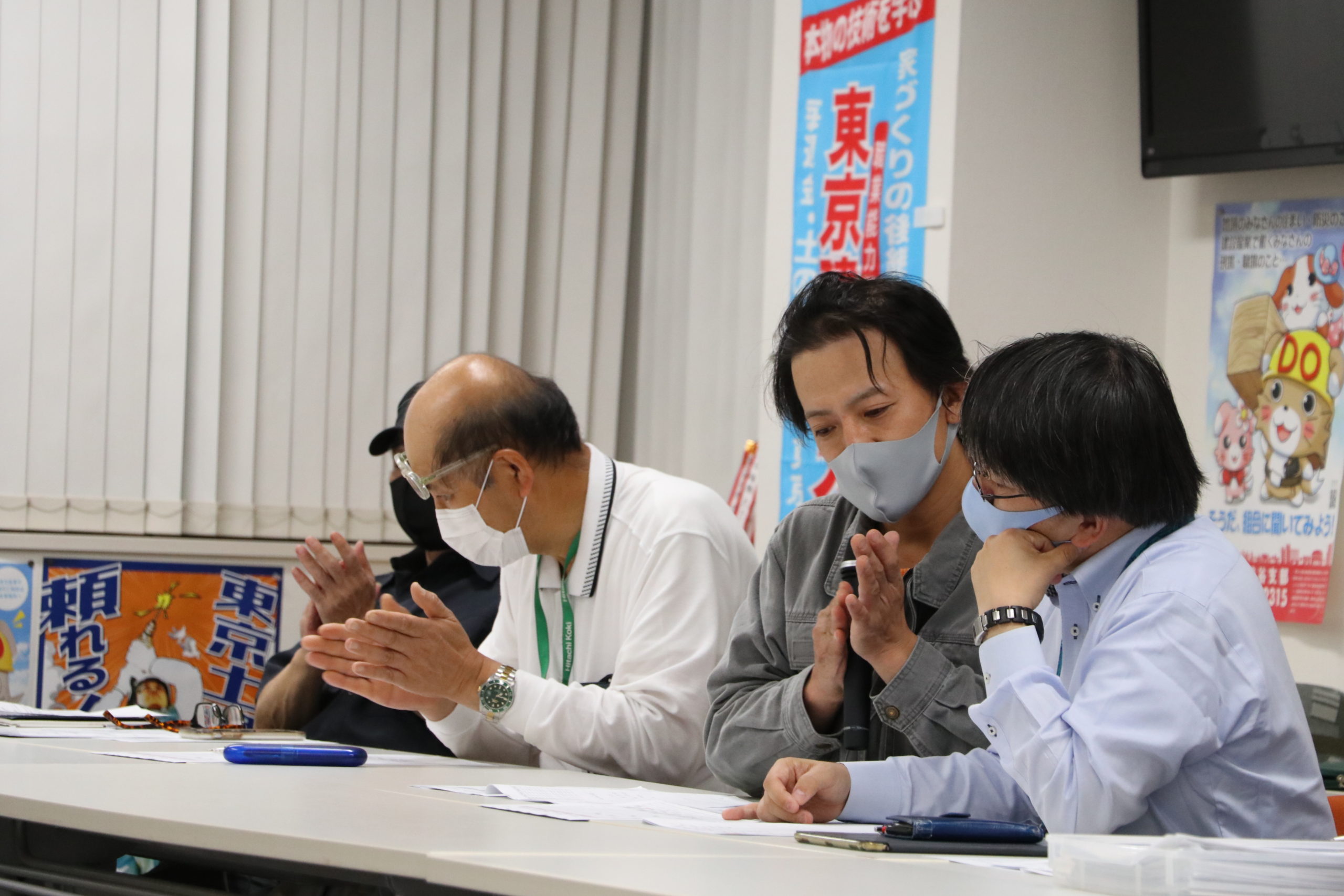 全都の拡大状況や、土建国保減免制度の利用状況を報告する本部の木村さんと小嶋さん。