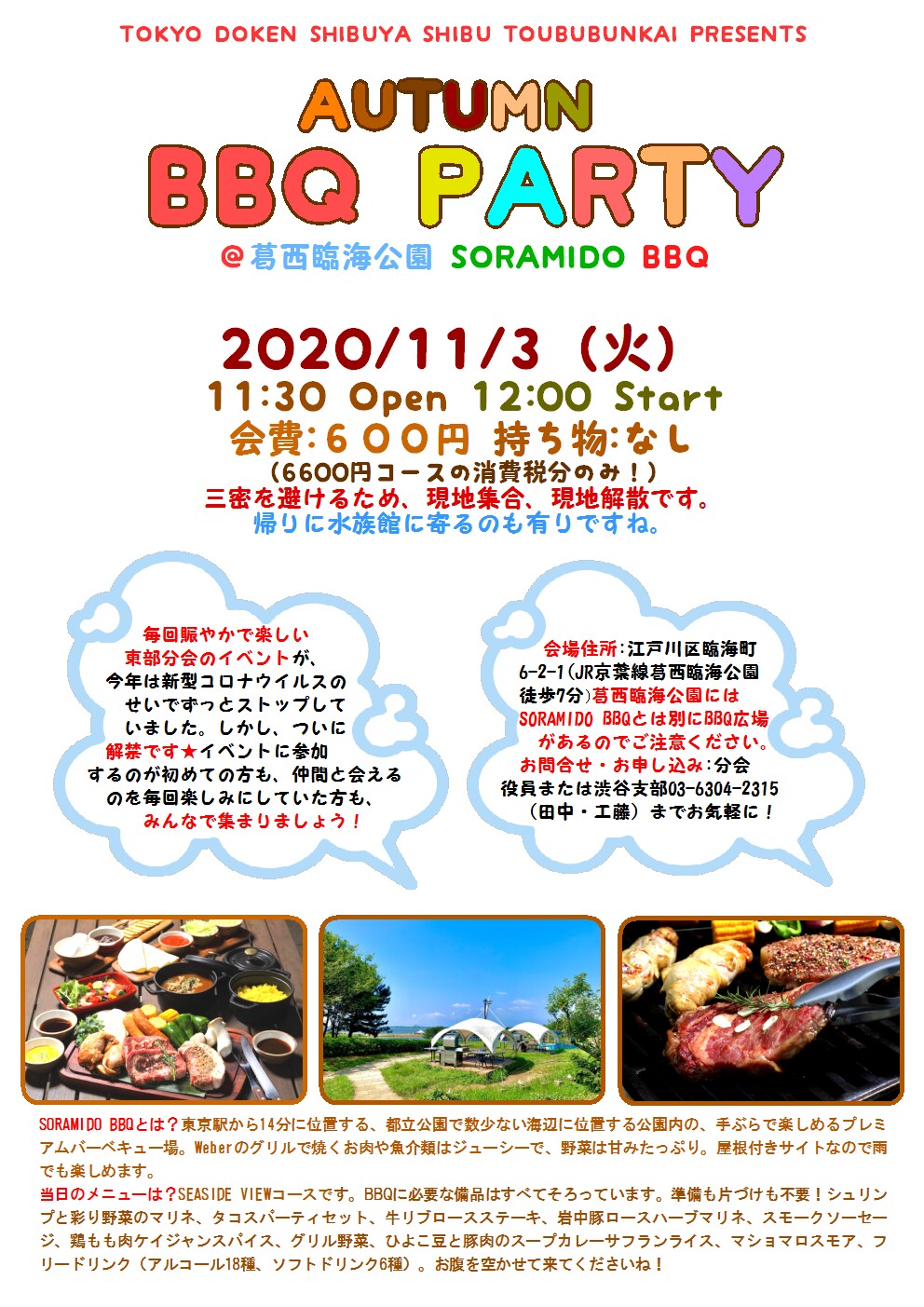 【告知・開催済み】2020年11月3日 東部分会レクリエーション@SORAMIDO BBQ