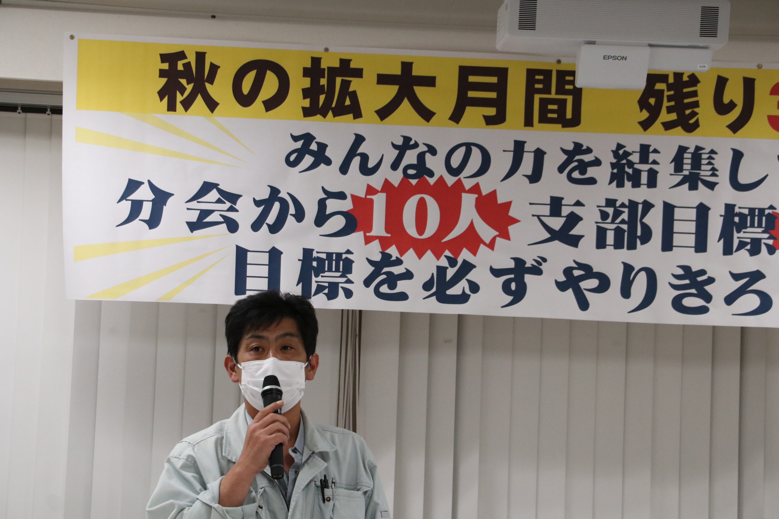 伊藤委員長が、「渋谷支部で繰り返し確認してきた、拡大目標2.5%達成を仲間にプレゼント出来るよう頑張ろう!」と挨拶。