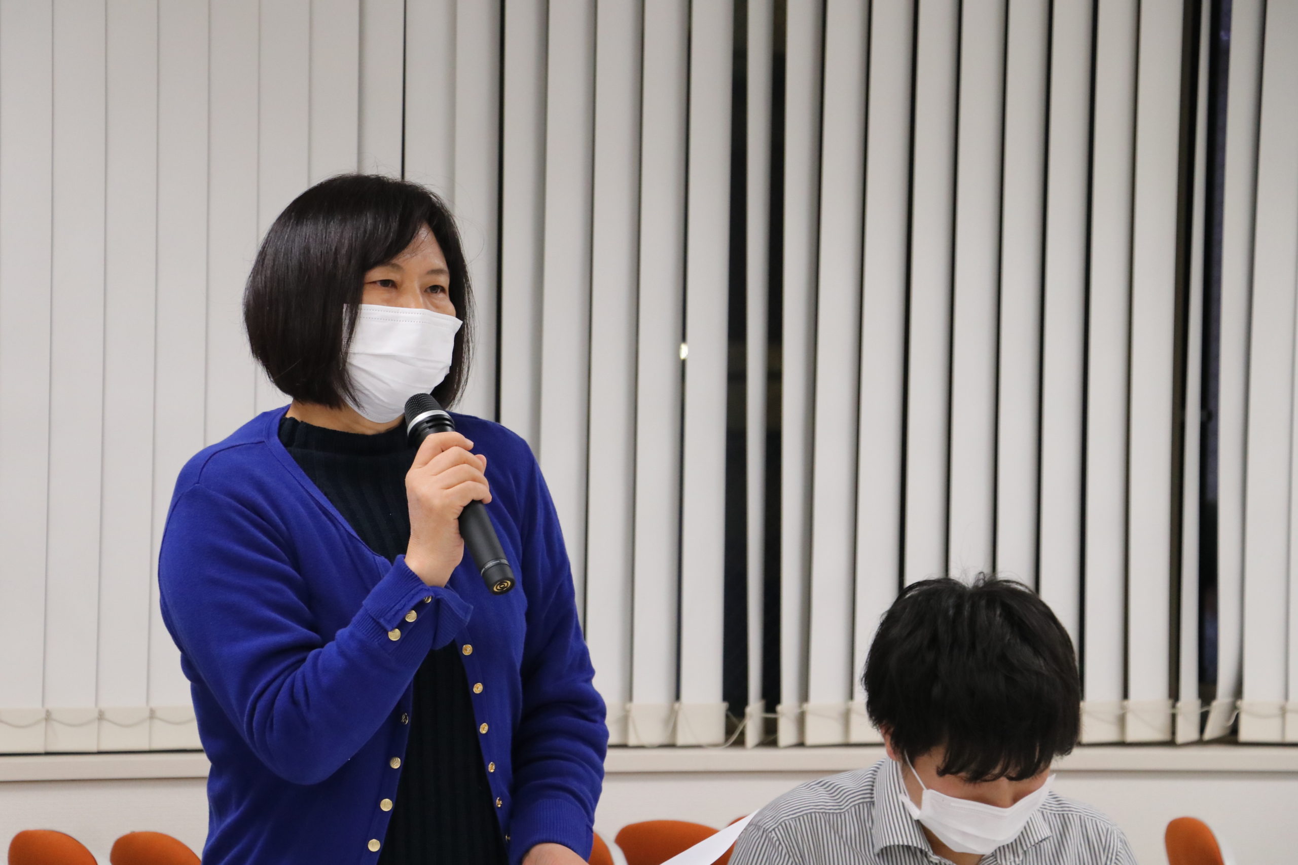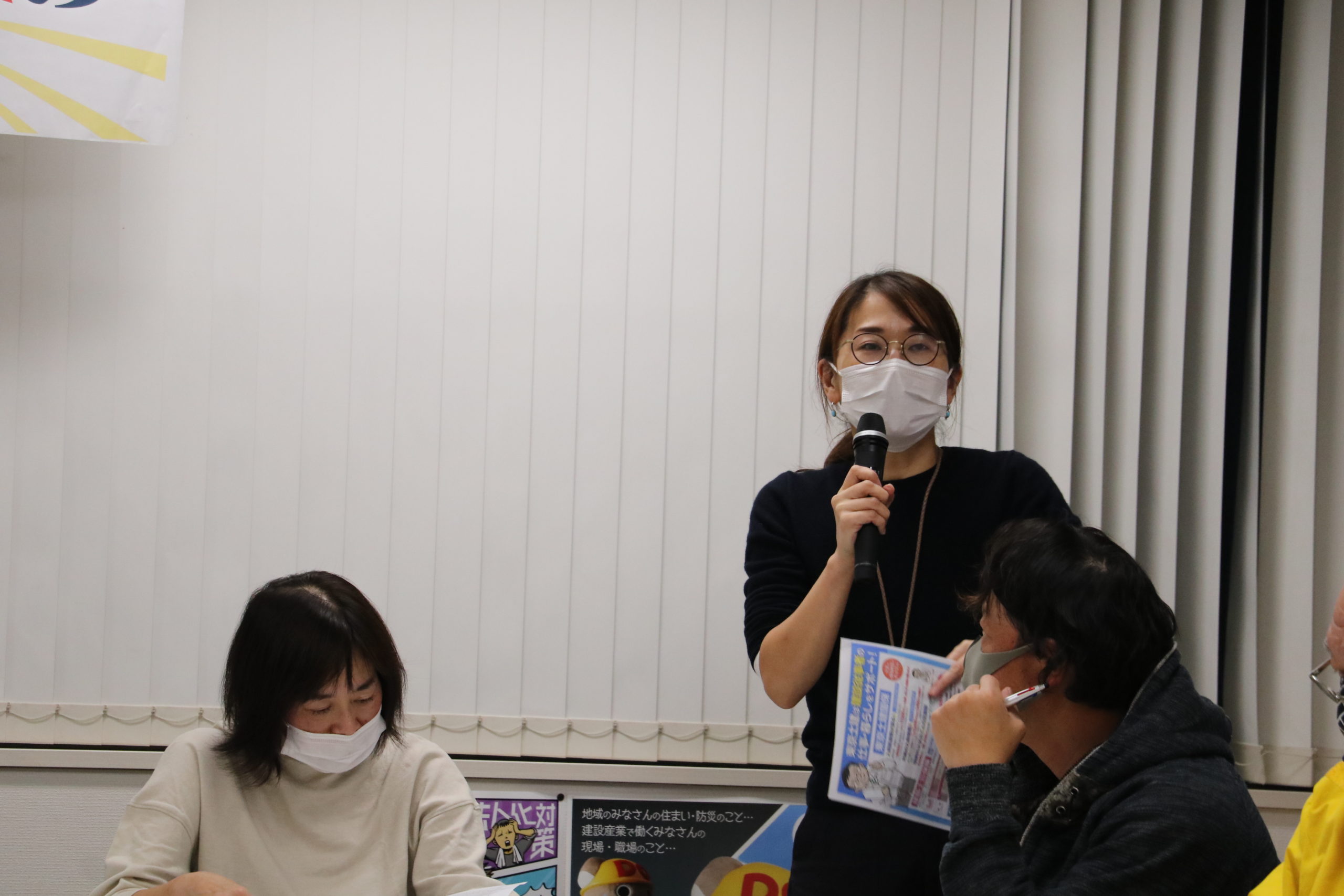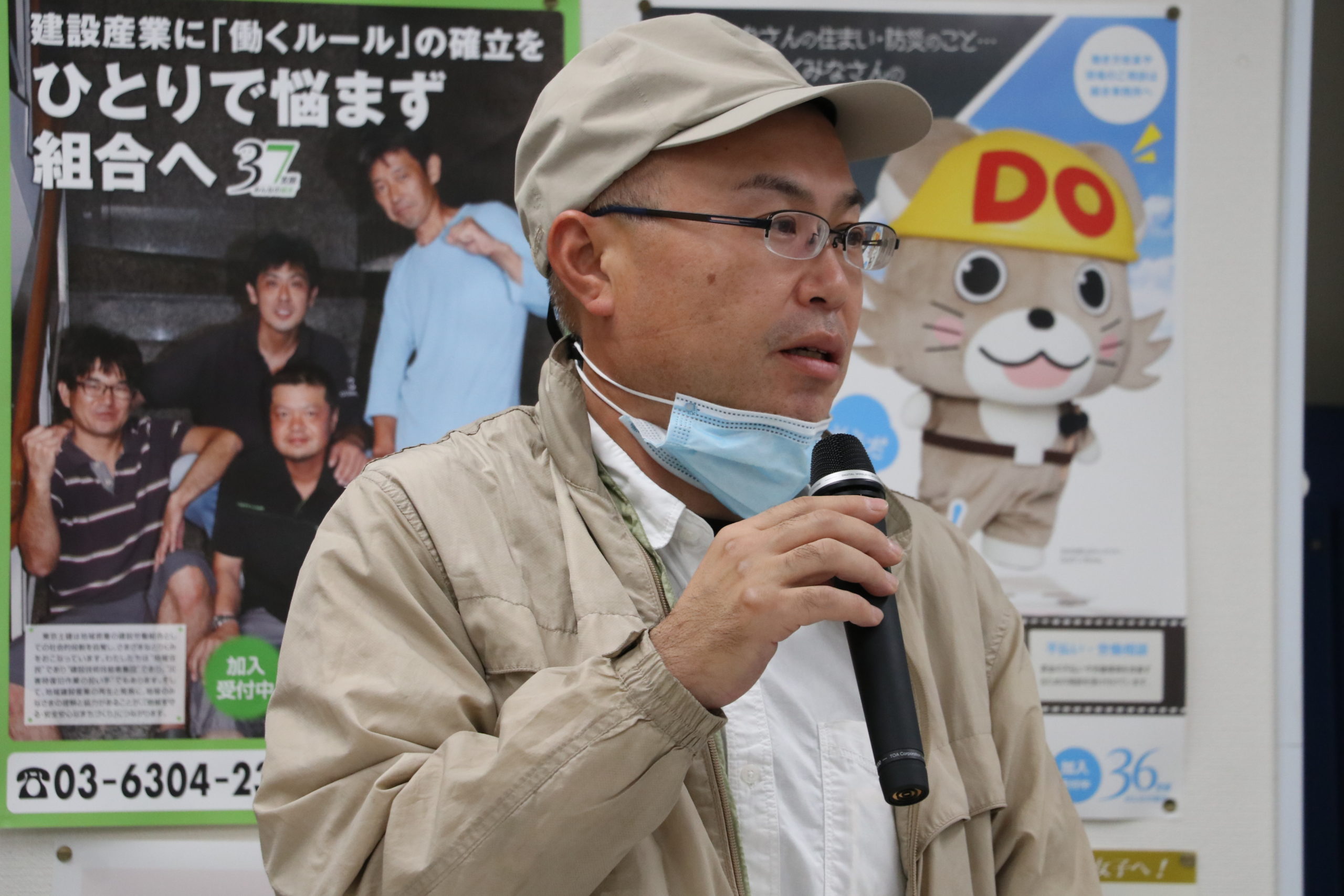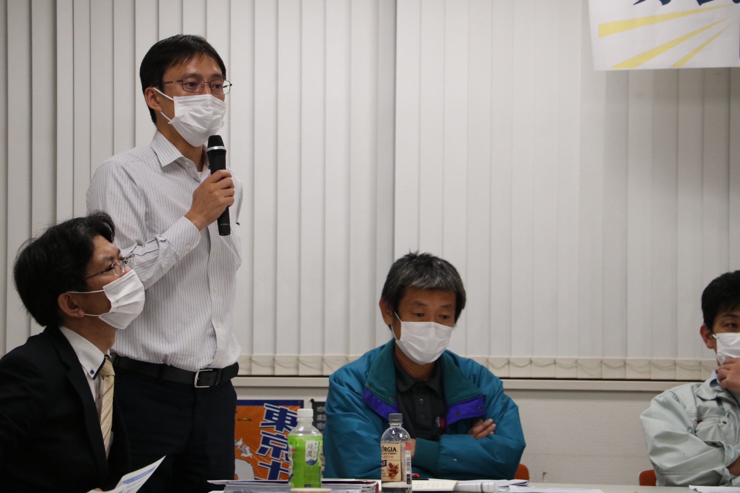 参加者からの質問に答えつつ、急きょ提案した休日行動について説明する組織担当の高木書記次長。