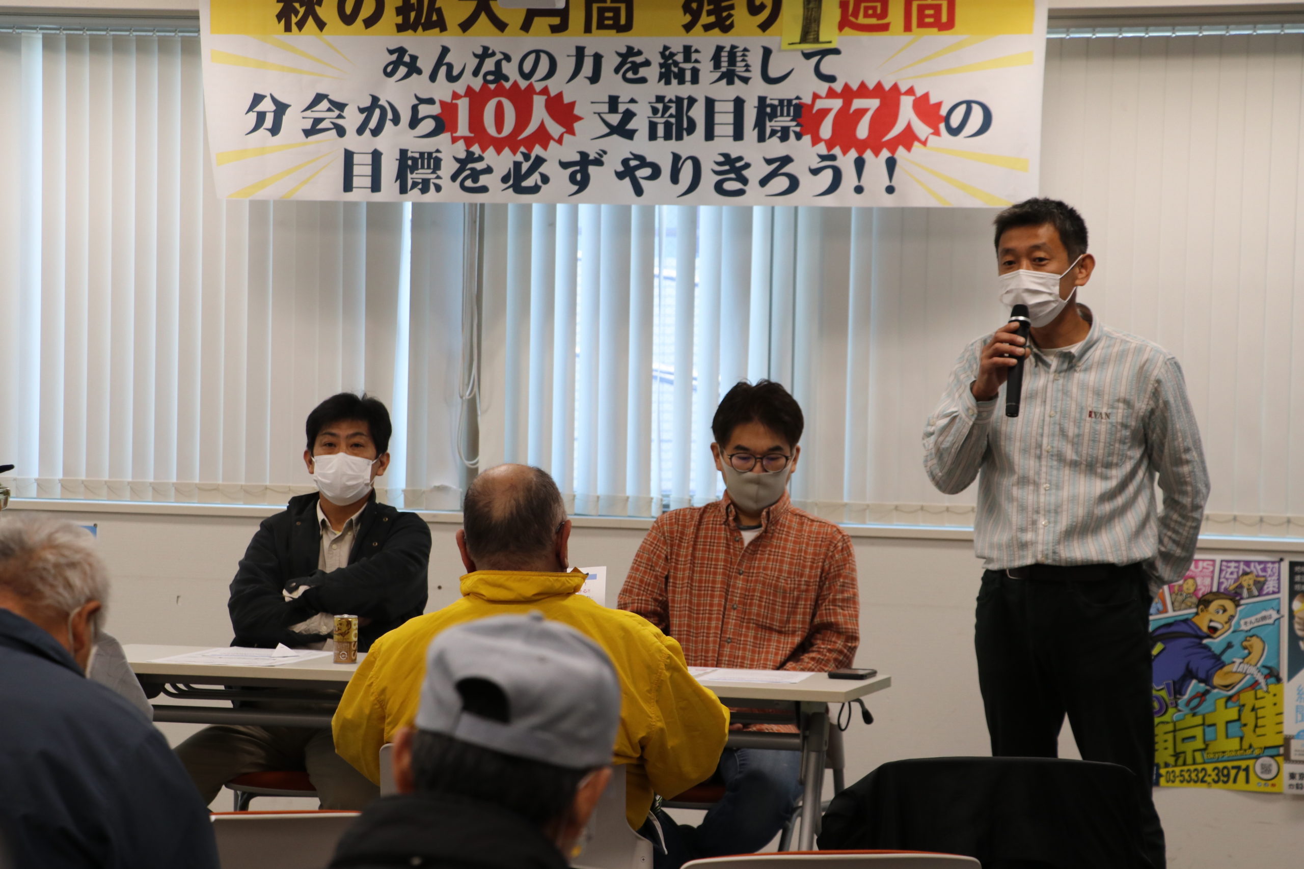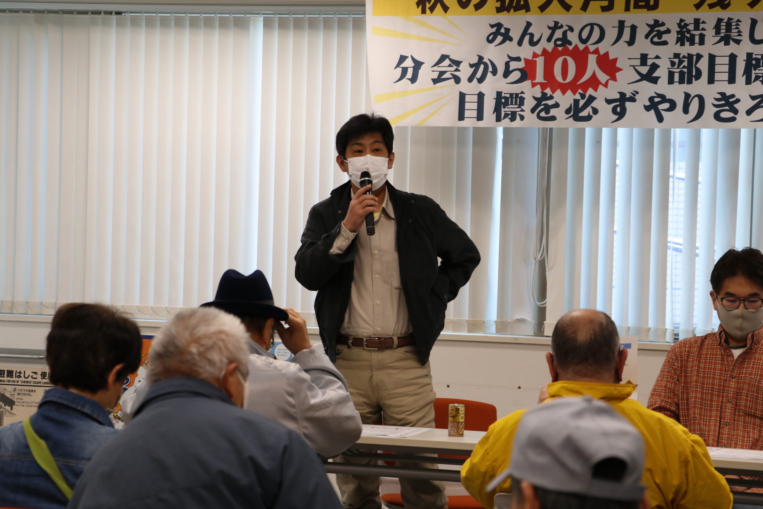 続いて高木書記次長が、2.5%達成までの具体的な行動(雇用保険に加入している組合未加入者や、組合脱退者、未加入設計事業所名簿など、いろいろな名簿の活用や繋がりの掘り起しなど)を再提起。