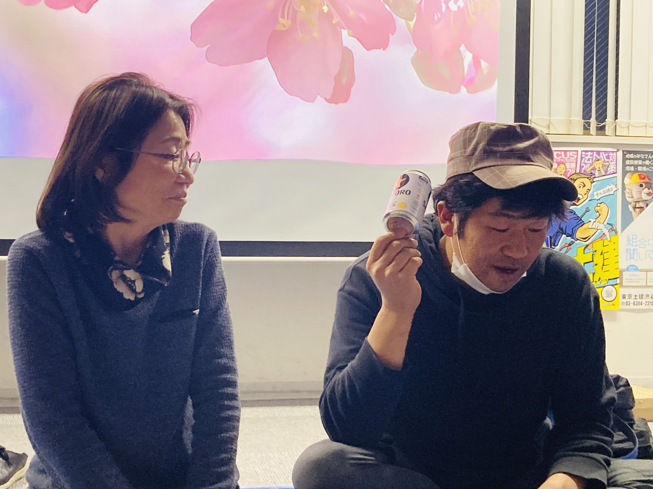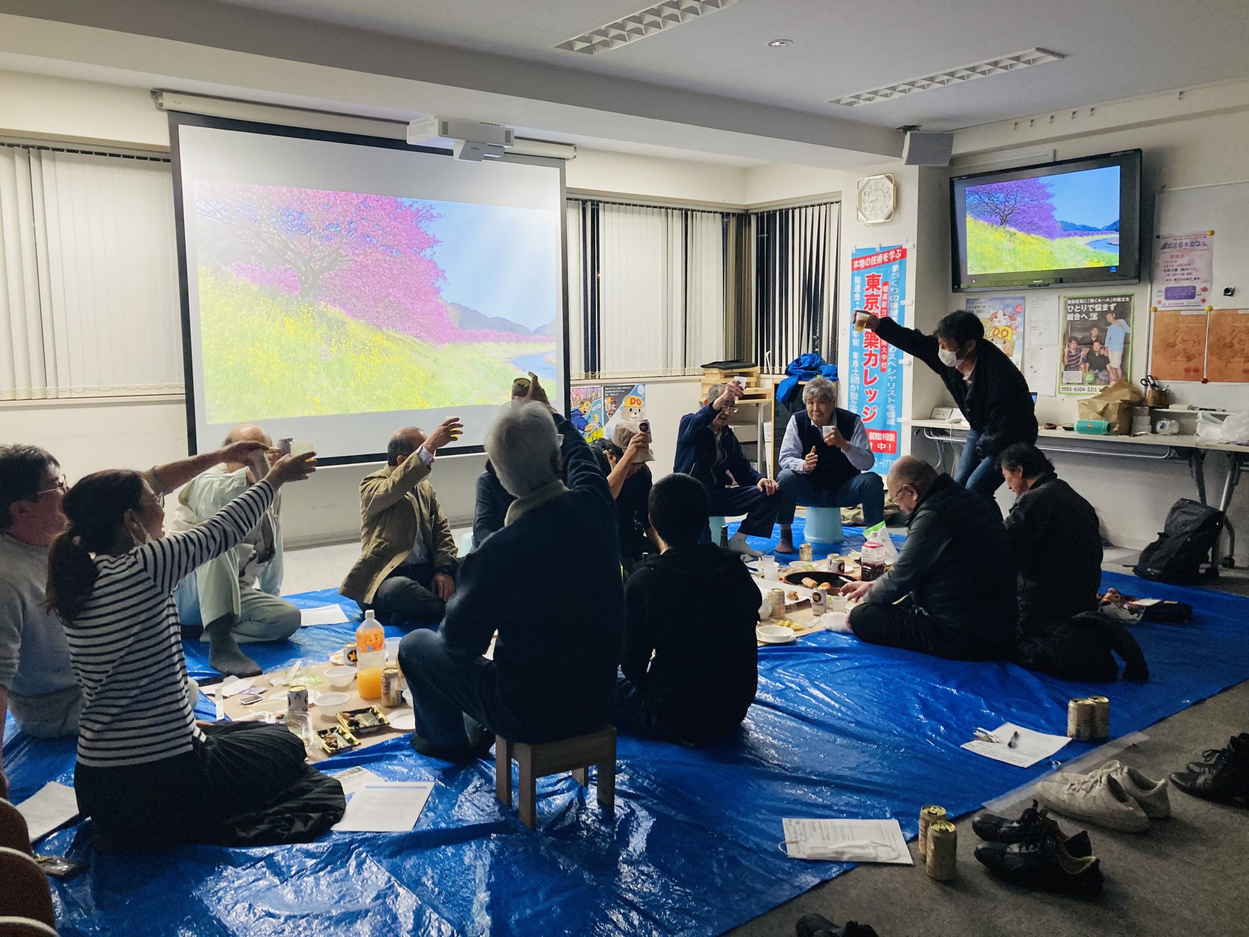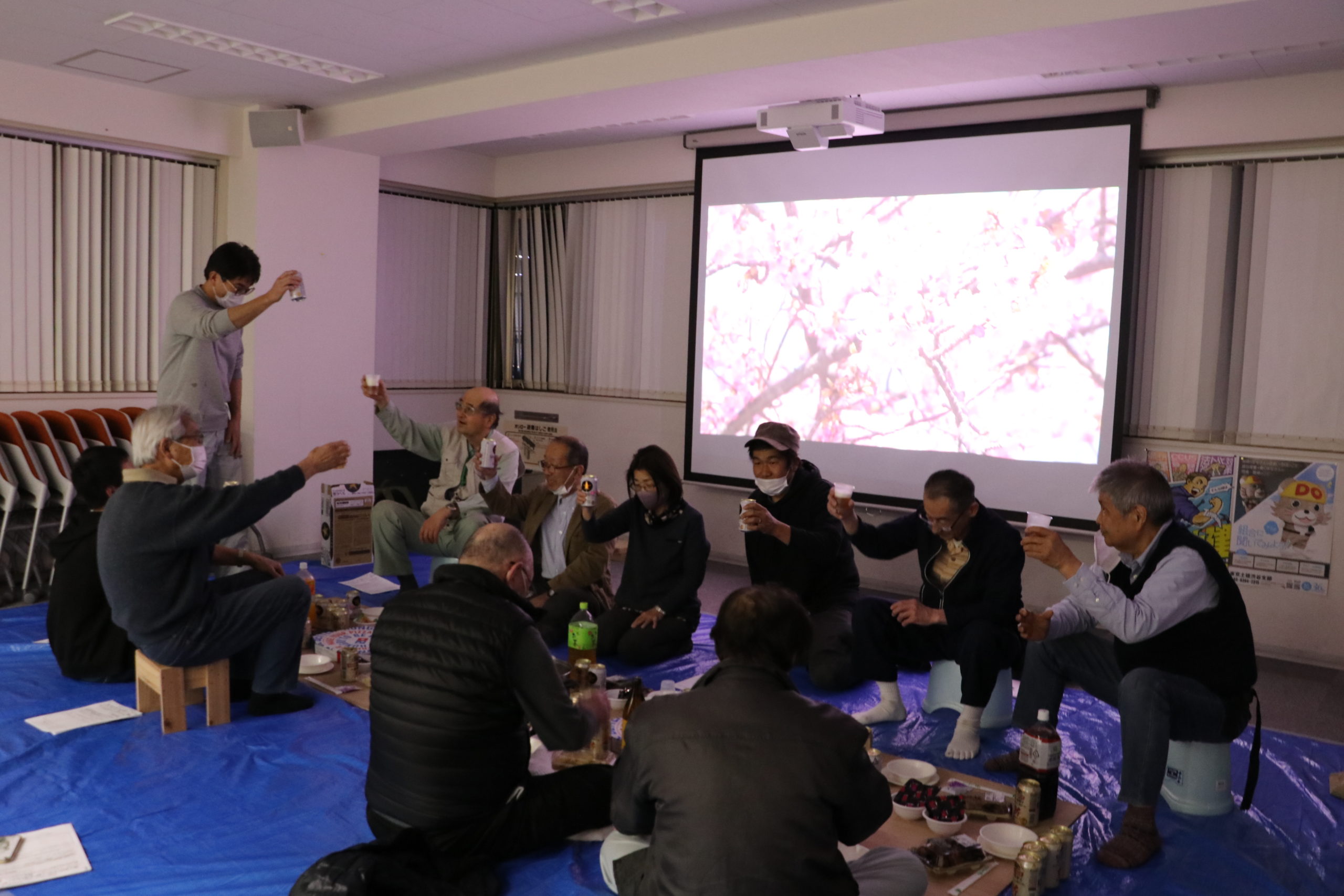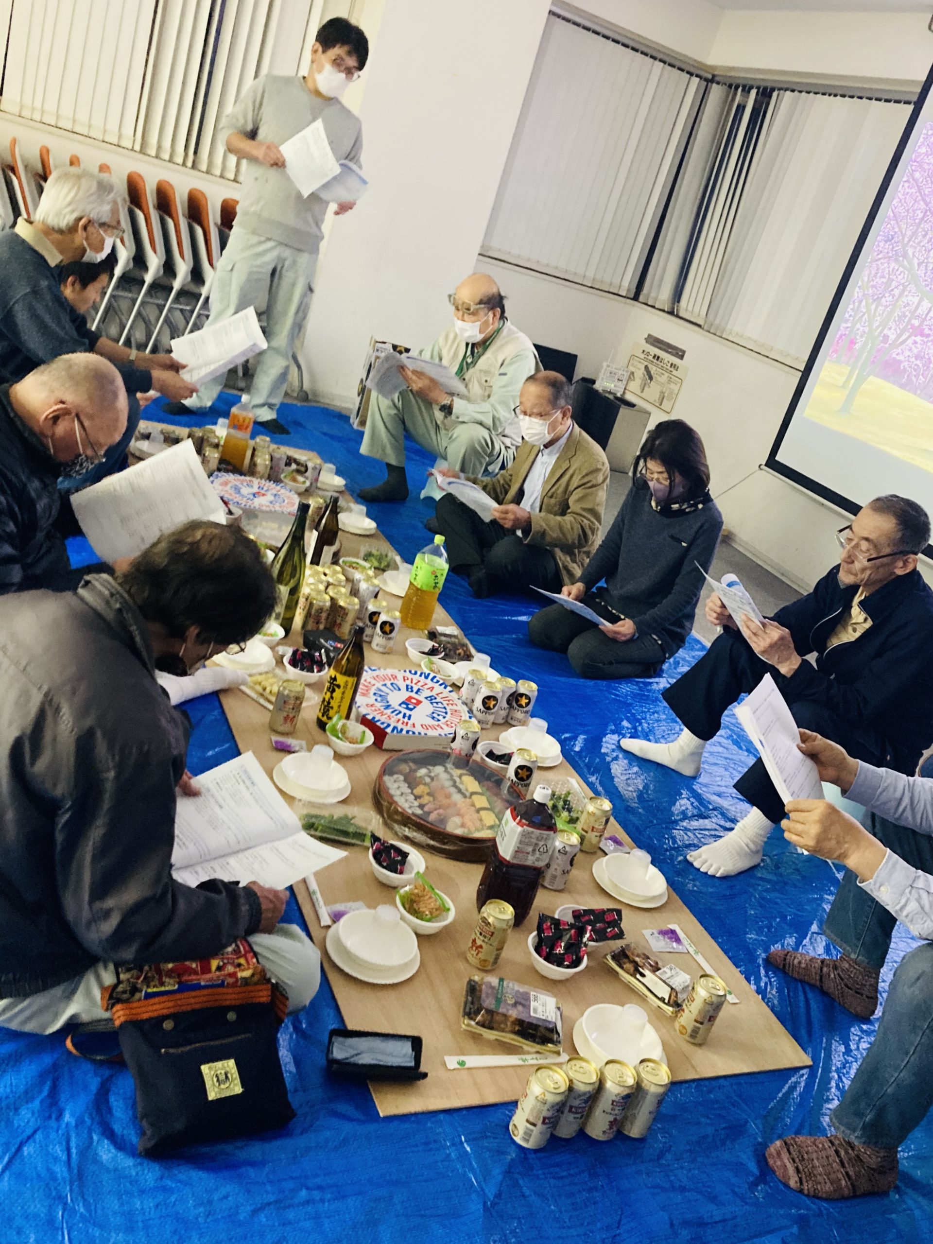 今年は告知通り外へ出ず、事務所の3階会議室にビニールシートを敷いてコンパネをテーブル代わりにし、おでん・寿司・ピザ・焼き鳥・唐揚げ・漬け物と、ビール・日本酒・焼酎・お茶・なっちゃんを準備して、お花見形式にしてみましたよ。