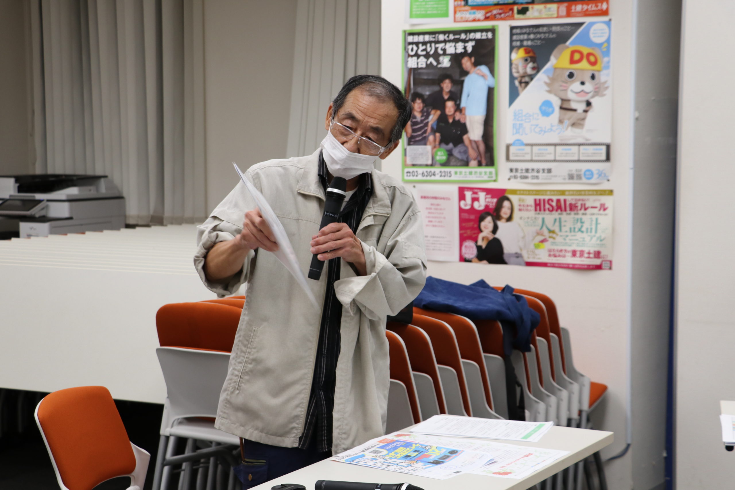 ほんの少し場が暖かくなったところで組合の基本「東京土建綱領」の読み合わせ。
