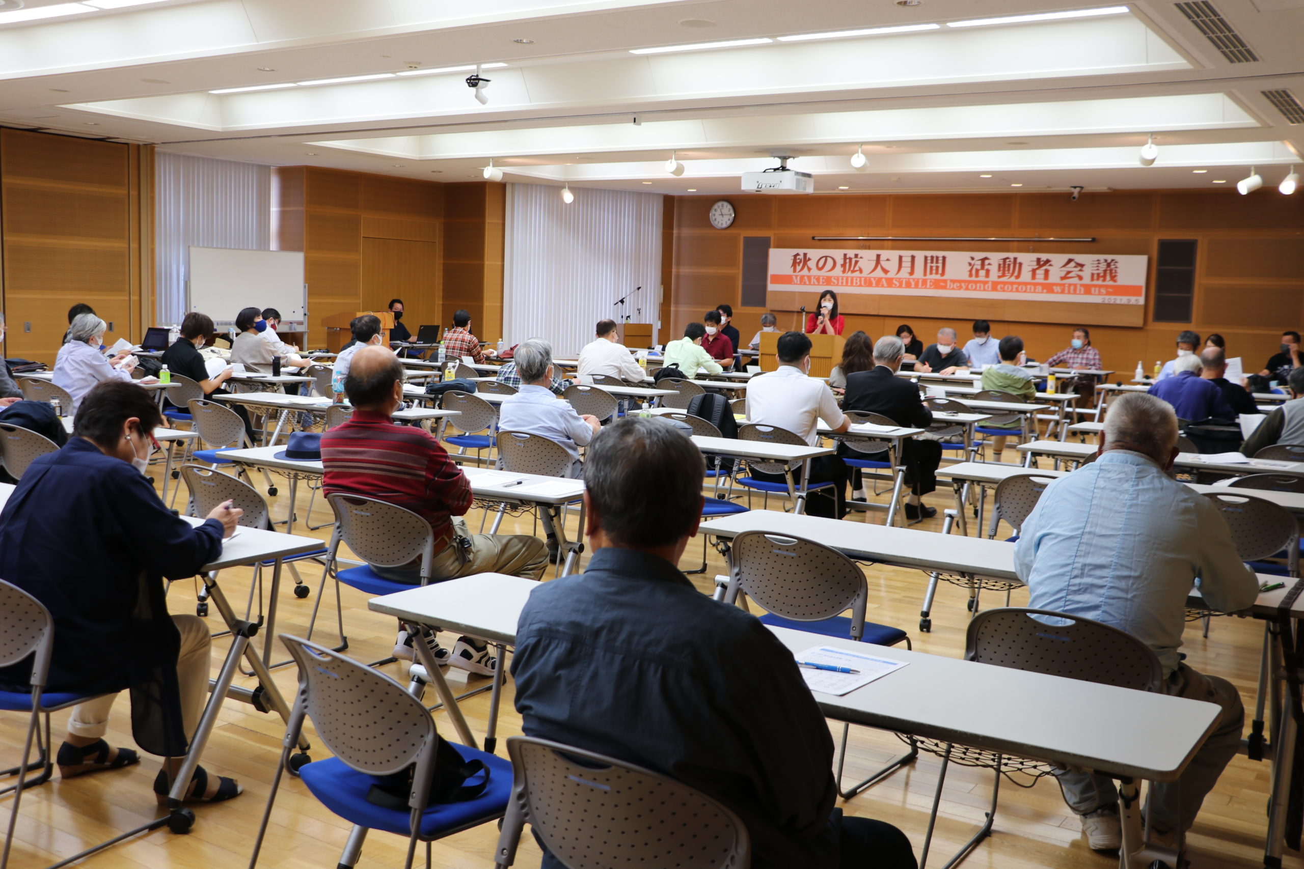 秋の拡大月間活動者会議が9月5日午前、45人が参加して本部会館で行われました。