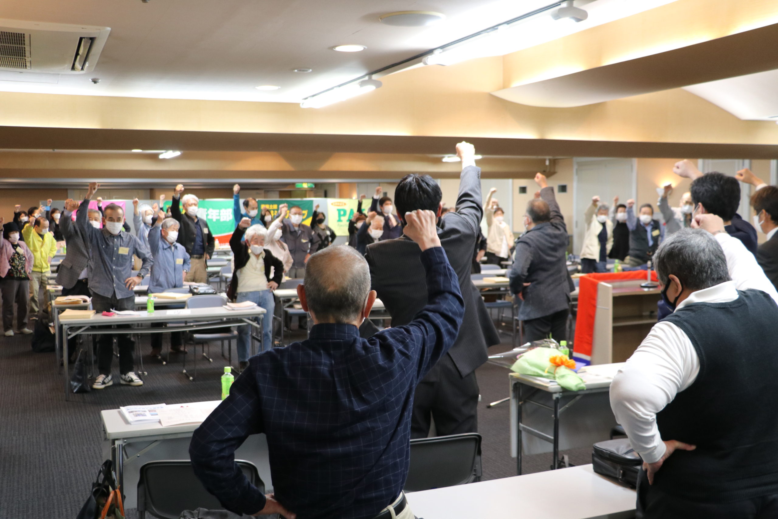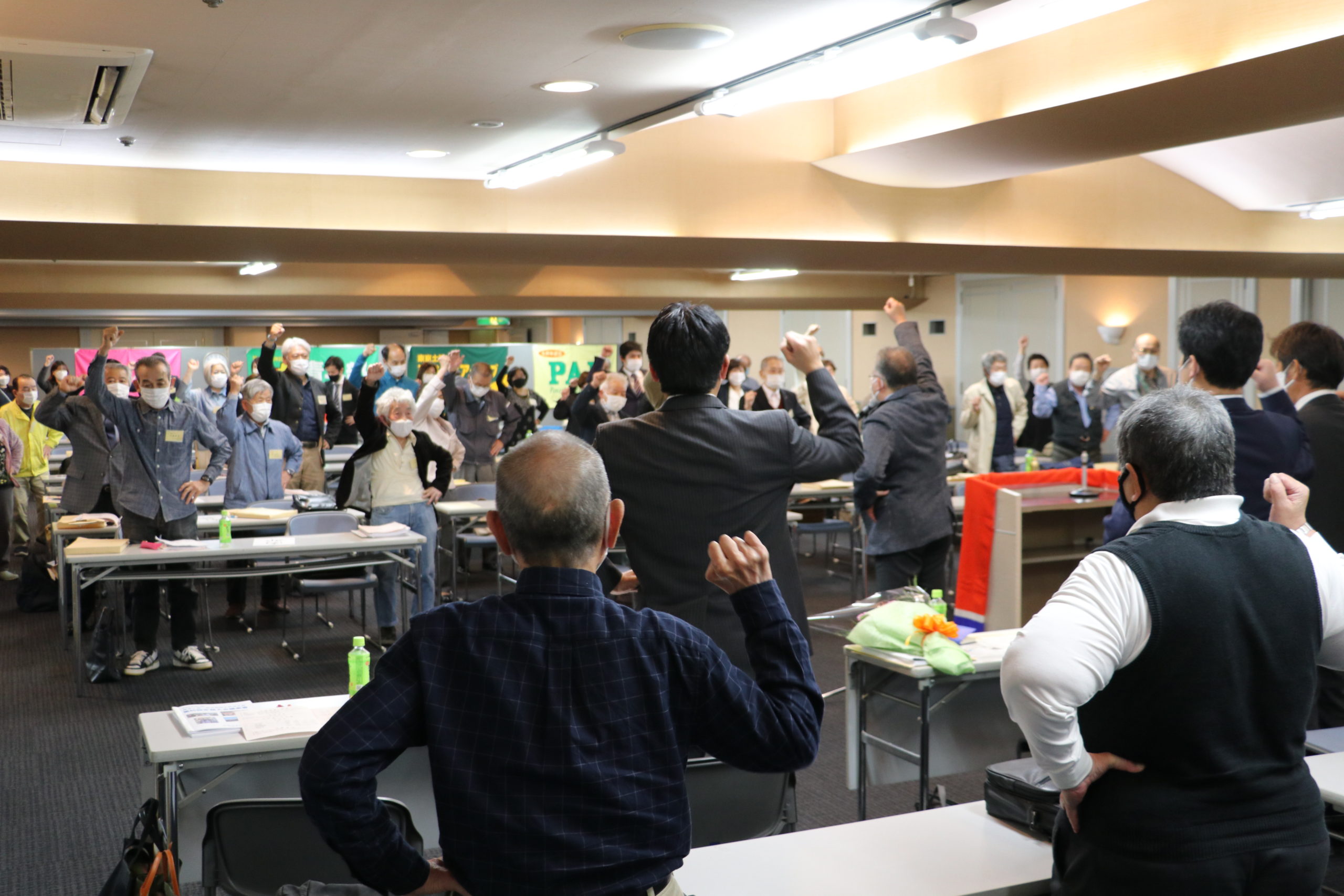 終盤は佐藤大会書記によるスローガンの読み上げ。みんなの「よし!」が会場に響きます。
