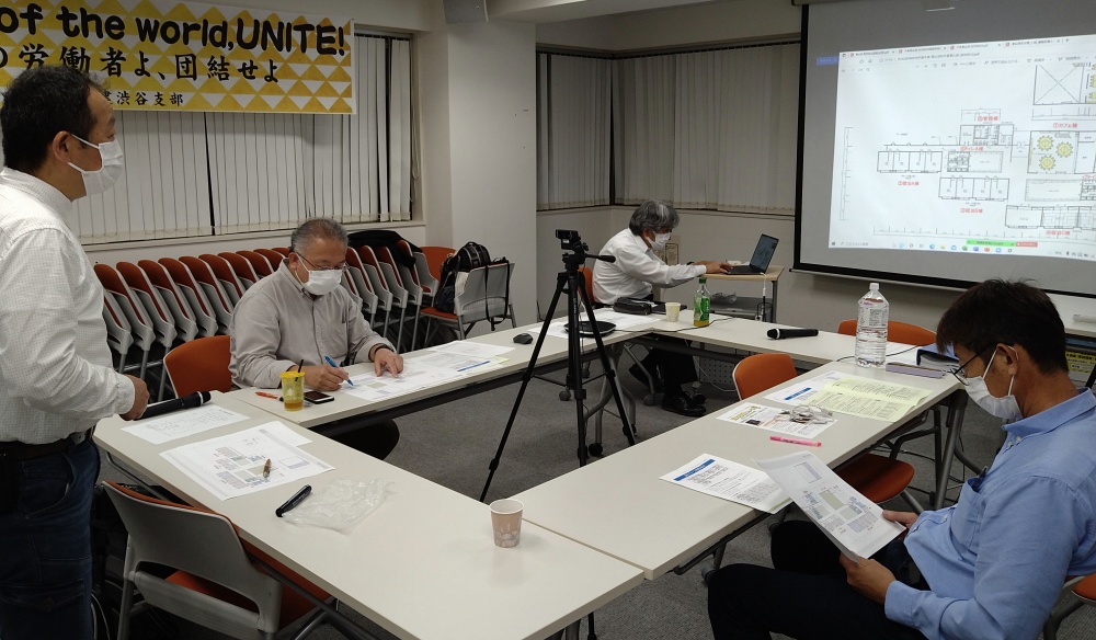 1回目の今回は支部の取組み報告の他に学習会として、渋谷支部の組合員さん3人が手掛けた南房総のちくらつなぐホテル改築工事の報告を行っていただきました。