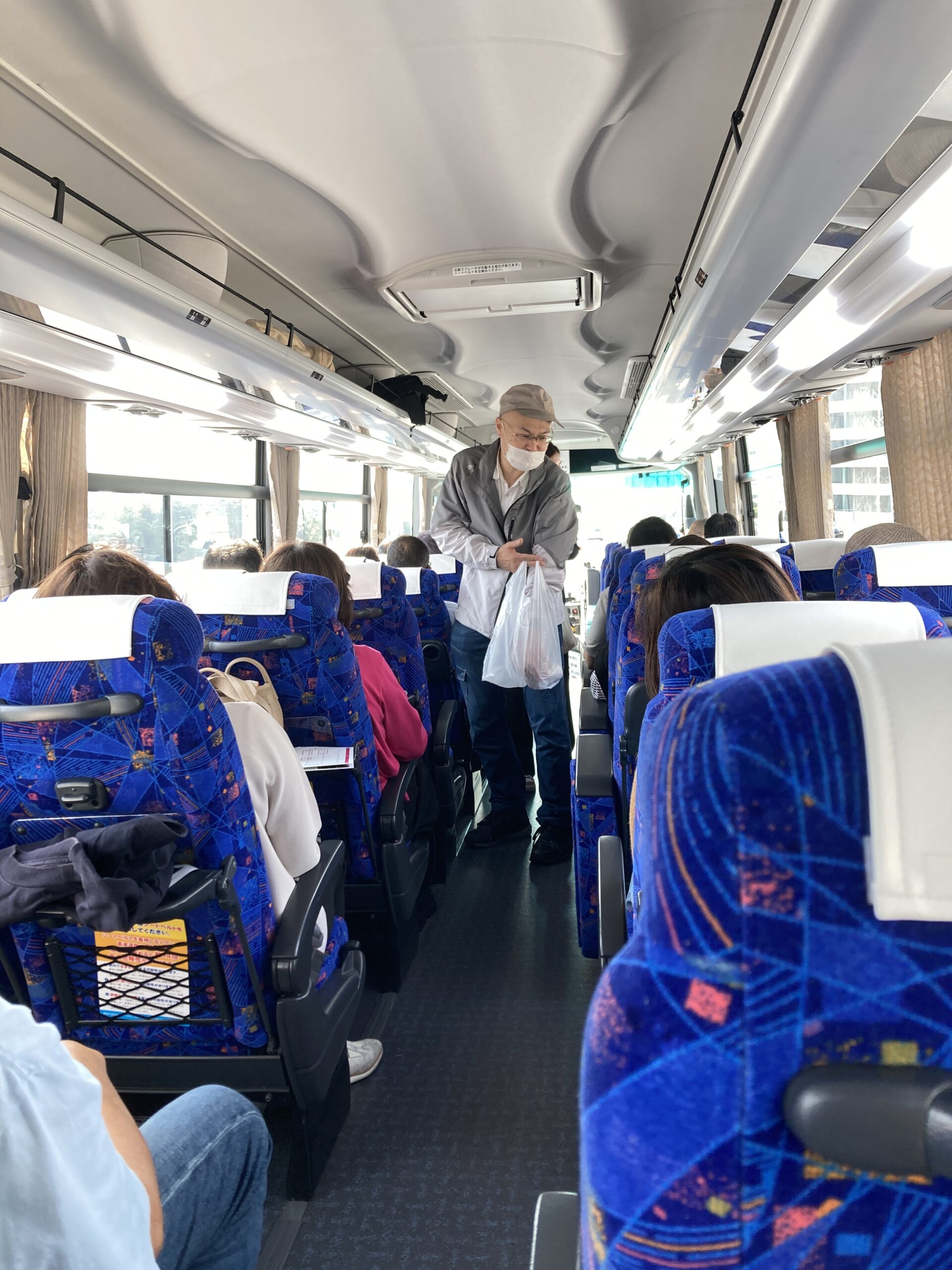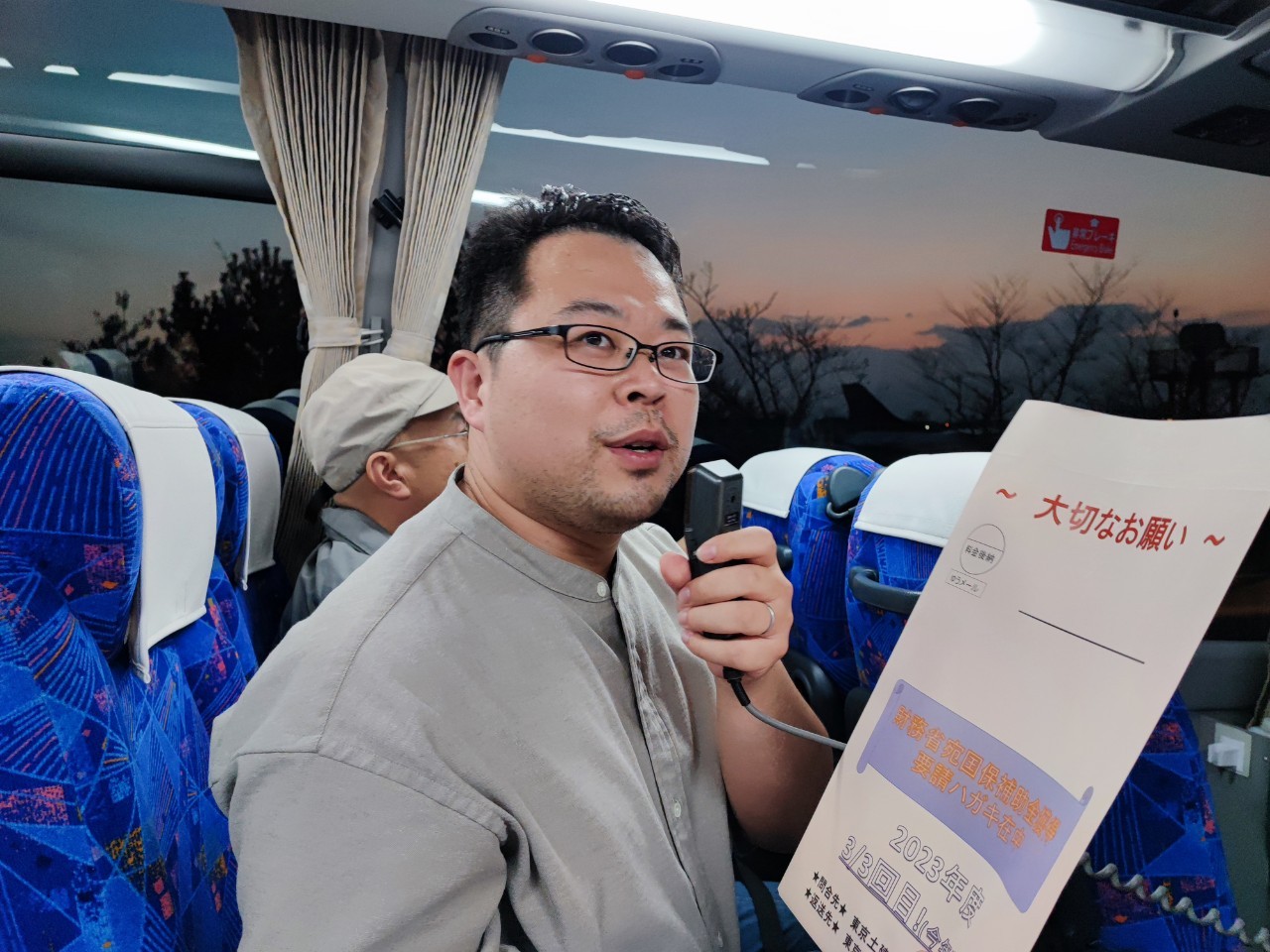 帰りのバスで、小松書記が予算要求ハガキへのご協力の訴え。