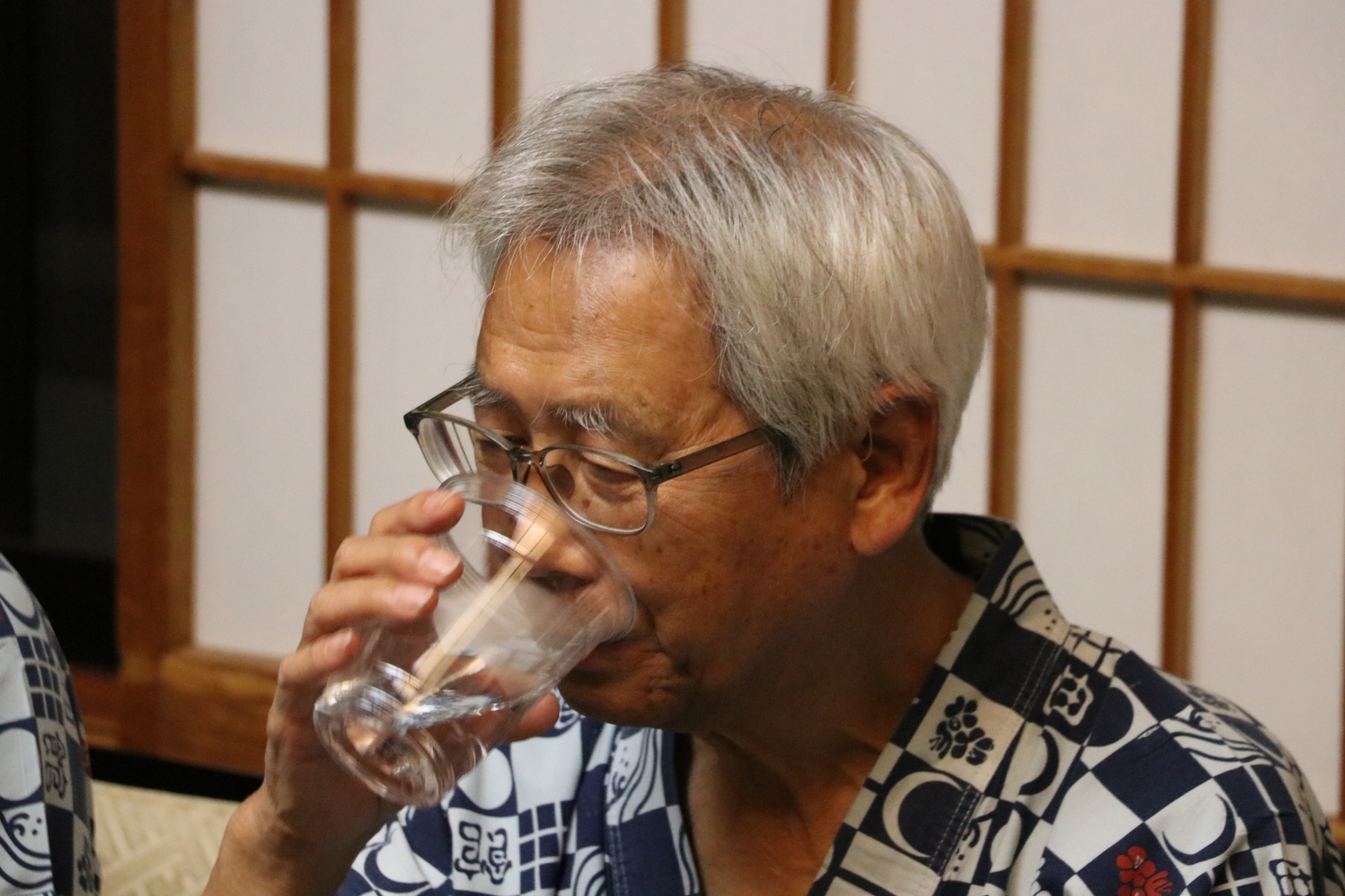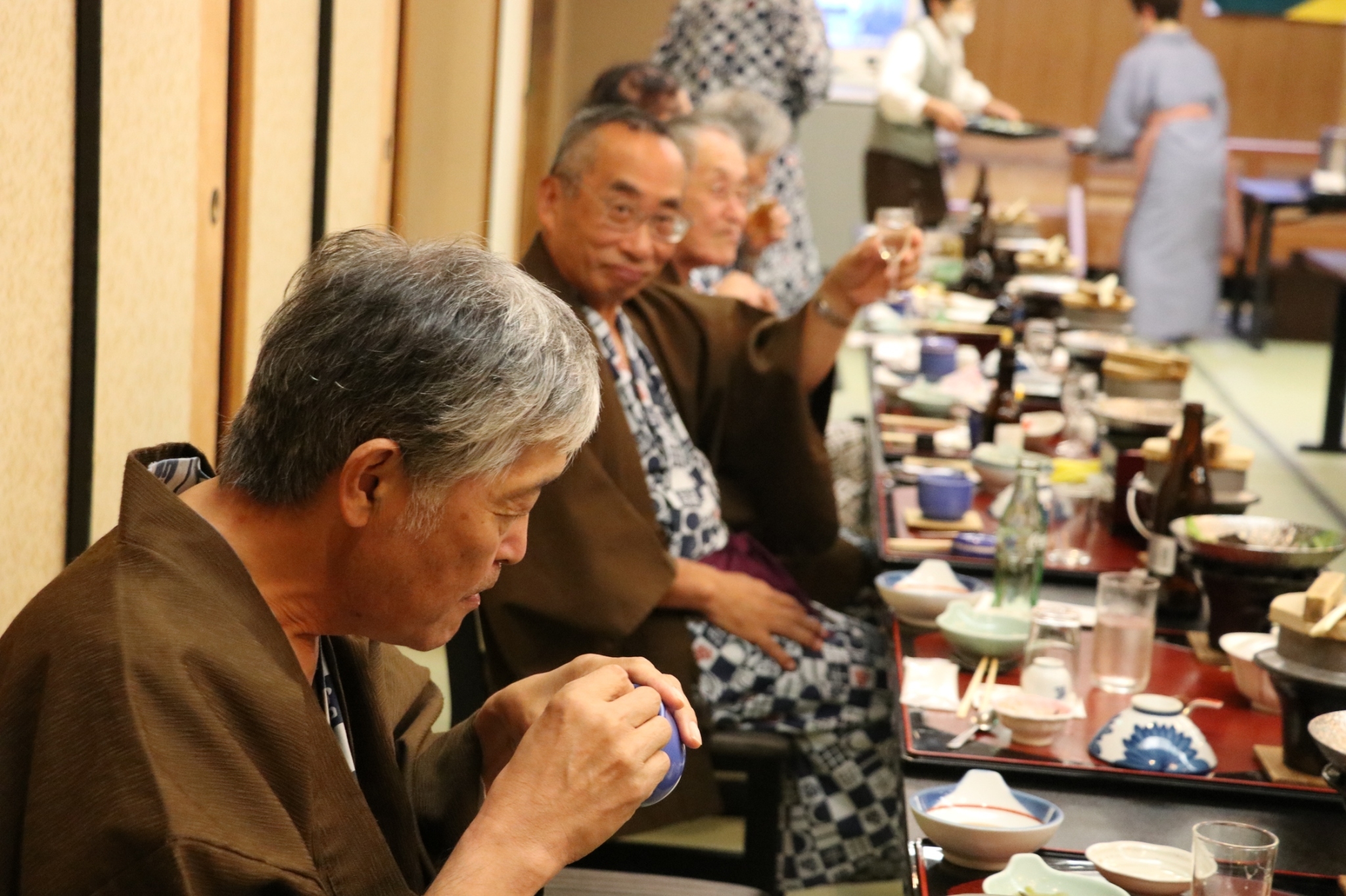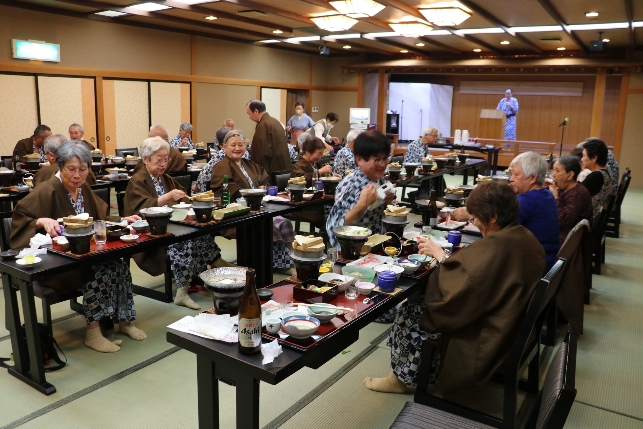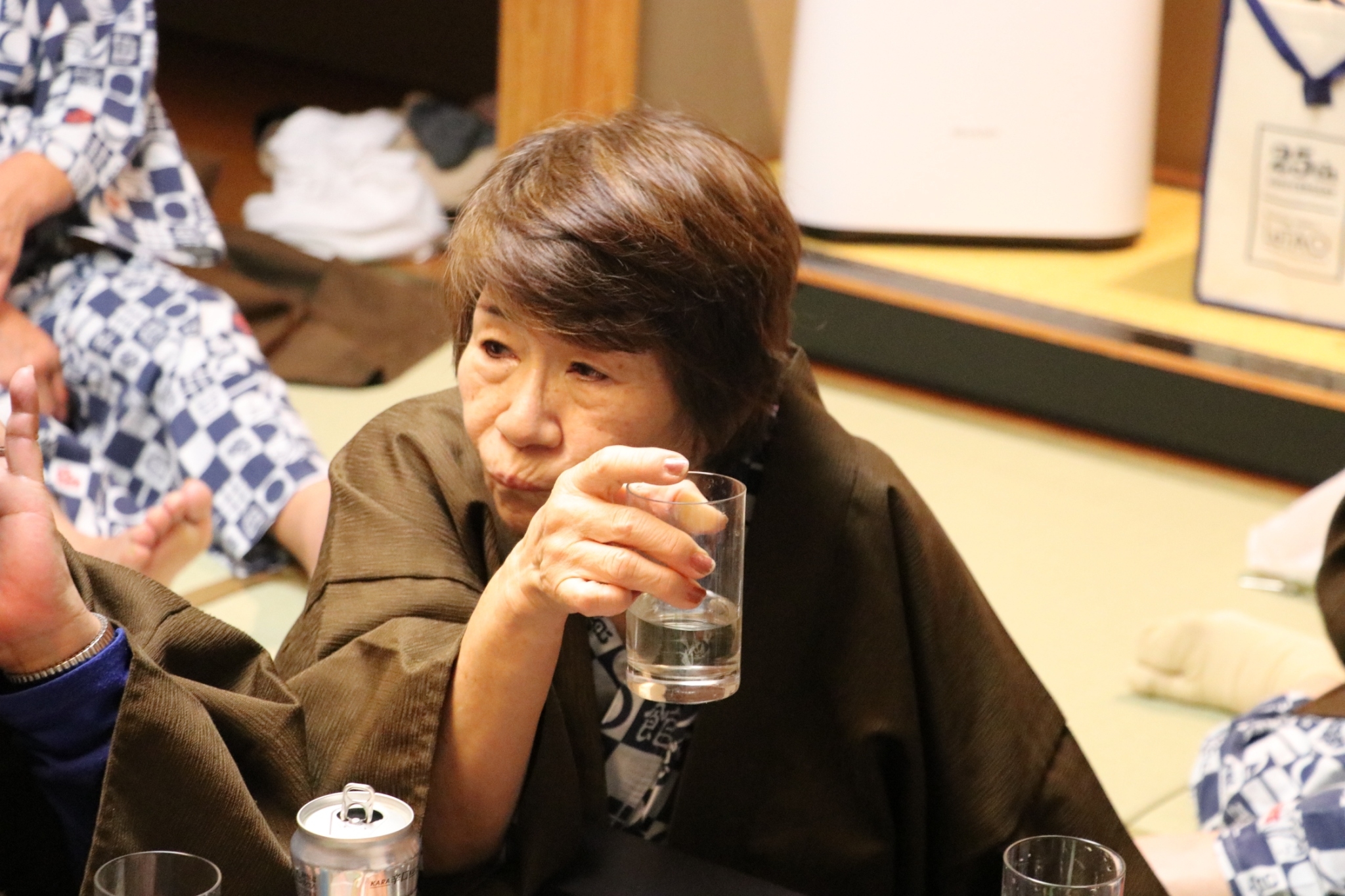 食後、仲居さんがお薬用のお水や爪楊枝を配ってくれました。「歯がないから楊枝はいらない」という組合員さんの声が聞こえました。