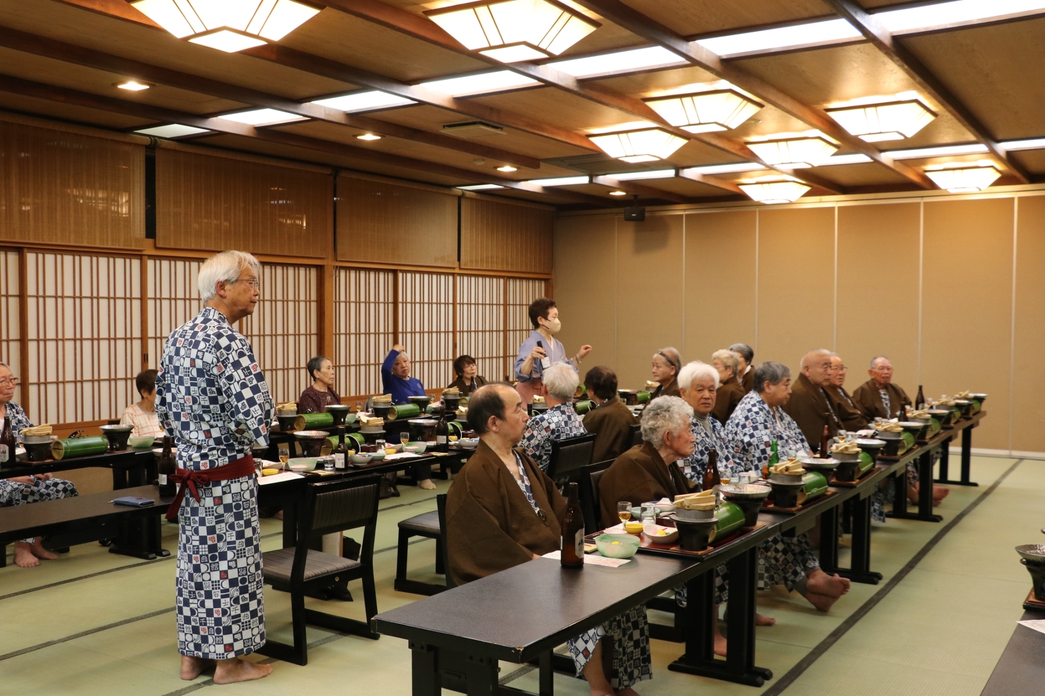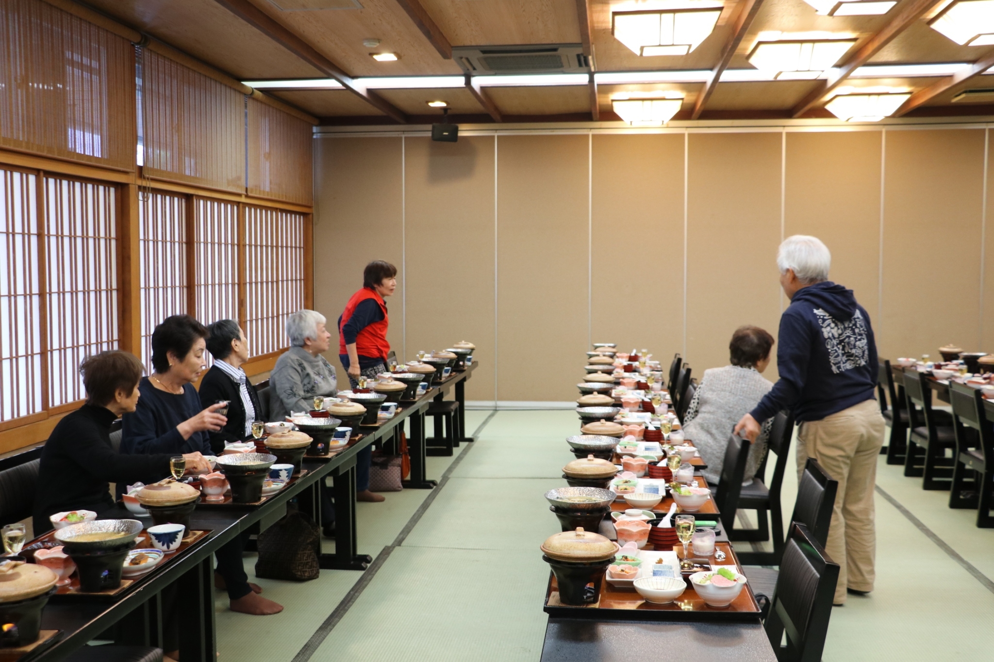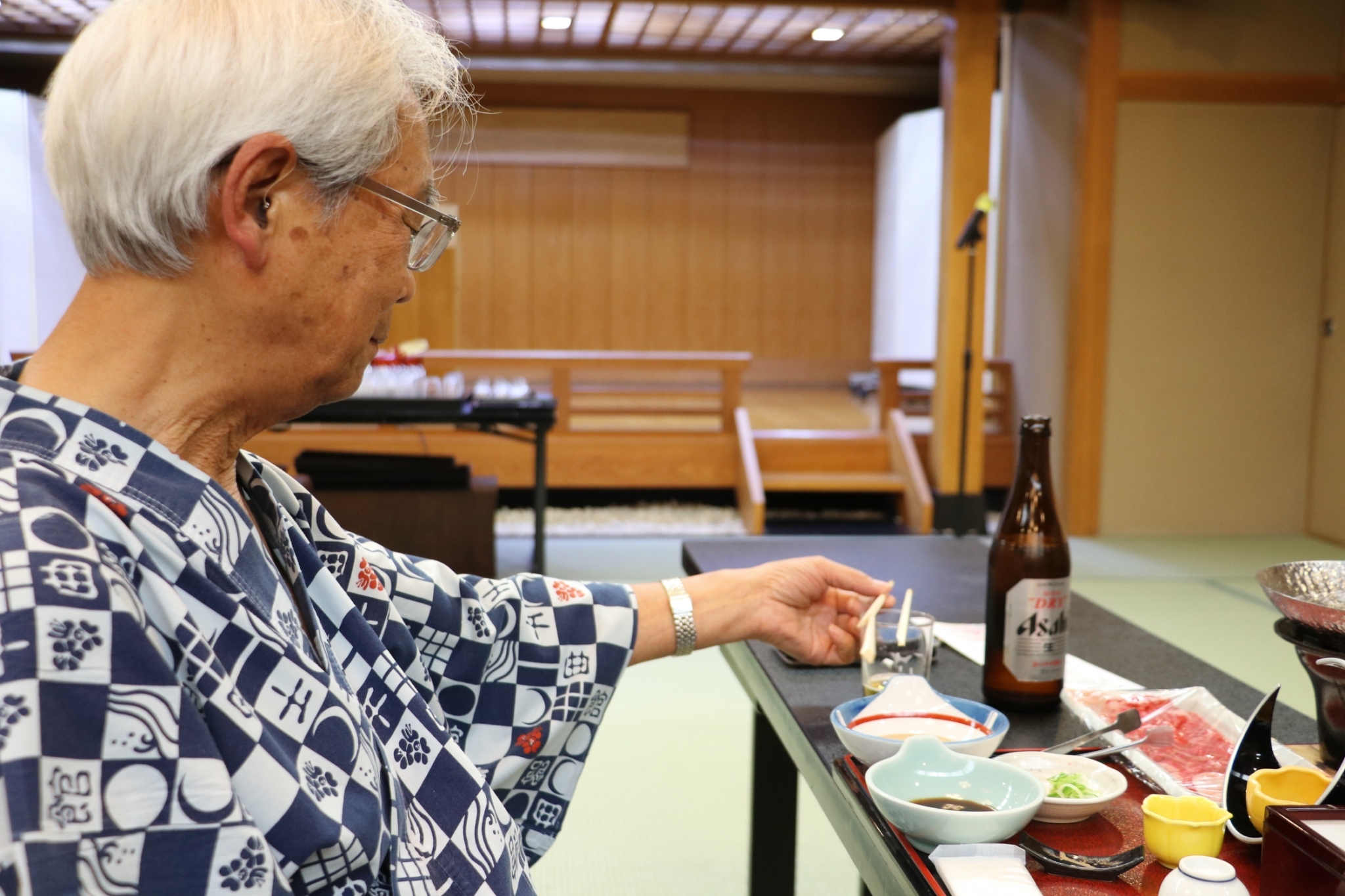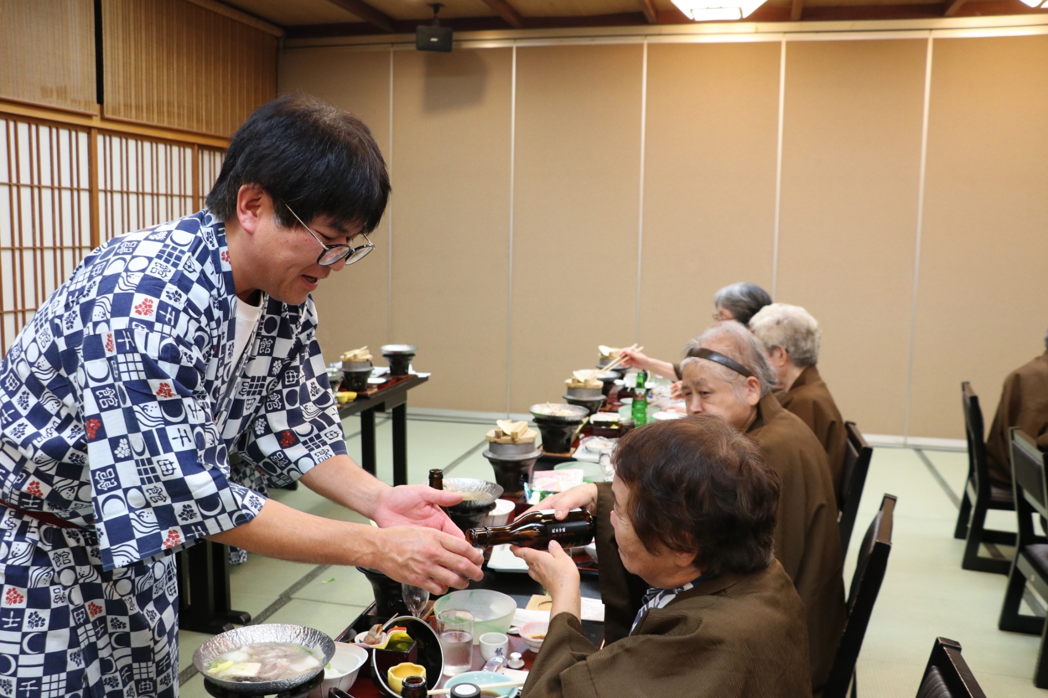 食後、仲居さんがお薬用のお水や爪楊枝を配ってくれました。「歯がないから楊枝はいらない」という組合員さんの声が聞こえました。