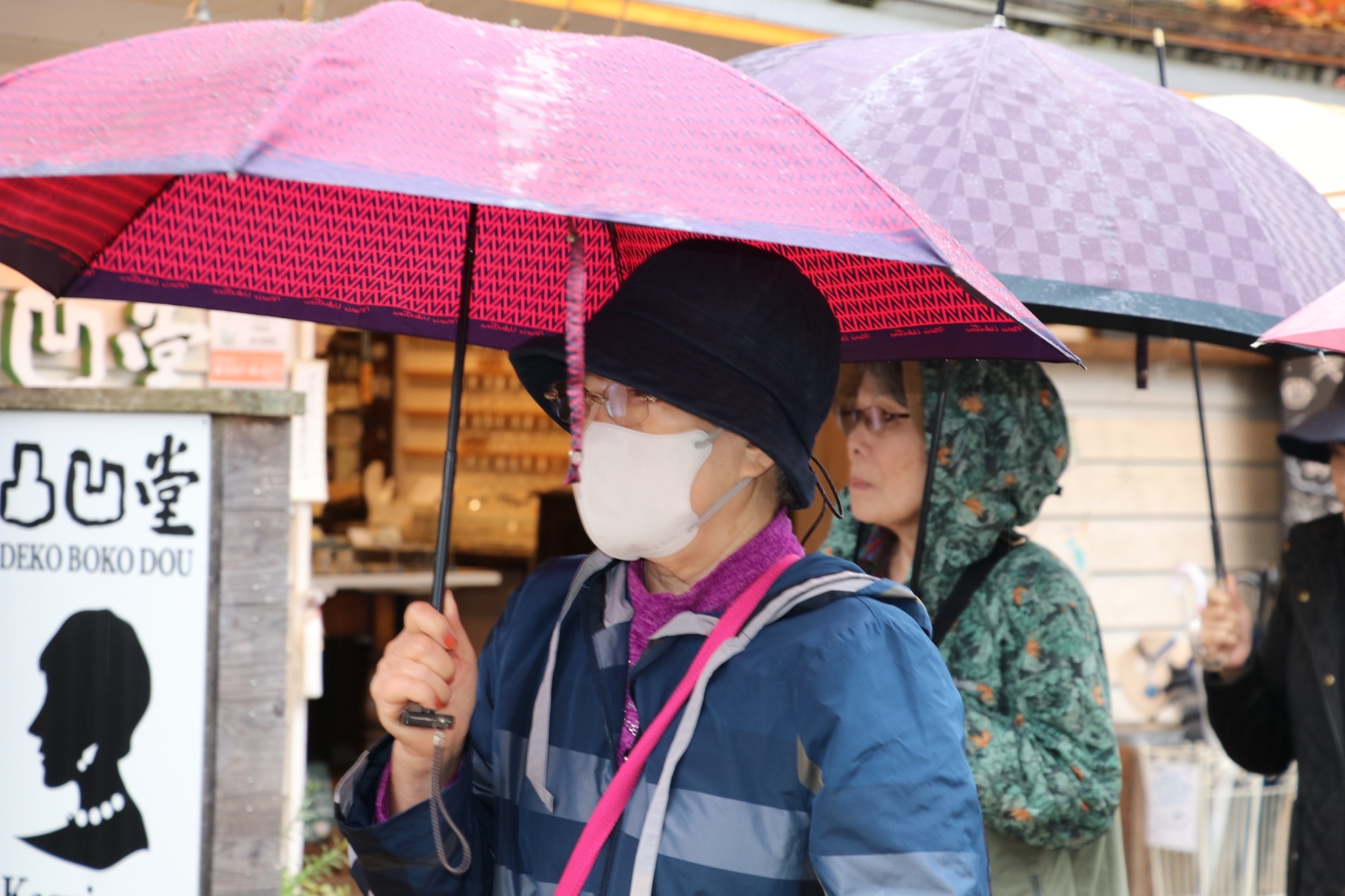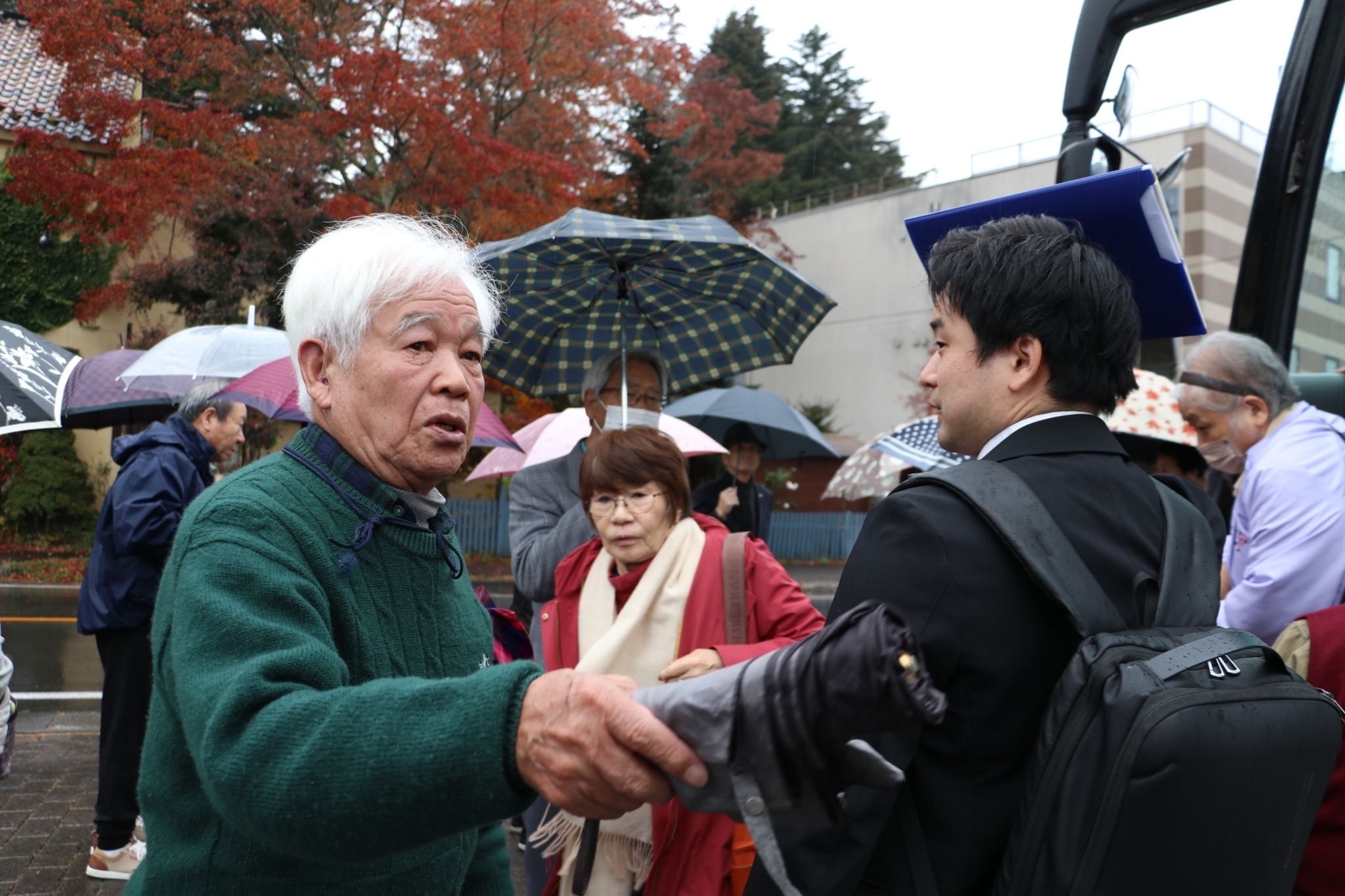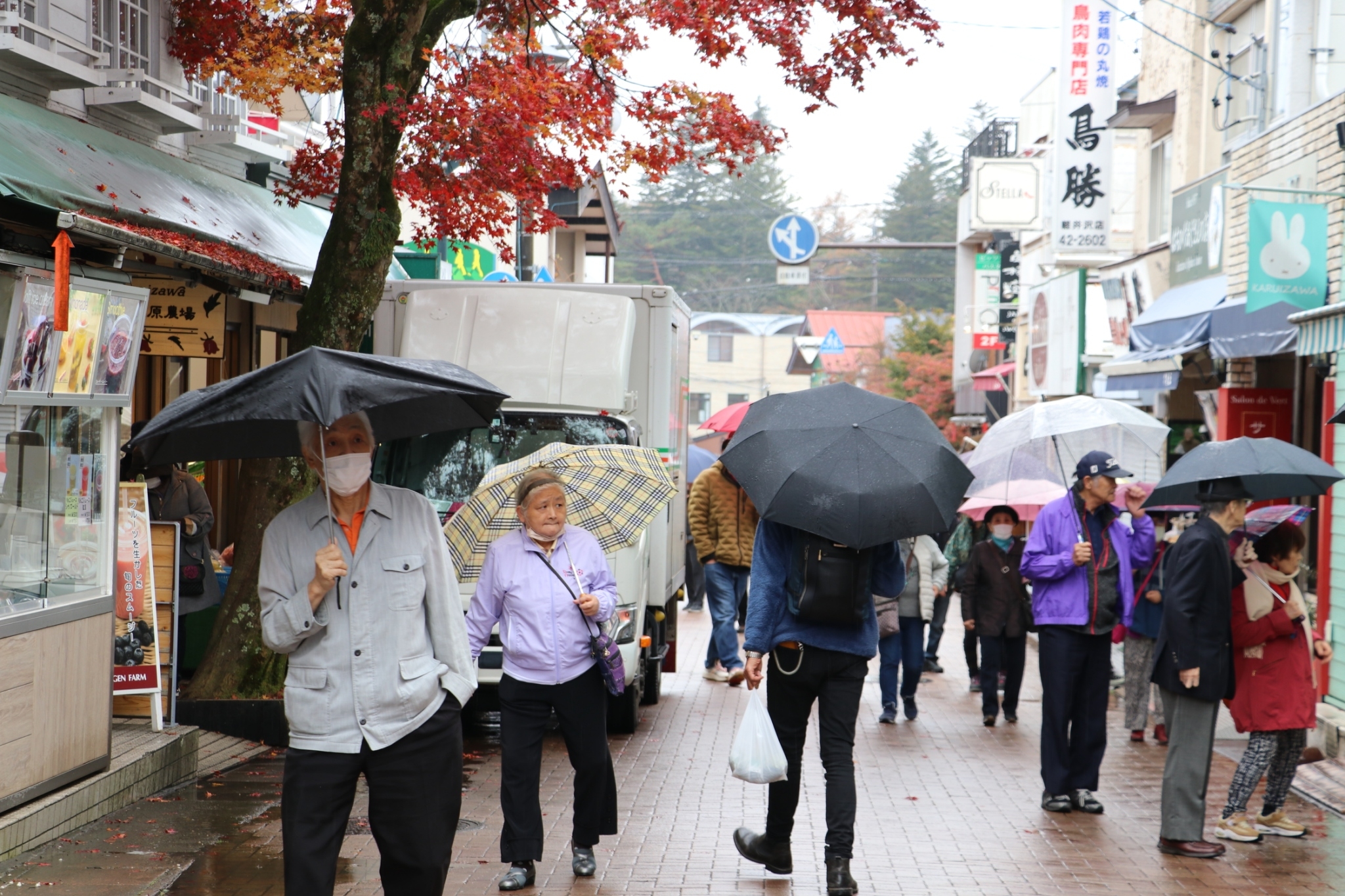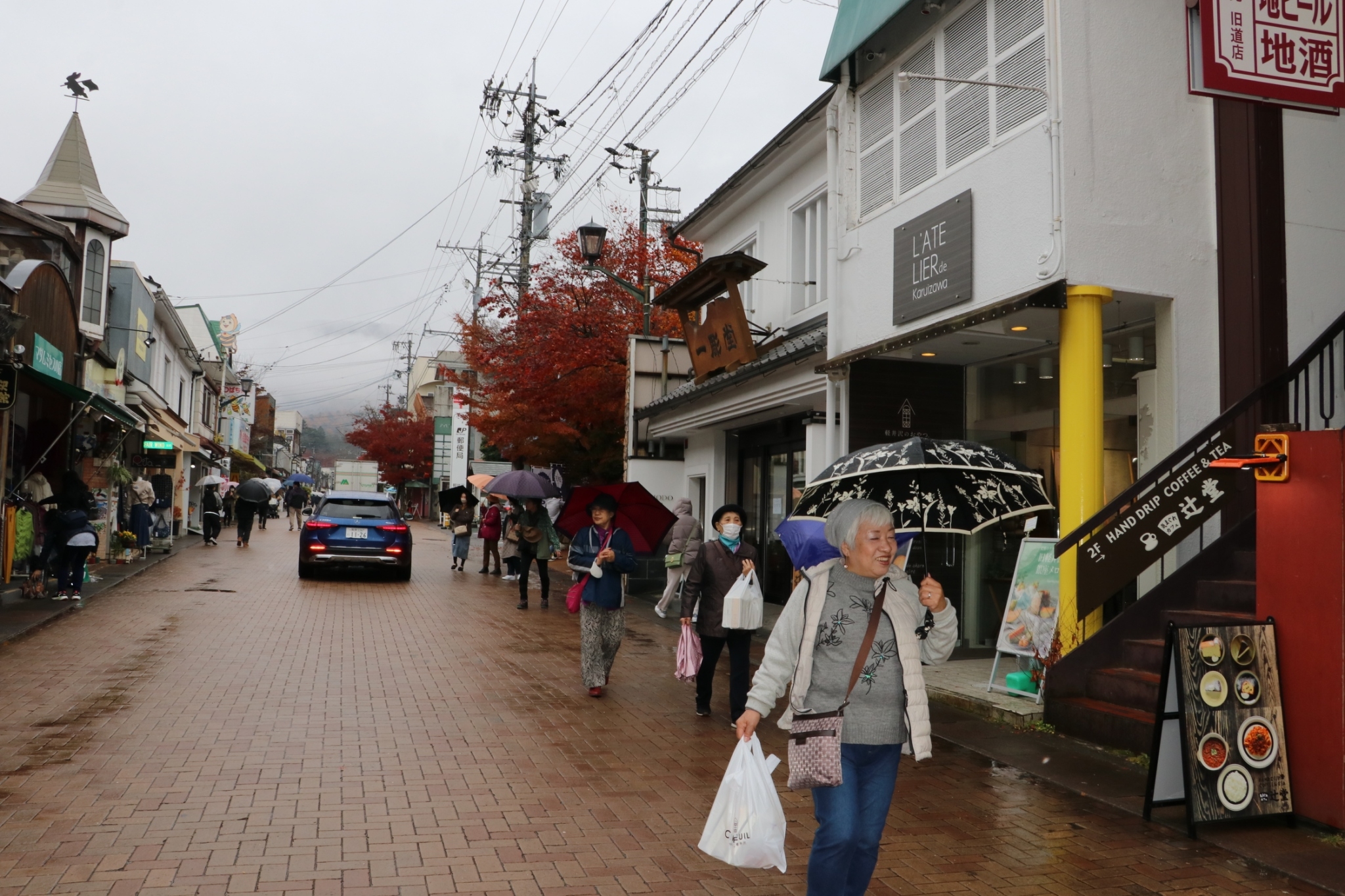 霧雨の中、旧軽井沢へ。車内で加藤会長が「足腰の痛かった方、温泉に浸かってどうでしたか?」と聞くと、皆さん元気に「治ったよー」と返事をしていました。