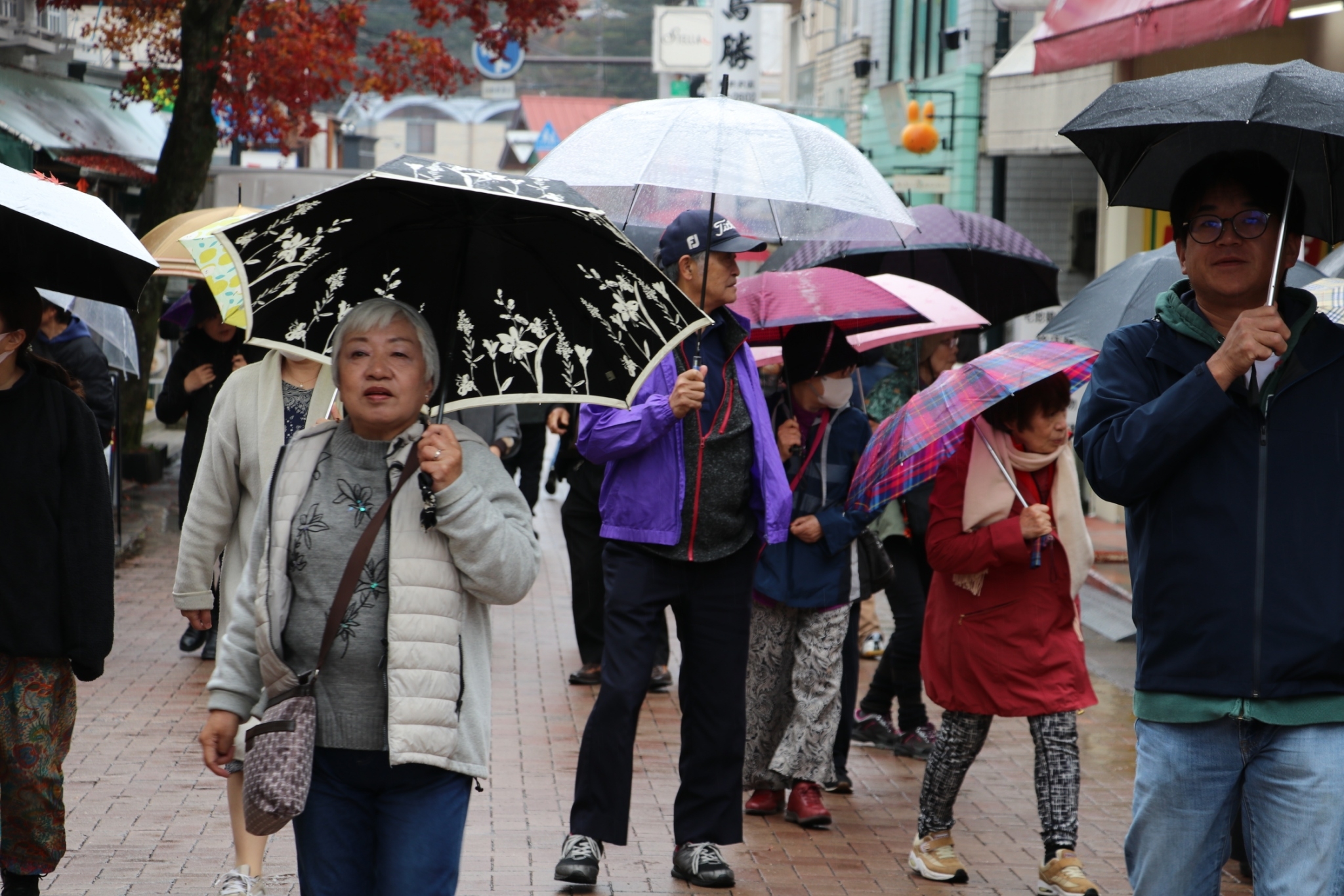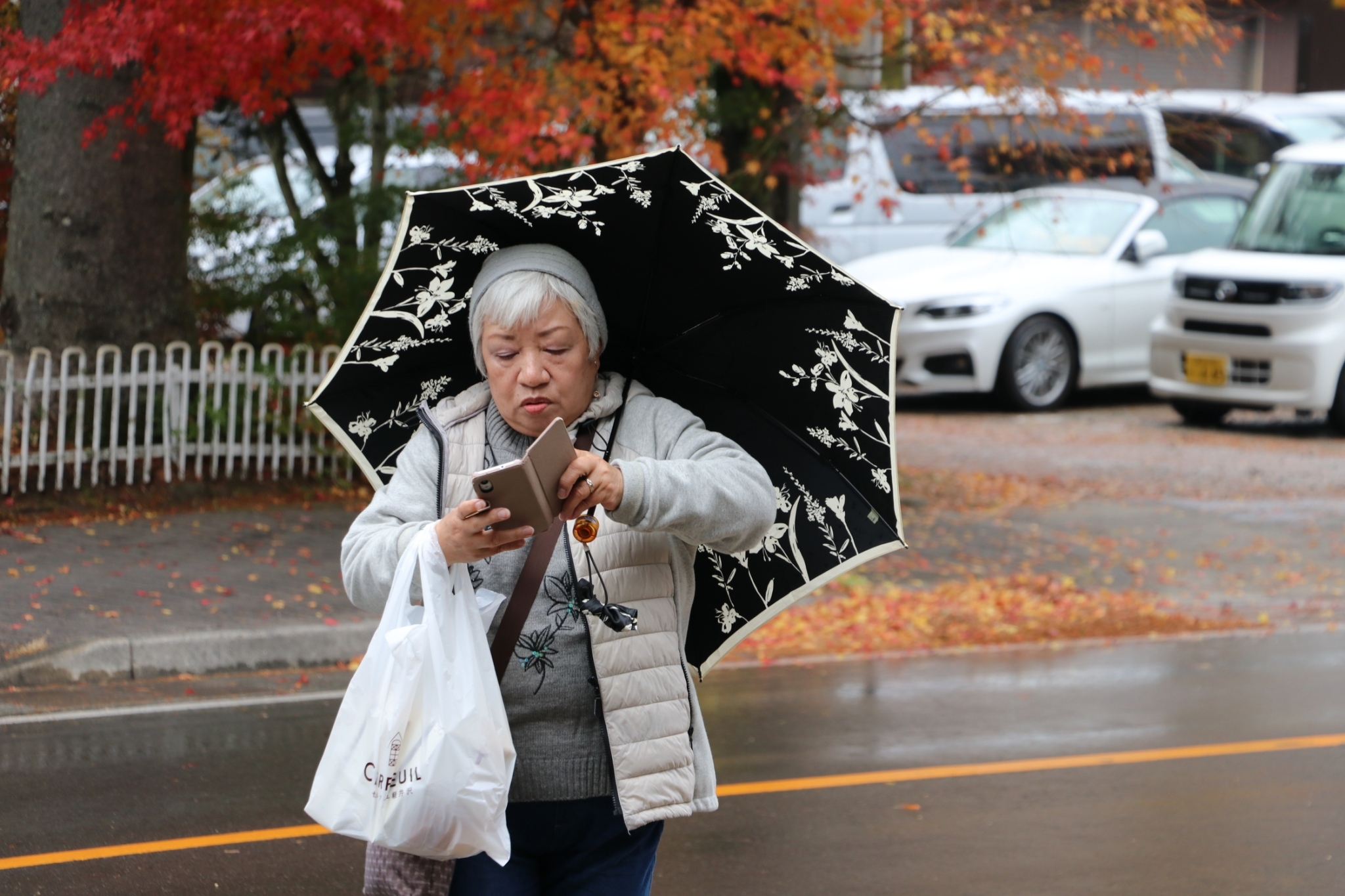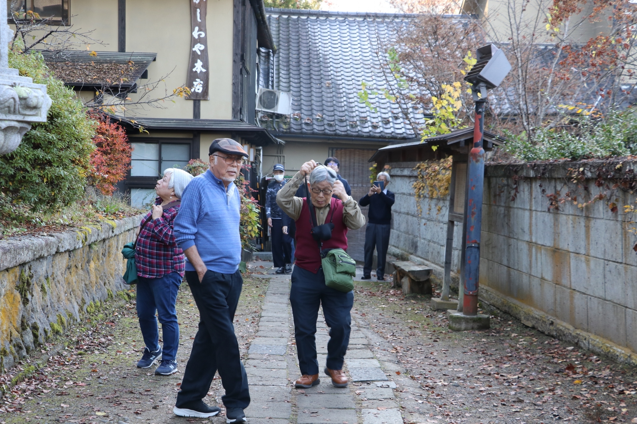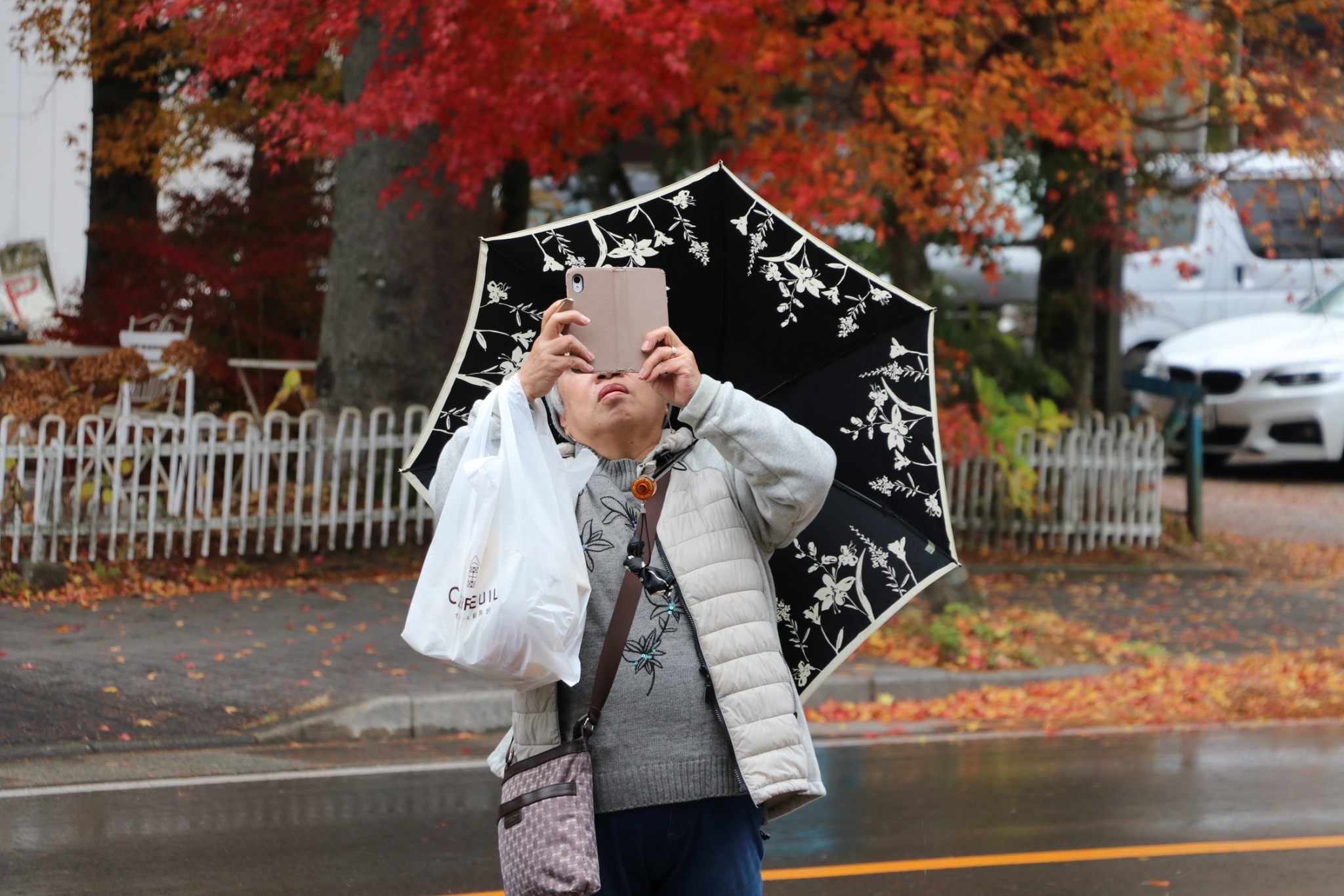 霧雨の中、旧軽井沢へ。車内で加藤会長が「足腰の痛かった方、温泉に浸かってどうでしたか?」と聞くと、皆さん元気に「治ったよー」と返事をしていました。