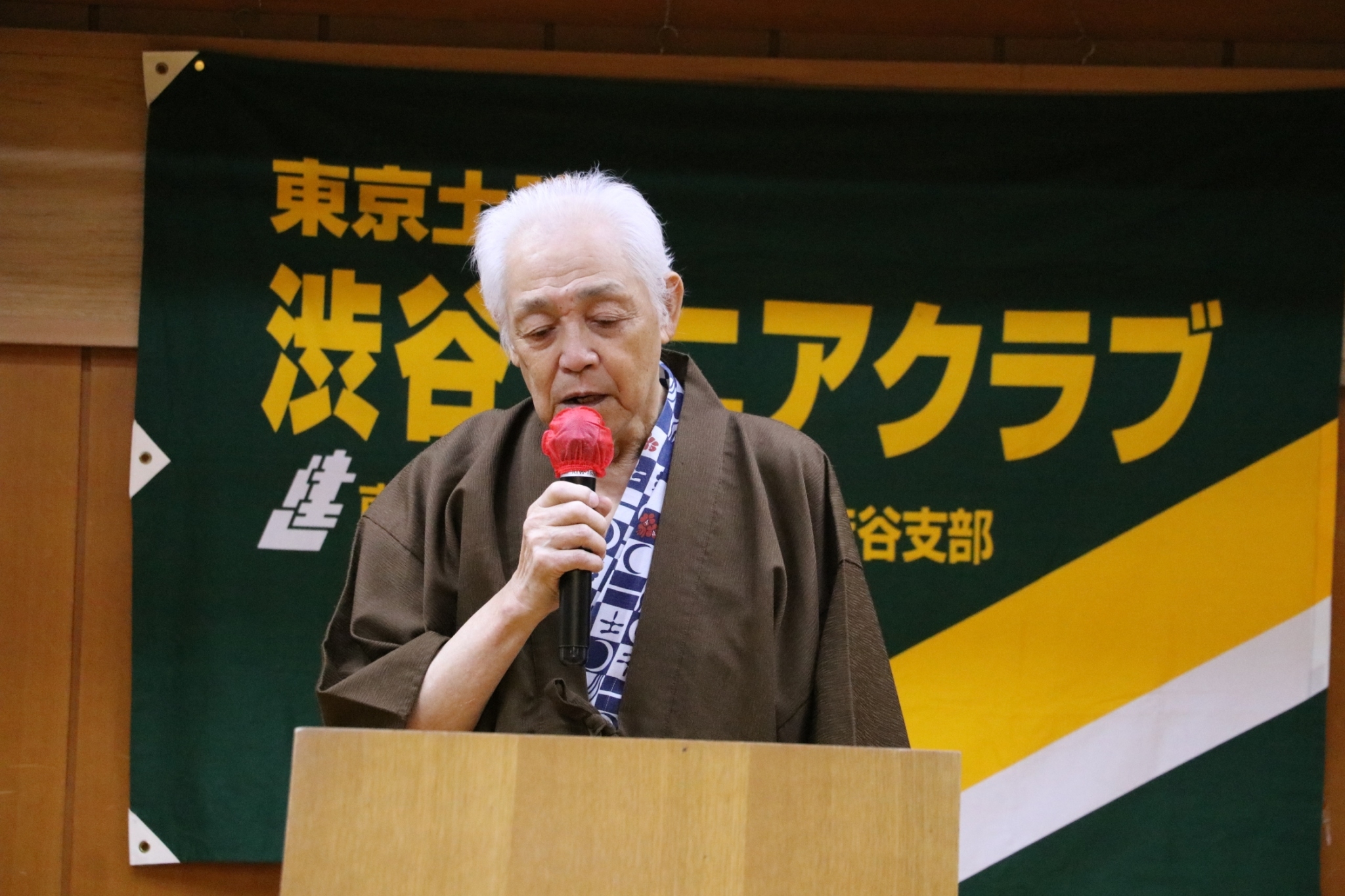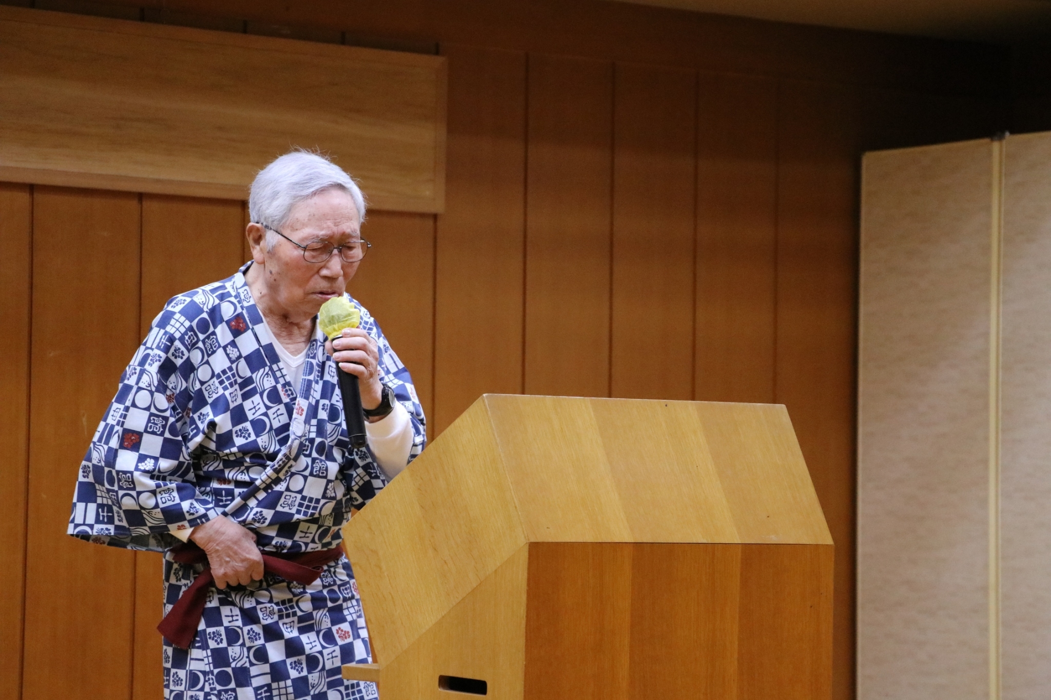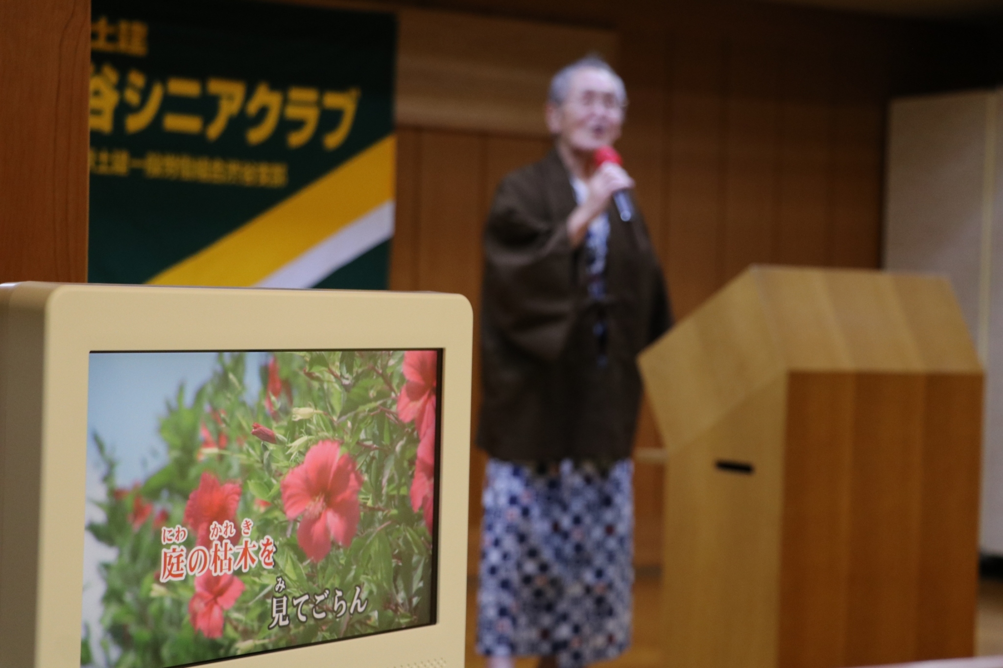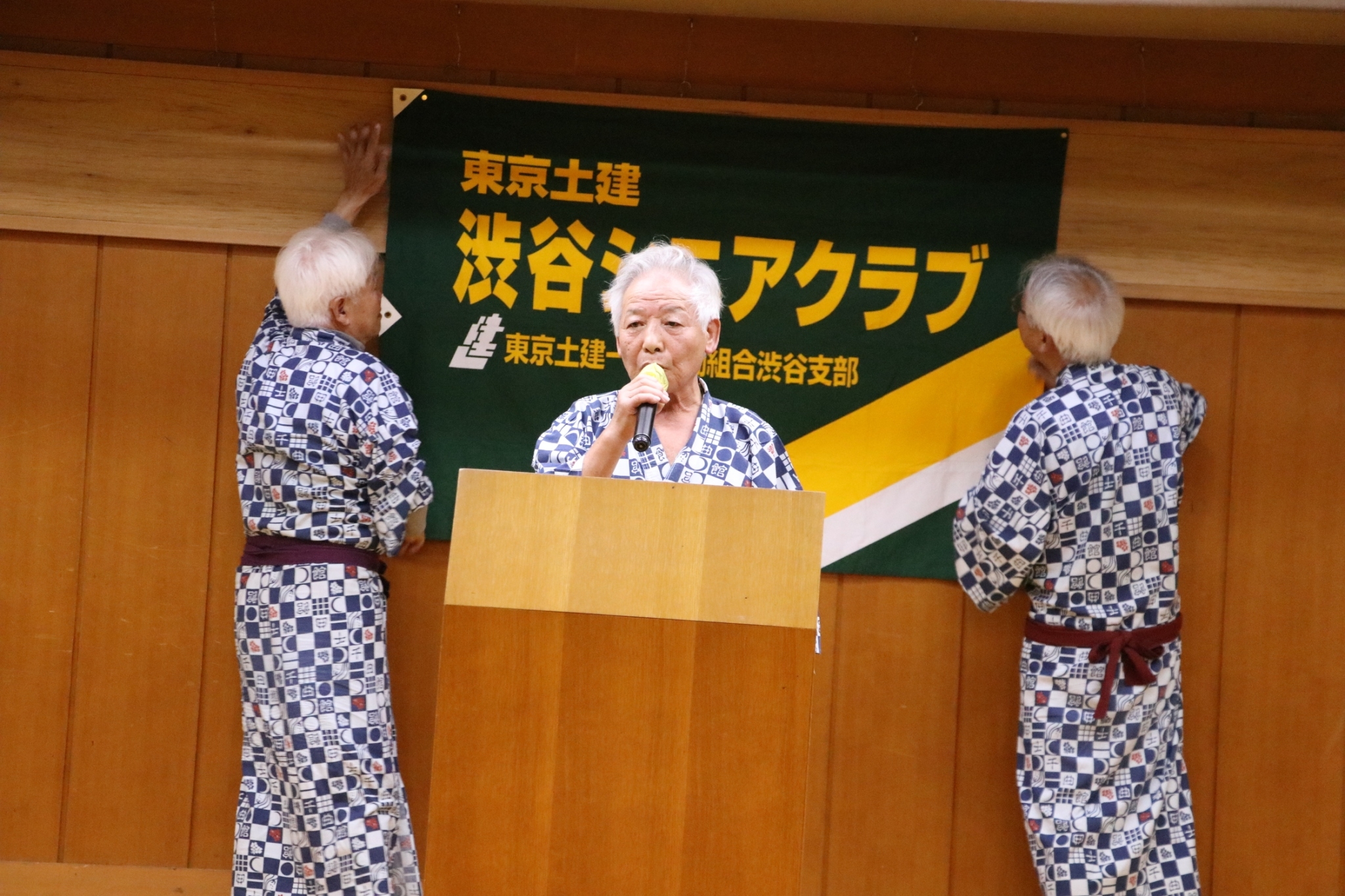 シニアクラブの旗を舞台に飾ったら総会みたいになりました。