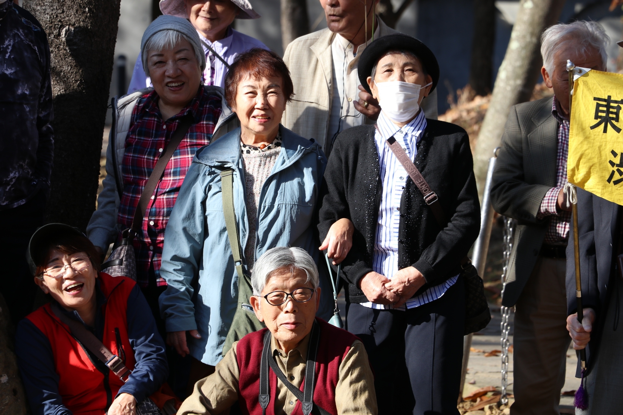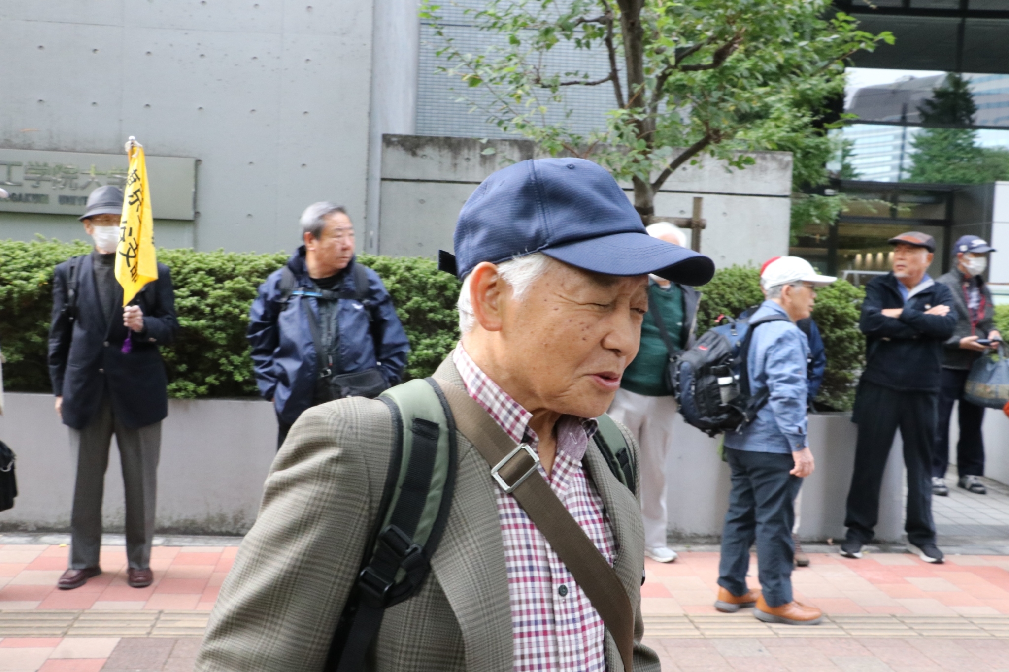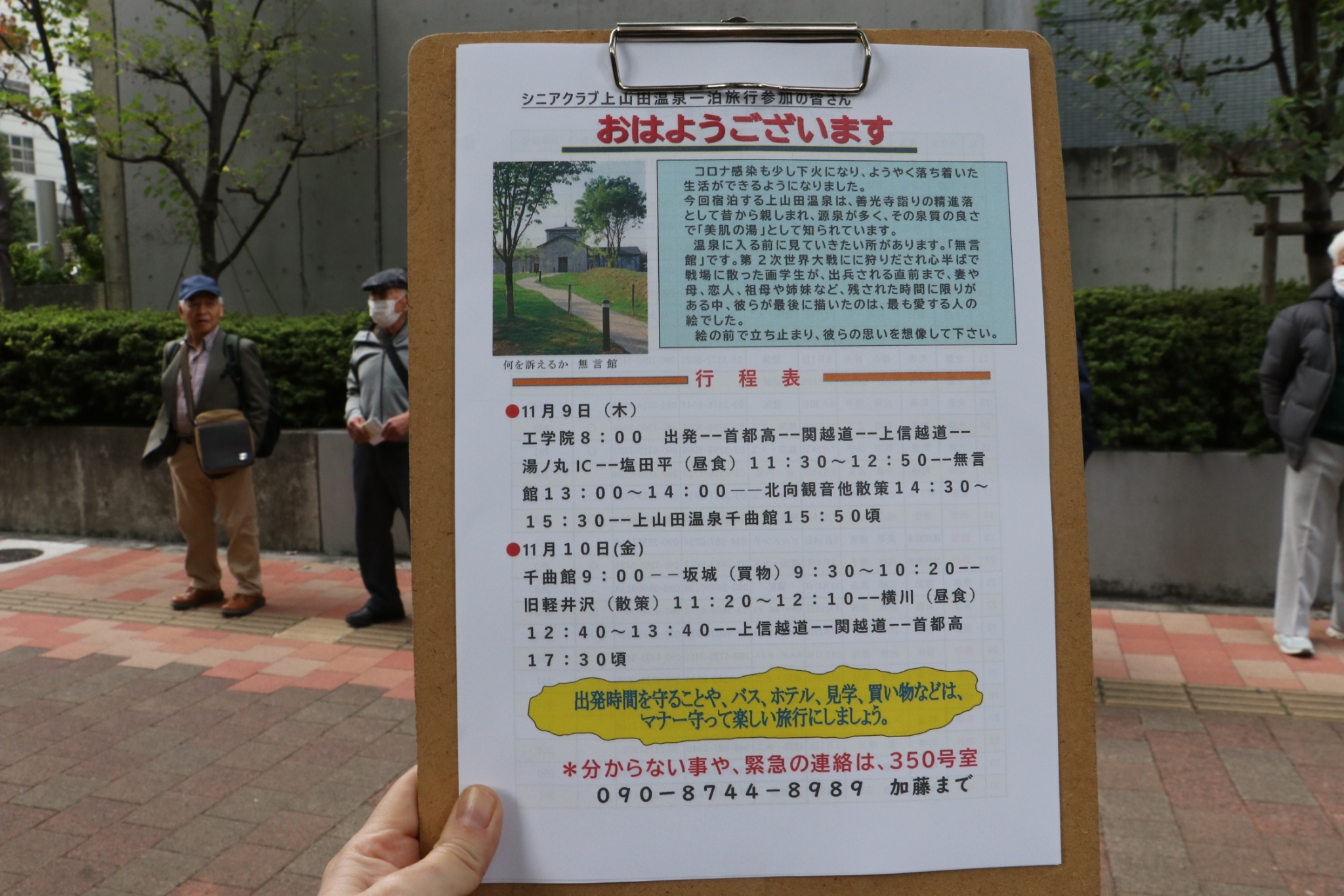 7時10分、シニアの旗やカメラを担いで集合場所の新宿工学院前に到着。7時半集合8時出発の予定でしたが、ほとんどの方がお揃いでした。中には6時半から待っている方も。