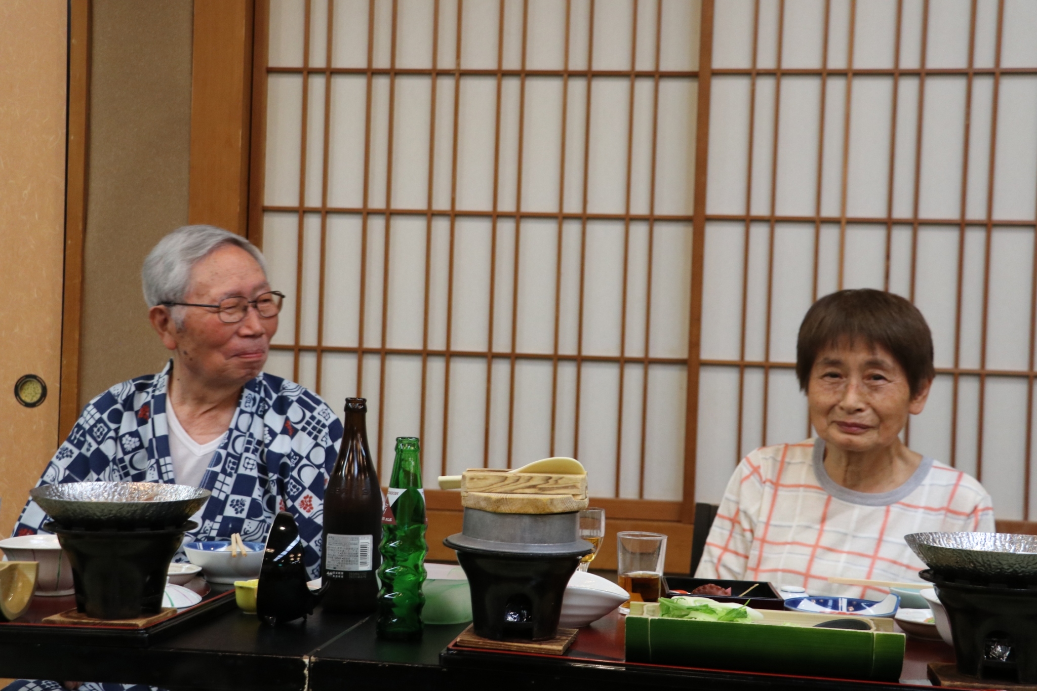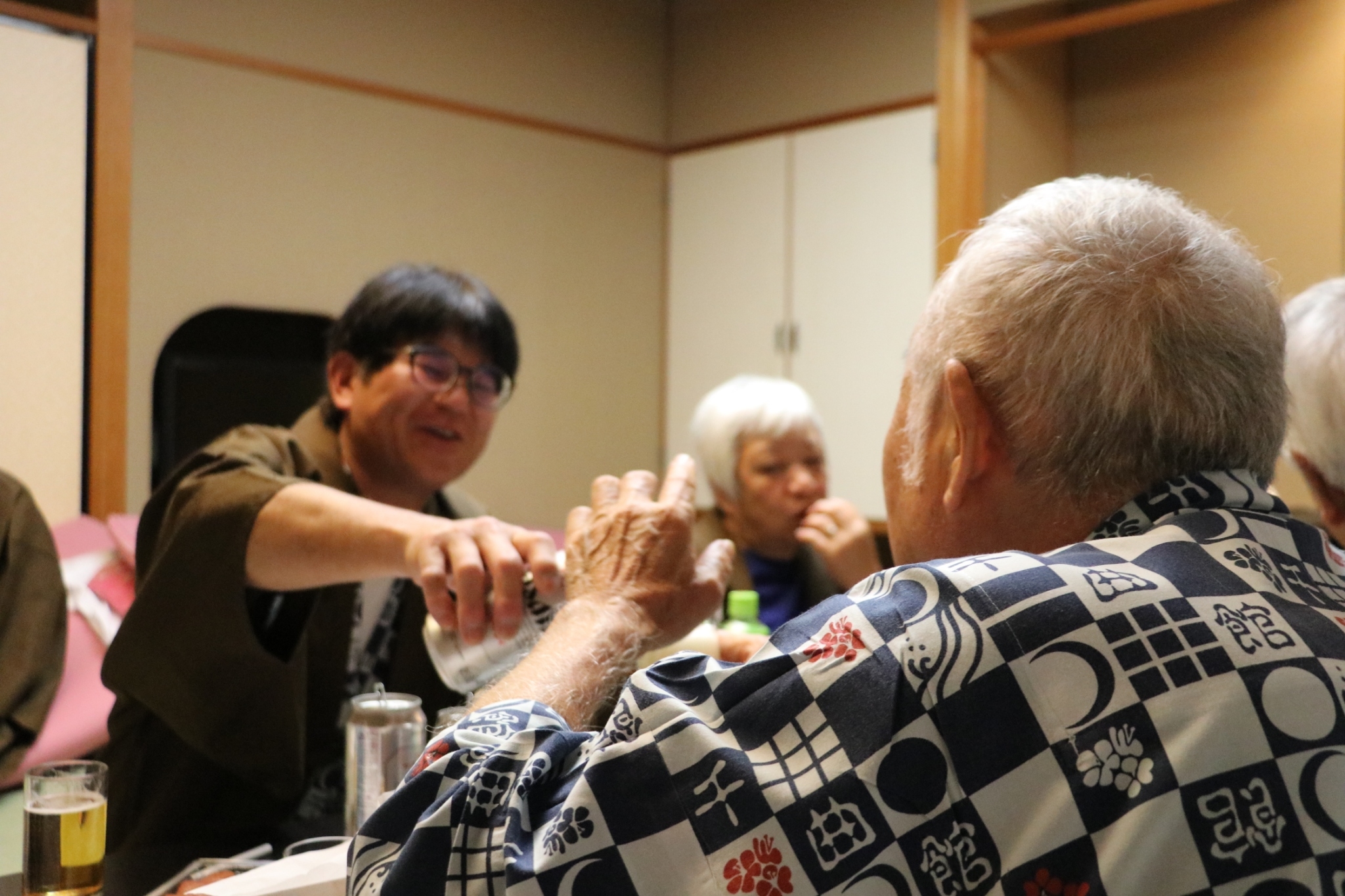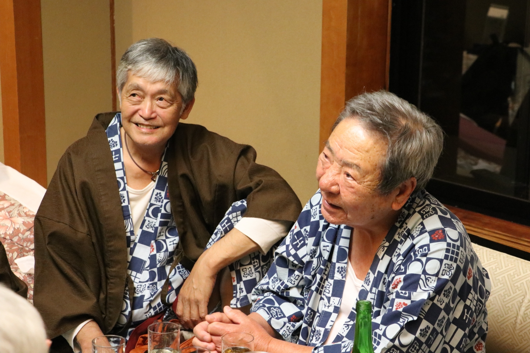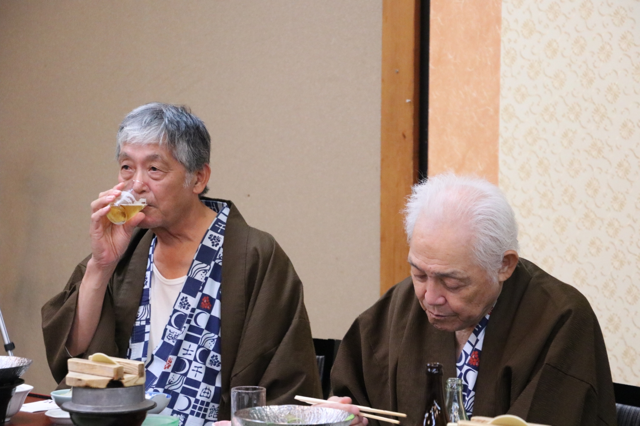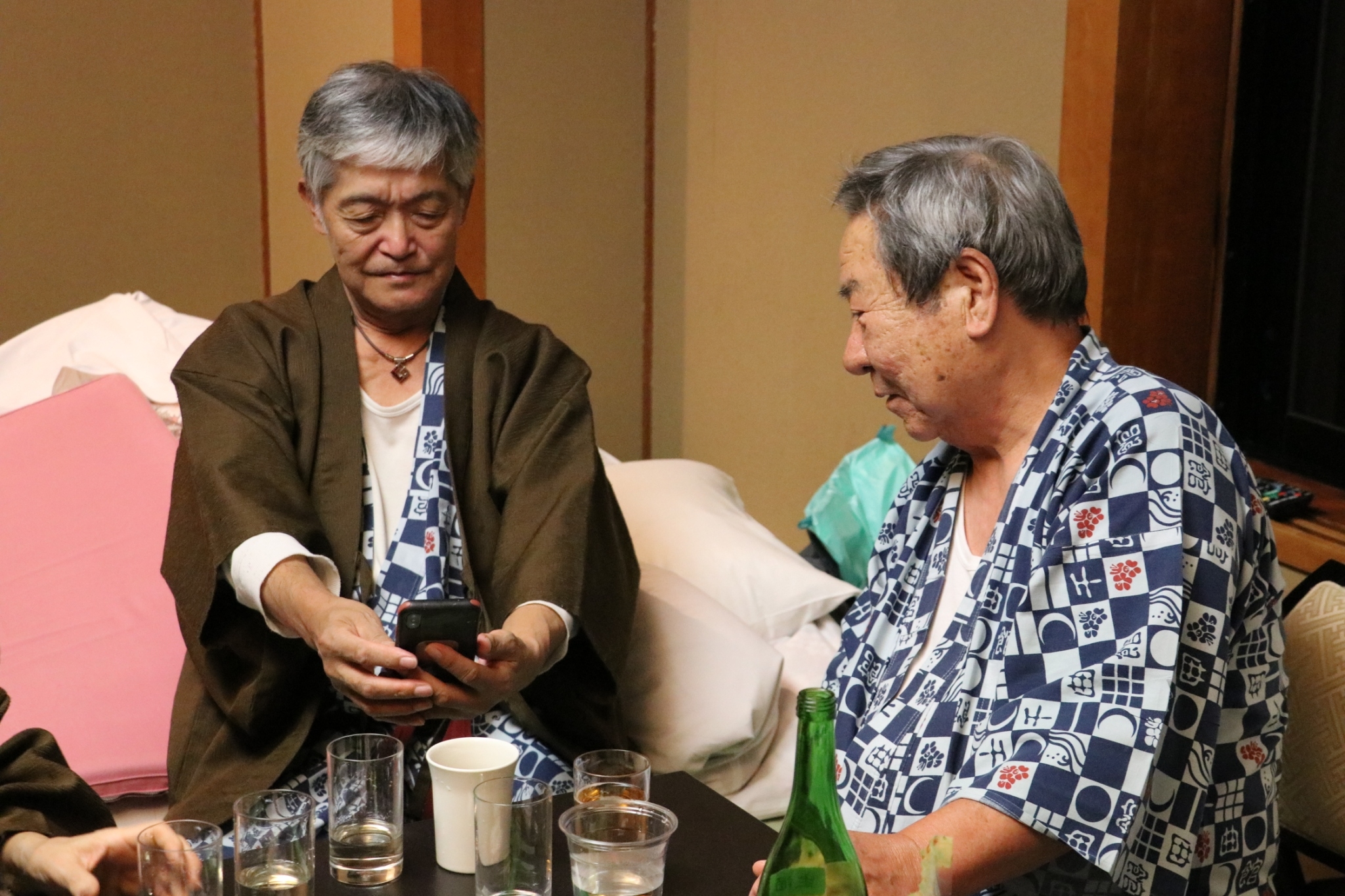 食後、輪投げについて熱く語っている輪投げ名人の2人。