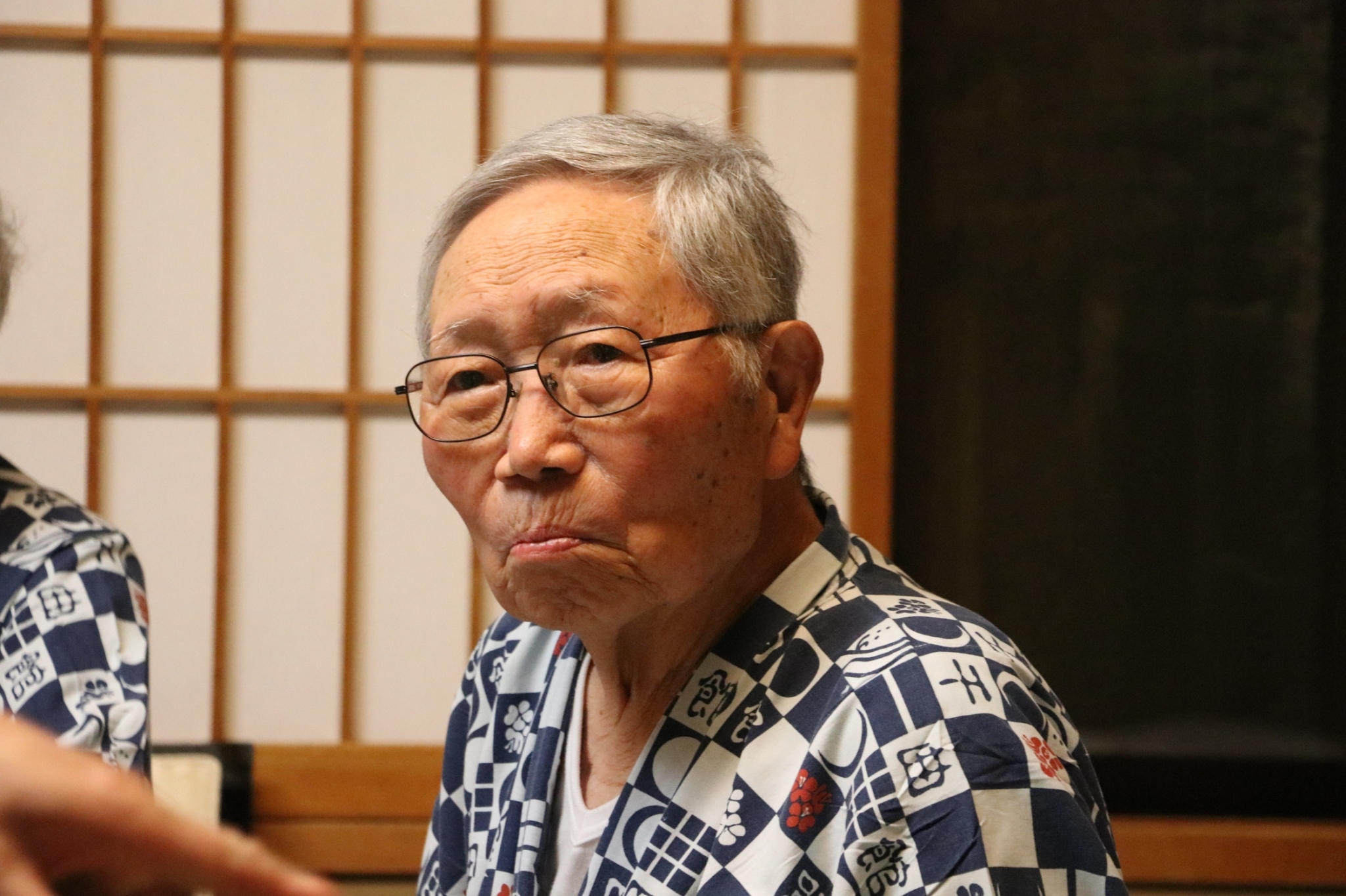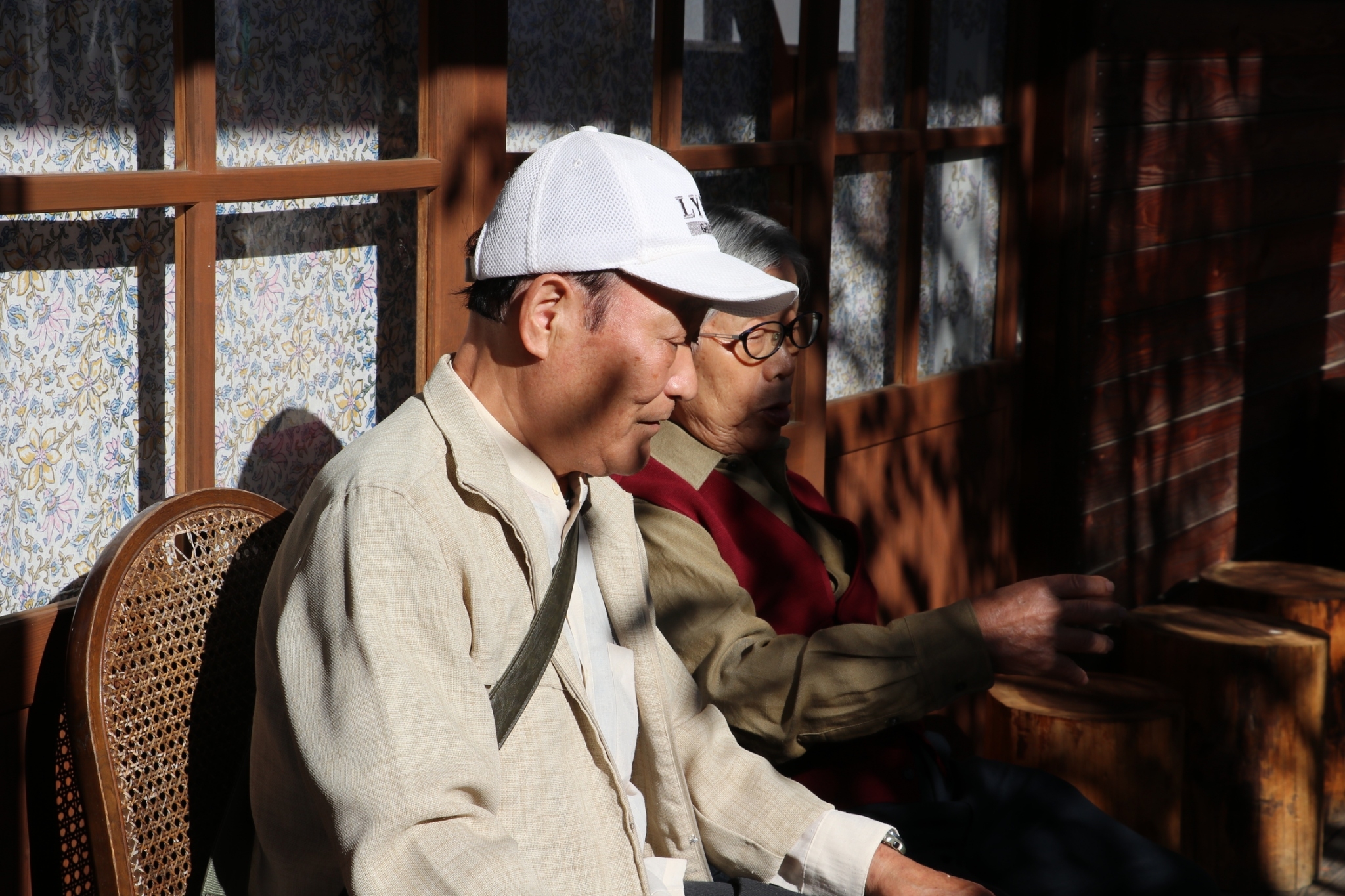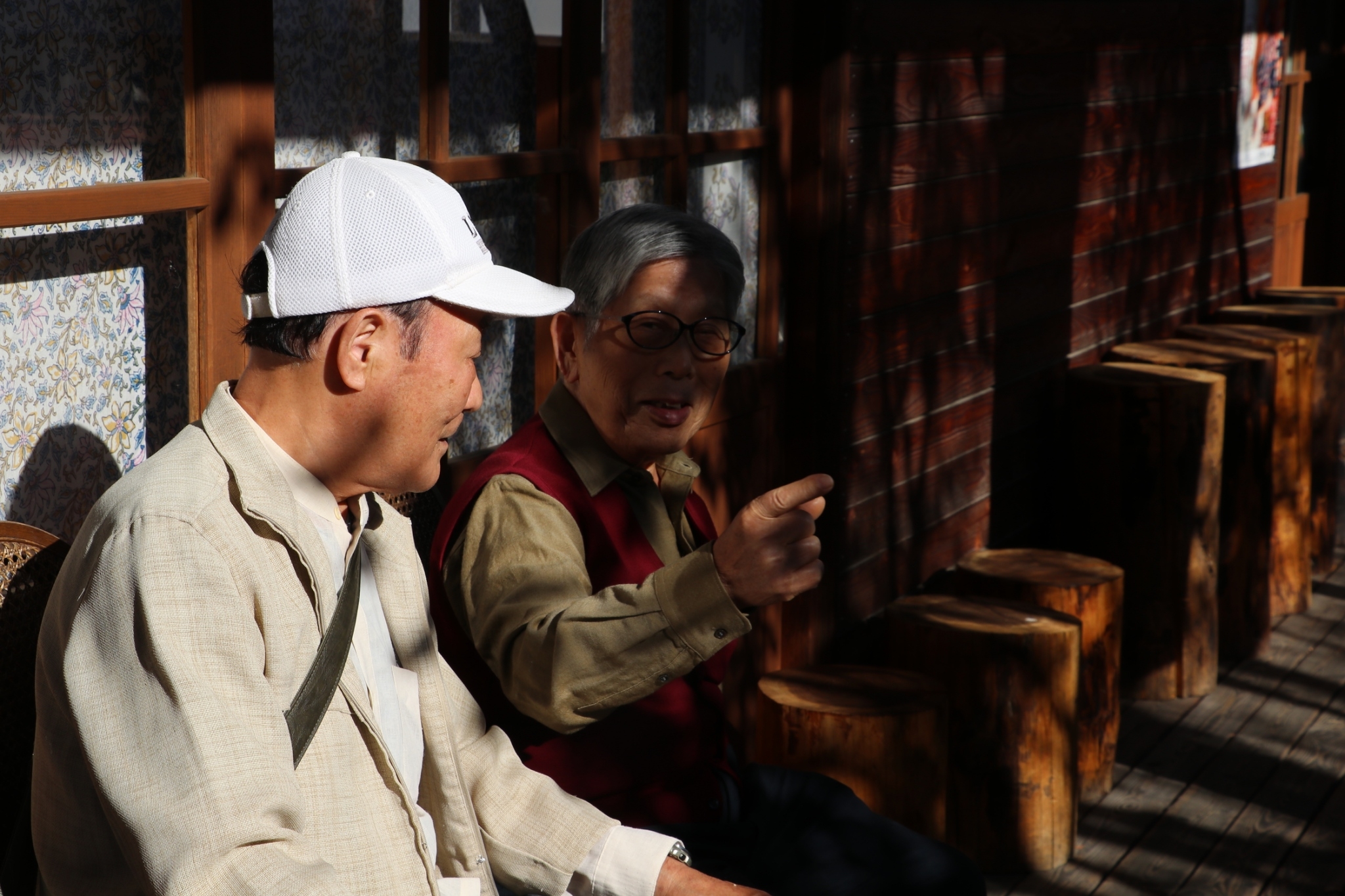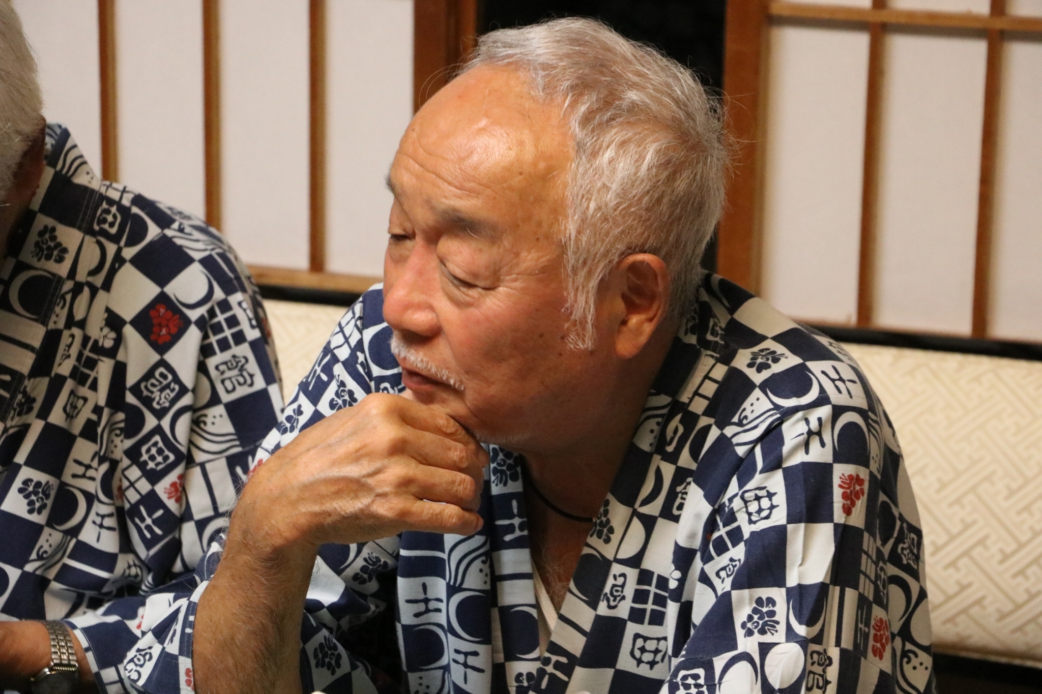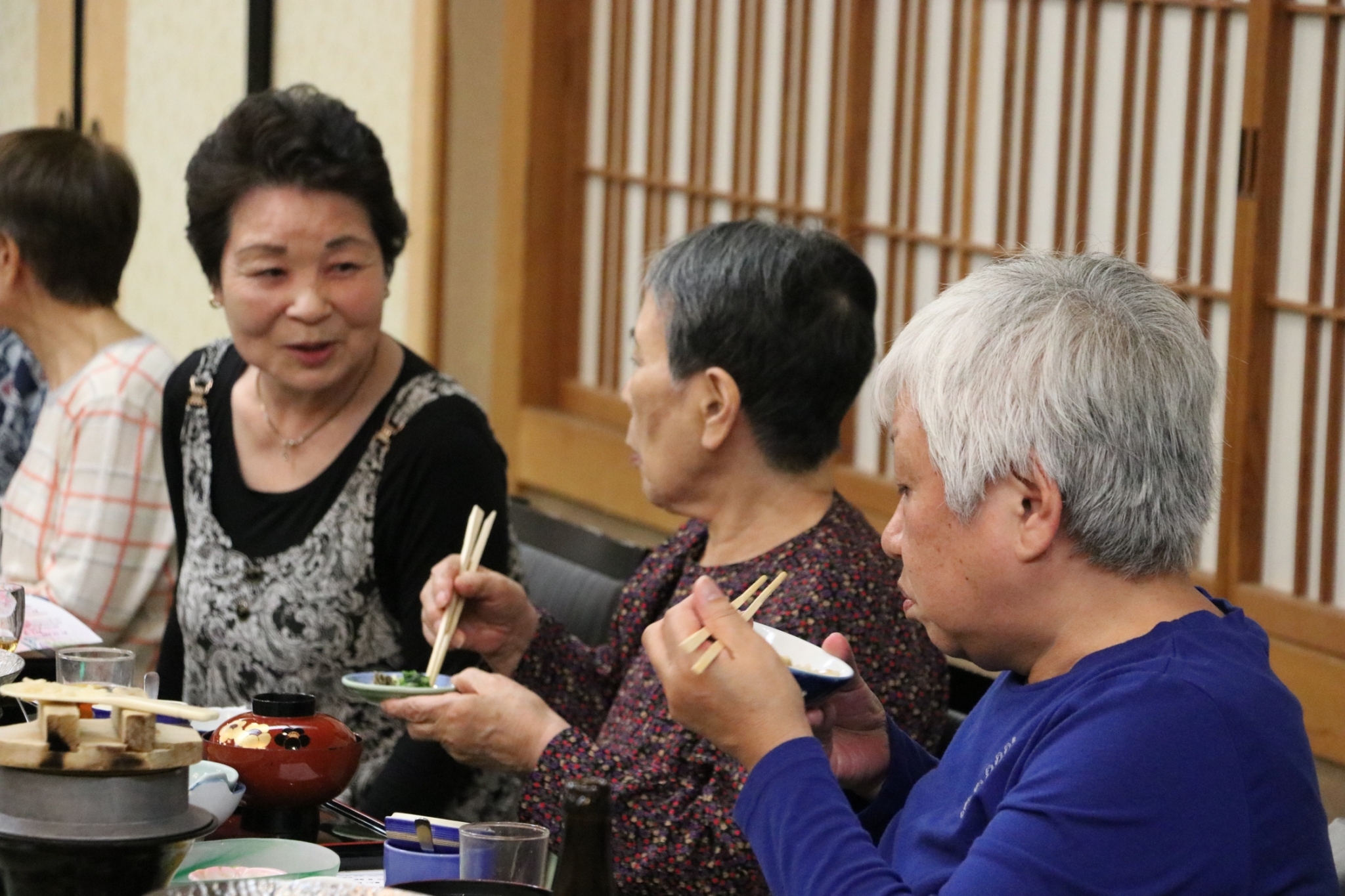 食後、輪投げについて熱く語っている輪投げ名人の2人。