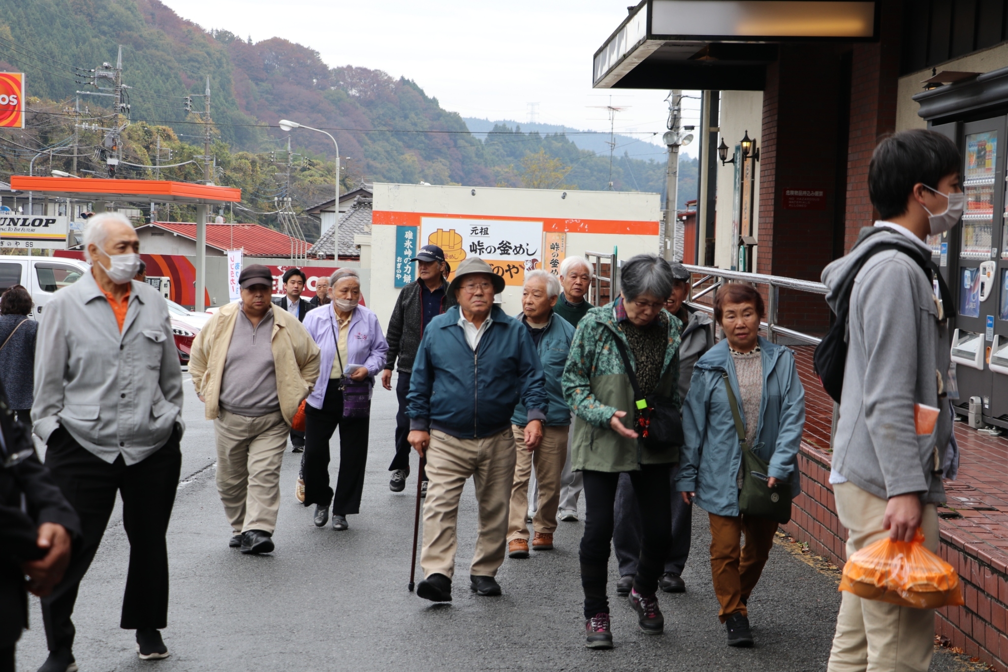 宿に到着する直前、細い路地を曲がり切れず、電信柱から出ている足場ボルトにバスが接触。ゆっくりと窓ガラスが割れていきました。一歩間違えば大惨事ですが怪我人はなく、電気屋さんの組合員さんは「足場ボルトを外しておけば良かったのに」とバス運転手さんに同情していました。