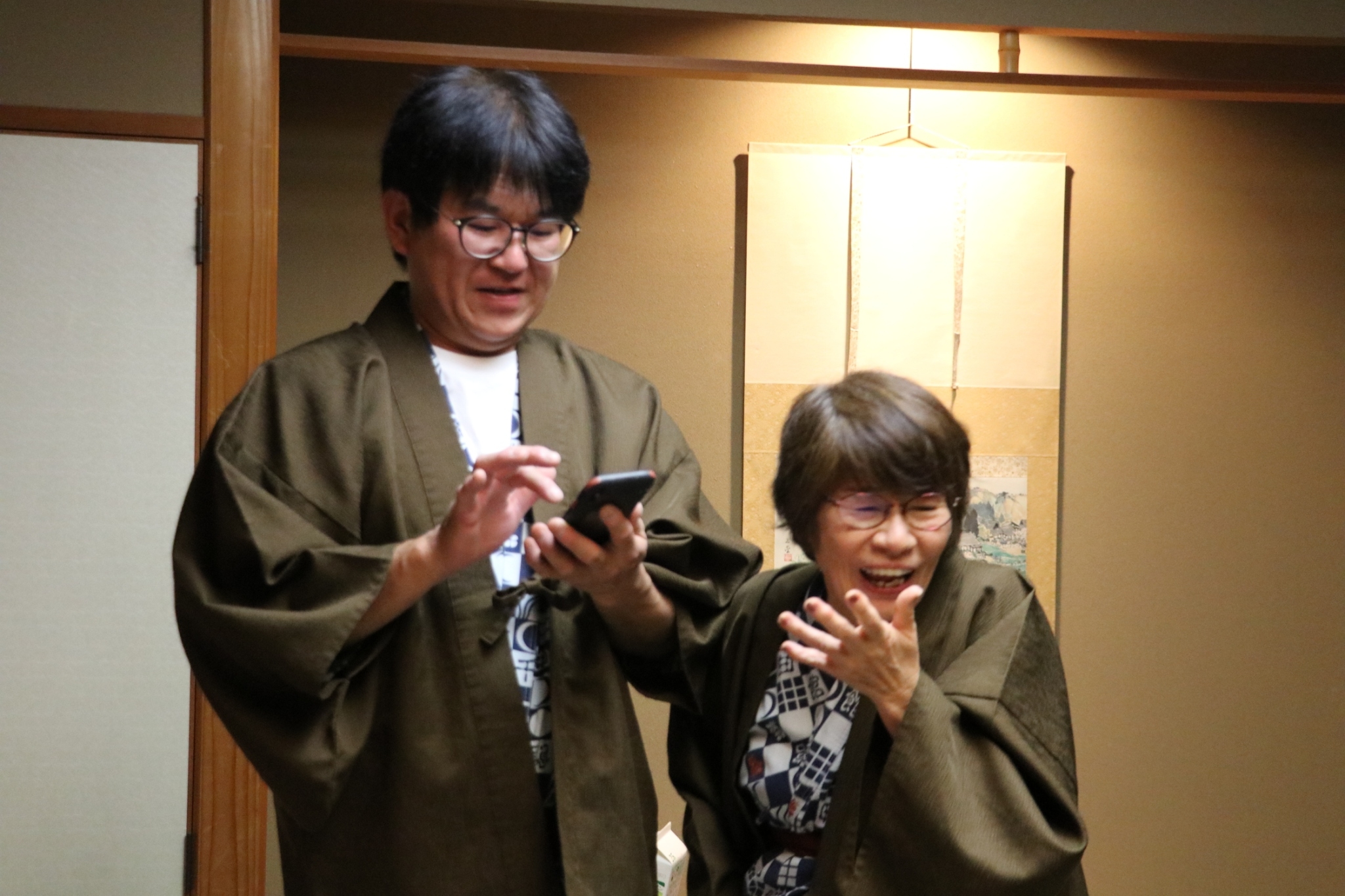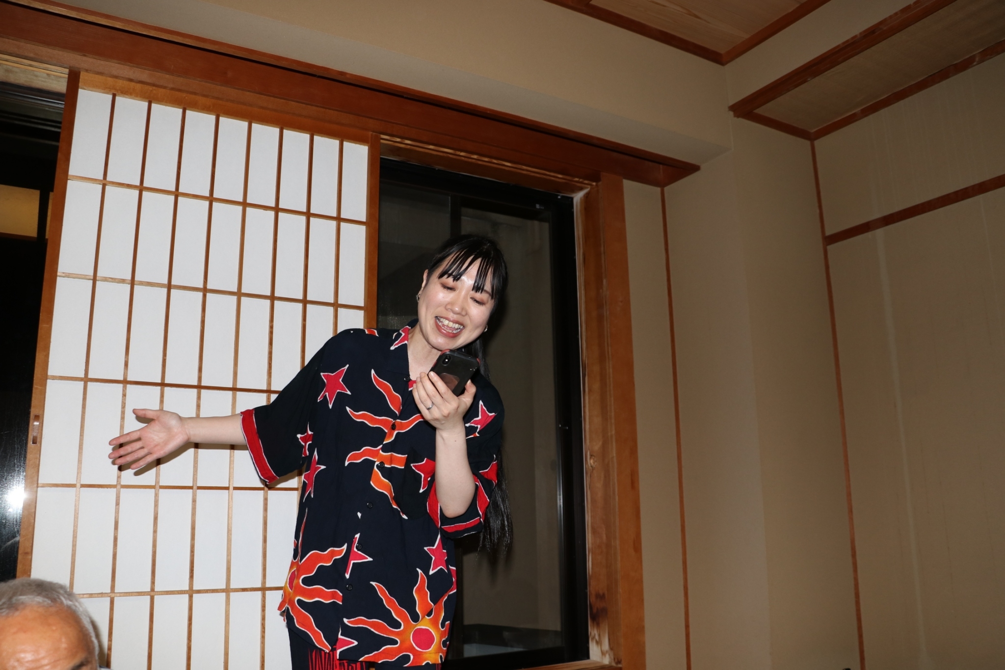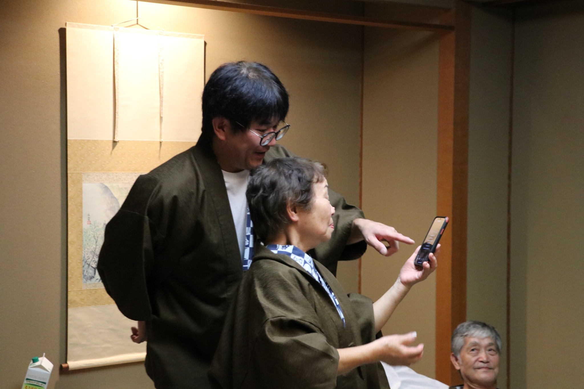 小倉委員長がケータイを駆使し、さらにアカペラでカラオケ大会。