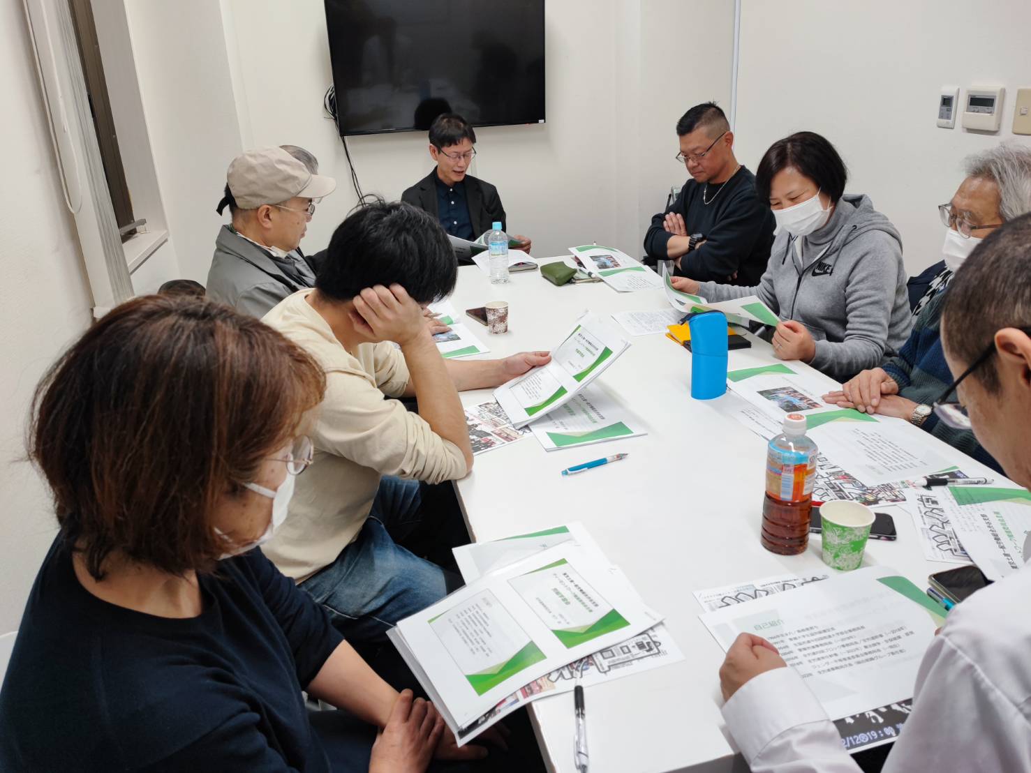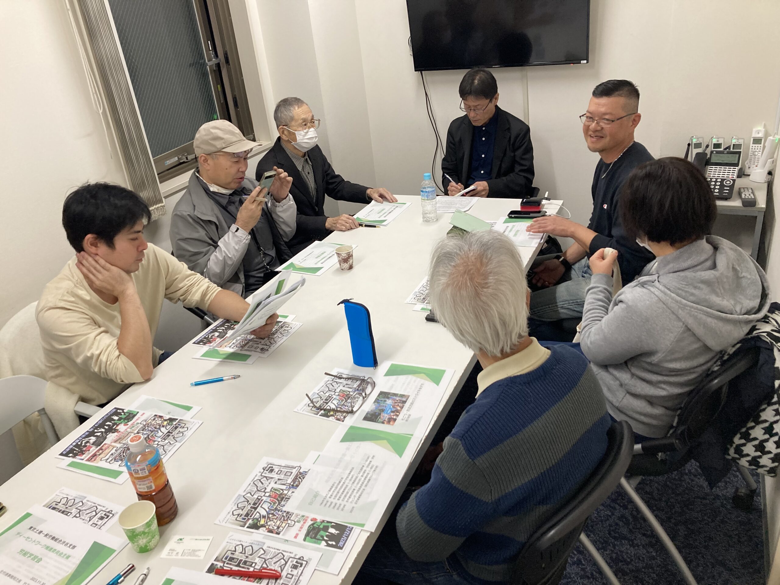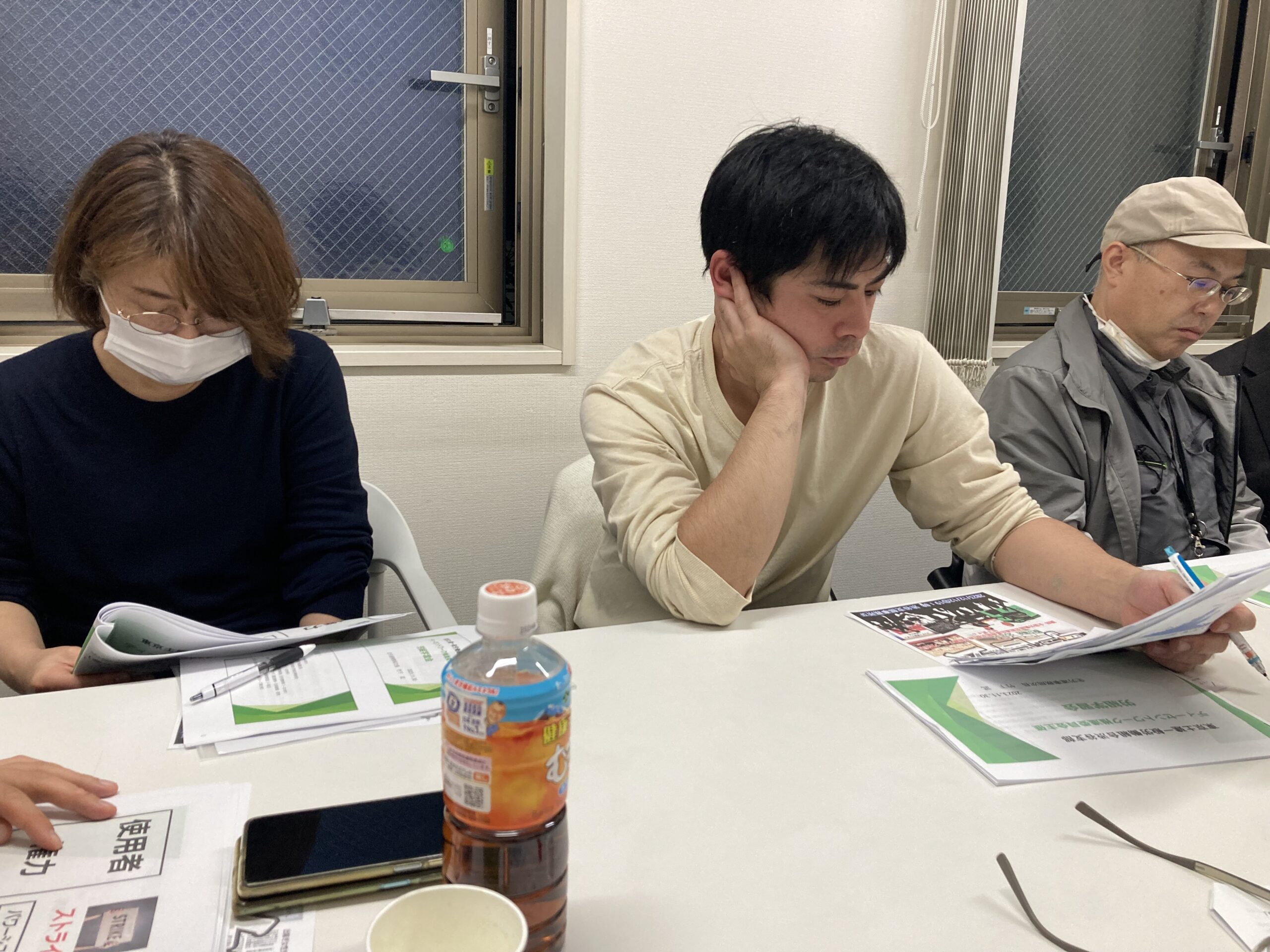 シャイな金子ディーセントワーク会長が開会挨拶を拒むので、全員の自己紹介で学習会をスタートしました。参加者の職種はとび・看板・内装・設備・防水・床工事・介護・営業とバラバラです。