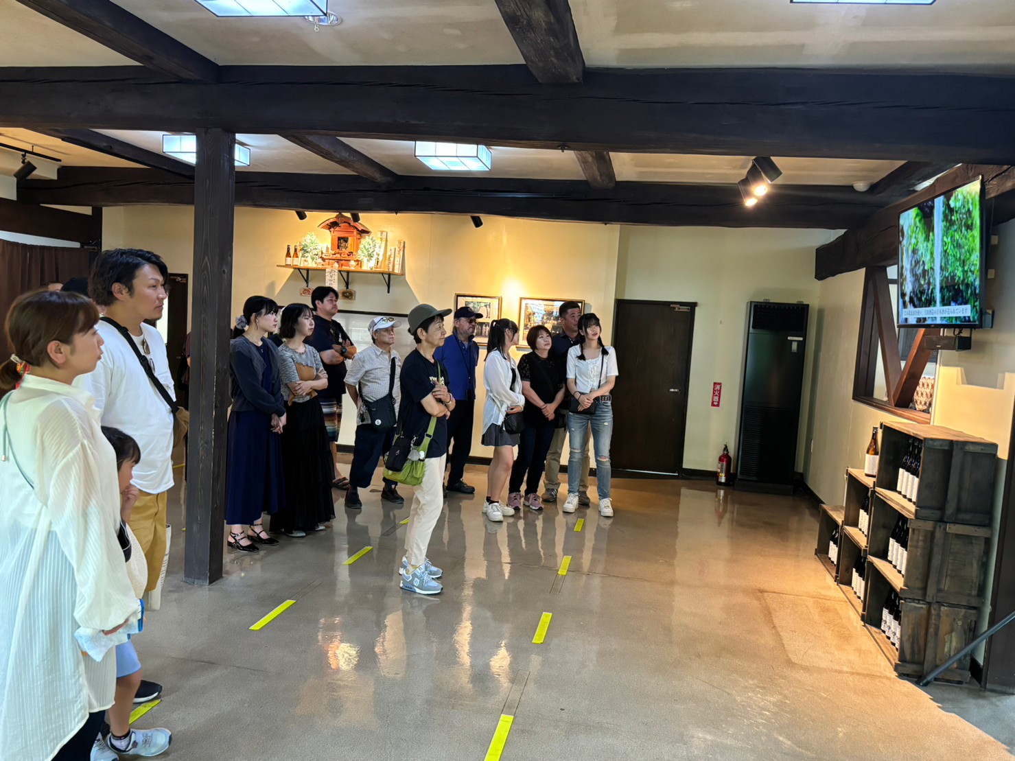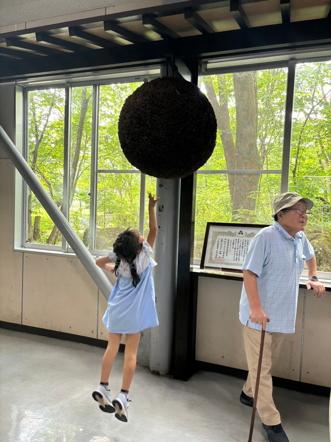 組合員さんが小学1年生のお子さんに「杉玉は始めは緑色で、新酒が出来た事を知らせるんだよ」と教えていました。