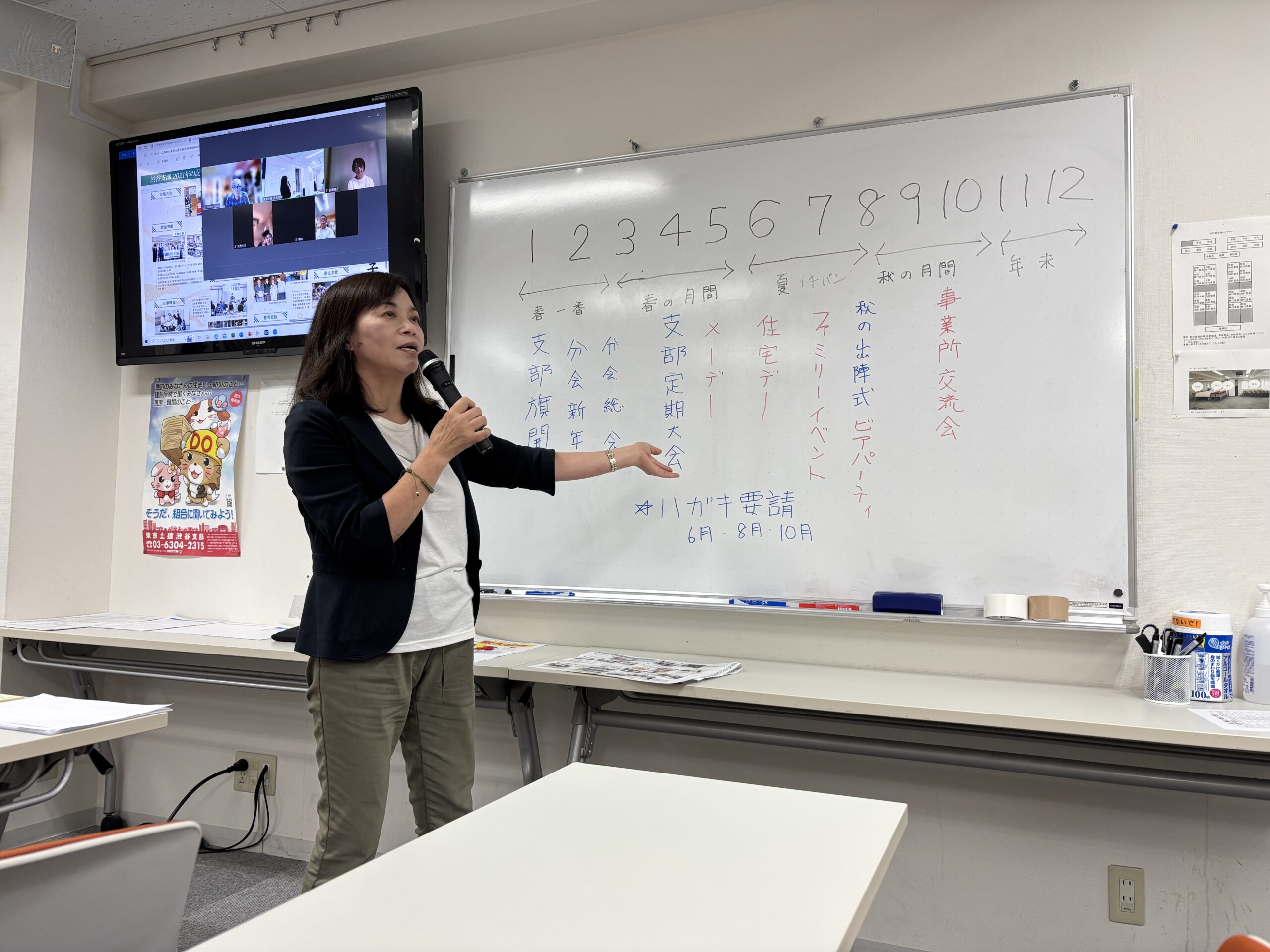 一日目は白須部長が講師をつとめ、東京土建の組織体系、分会役員の役割、各専門部の取り組みについて学びました。
