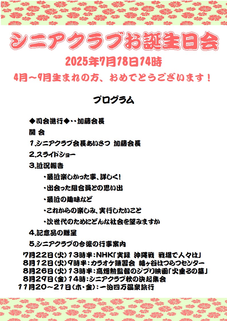 思い出せないことも増えてきたけれど、組合運動60年、まさに人生そのもの。これからもみんなと色々企画していくことが嬉しい。おそらく死ぬまでやるんだろうと思う。みなさん、誕生日おめでとう。